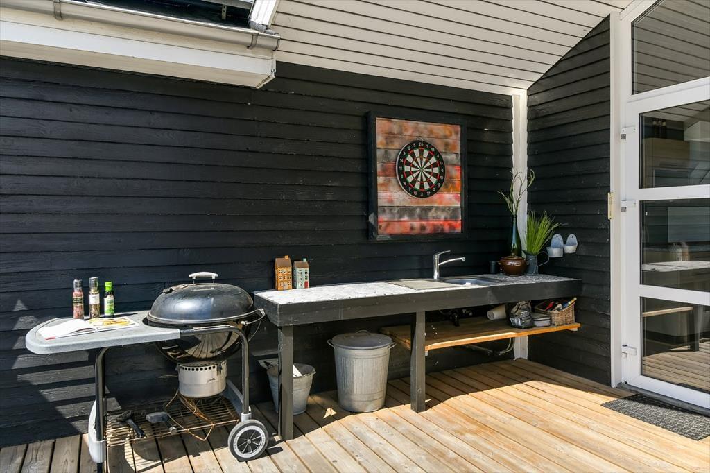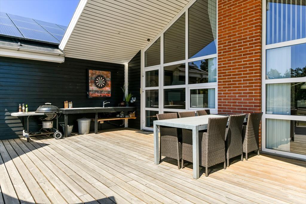 Der Indoor-Wellnessbereich ist fantastisch, aber es ist auch großartig, eine Nordische Badetonne auf der Terrasse zu haben. Wenn es nicht Zeit für ein Bad unter dem Sternenhimmel ist, sondern für Spaß und Spiel, gibt es im Freien eine Tischtennisplatte und ein Fußballtor – und außerdem eine Schaukel, eine Sandkiste und ein Trampolin für die jüngsten Feriengäste. Der nach Süden ausgerichtete Terrassenbereich wird ein Hit sein, wenn die Sonne scheint, und dank der Außenküche werden die Grillabende noch besser. Das Haus ist mit Sonnenkollektoren ausgestattet, die für den Betrieb des Hauses genutzt werden, wodurch die Kosten für den Stromverbrauch minimiert werden.