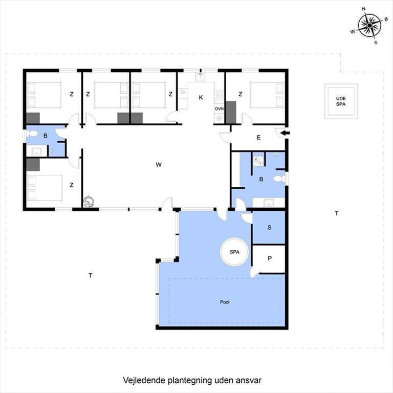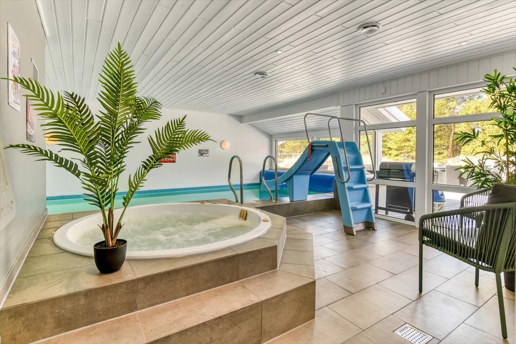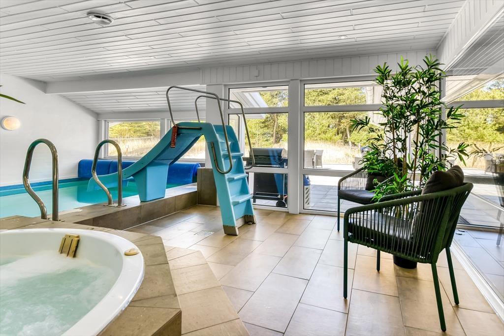 Dieses Ferienhaus gehört zu den Exemplaren, in dem du dich vom ersten Moment an heimisch fühlst. Der Aufenthaltsbereich, die fünf Schlafräume und die beiden Badezimmer sind in hellen Farbtönen gehalten - unterbrochen lediglich von einigen warmen Farbtupfern. Die Küche fügt sich offen in den Wohnraum ein, sodass du selbst während der Zubereitung der Mahlzeiten oder während des Kuchenbackens an den Gesprächen im Wohnraum teilnehmen kannst. Vom Wohnraum blickst du durch Fenster in den Wellnessbereich des Hauses, in dem sich Groß und Klein im Pool vergnügen, planschen und rutschen können. Falls du es lieber ein wenig beschaulicher magst, werden dich der Whirlpool und die Sauna begeistern, in denen du traumhaft entspannte Momente genießt.