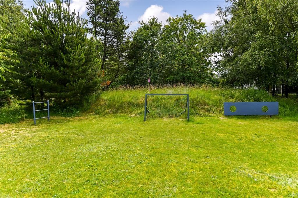 An die Südseite des Ferienhauses schmiegt sich eine große, teilweise überdachte Holzterrasse, vor der sich der Garten erstreckt. Holzumrandungen spenden Windschutz und schirmen das sonnige Aufenthaltsareal ab. Gleichzeitig genießt du einen schönen Blick auf die Grasfläche und auf die Spielgeräte. Während die Kinder vergnügt schaukeln, rutschen und Ball spielen, kannst du ihnen in aller Ruhe vom Gartenstuhl aus zusehen. Zwischen den Bäumen wirst du mit deiner gesamten Familie gern die Kugeln auf der hauseigenen Bocciabahn schwingen. Alternativ könnte das ein oder andere familieninterne Krocketturnier im heimischen Garten für viel Spaß und Abwechslung sorgen.