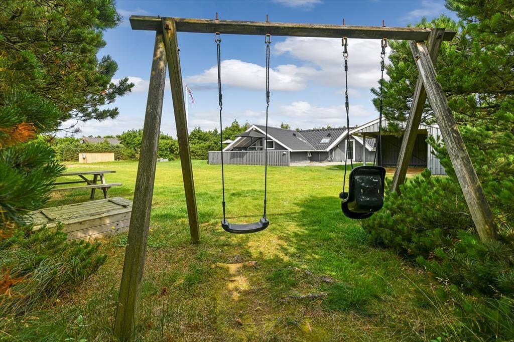 Die Außenareale deines Ferienhauses werden durch Nadelbäume gut vom Weg und von den Nachbarn abgeschirmt. Die Grasfläche animiert garantiert nicht nur deine Kinder zum Ballspielen und Umhertollen. Für die Kleinsten steht eine Schaukel bereit. Falls du nicht gerade ausgelassen mit deinen Kindern spielst, machst du es dir am besten mit einem frischen Kaffee oder einem kühlen Getränk auf der Terrasse gemütlich. Die Terrasse ist groß, teilweise überdacht und verwöhnt mit mehreren sonnenverwöhnten Aufenthaltsplätzen.