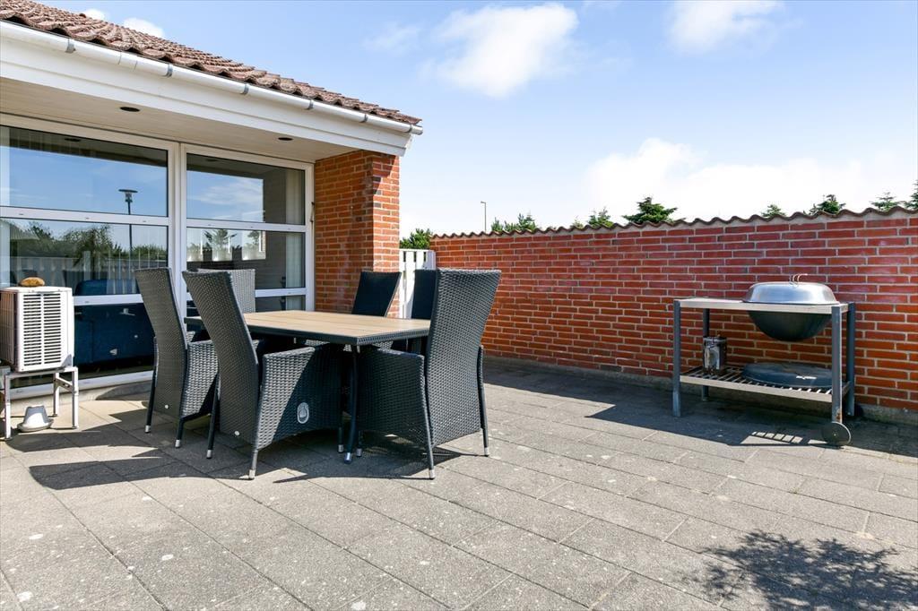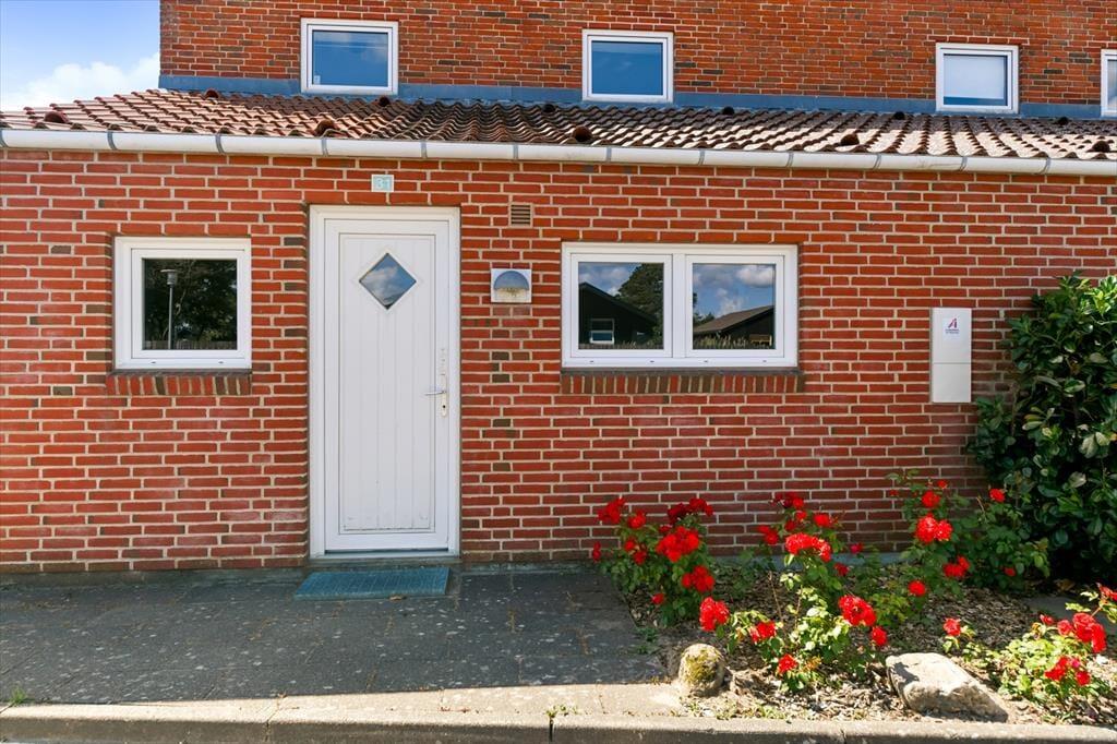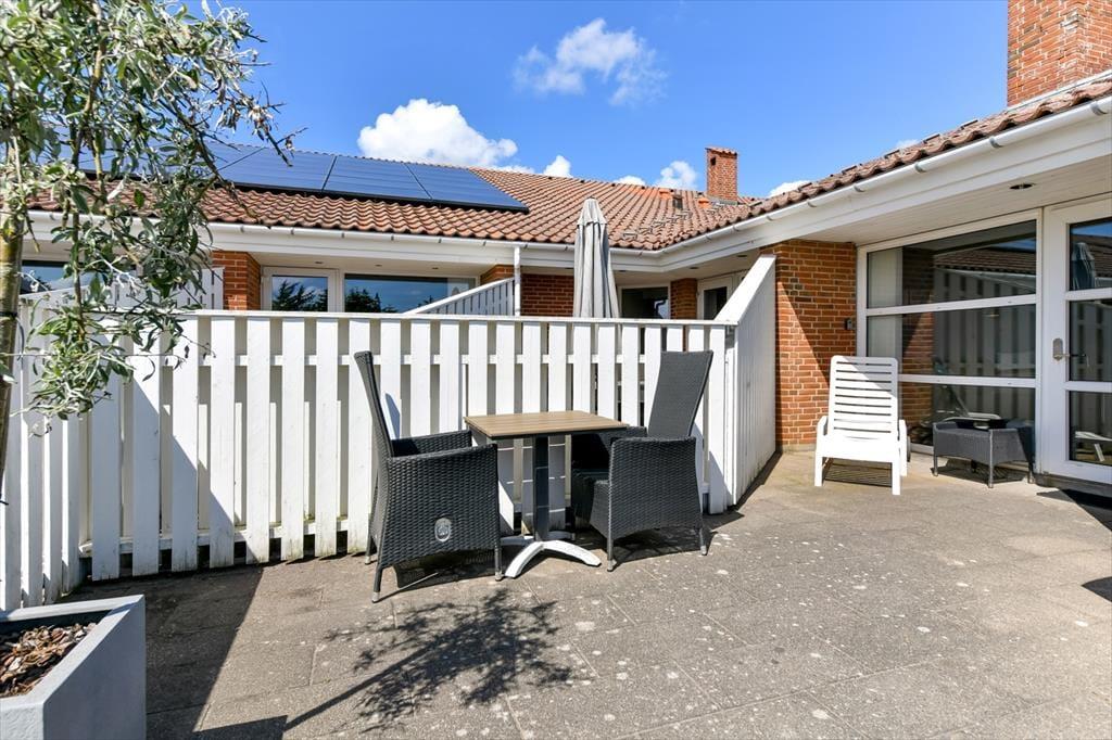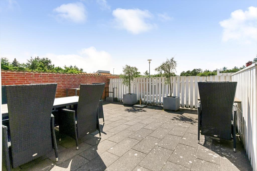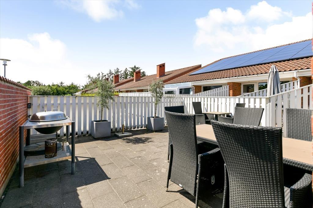 Im Anschluss an das Wohnzimmer befindet sich eine schöne Terrasse, die sowohl nach Süden als auch nach Westen Sonne abbekommt, und hier kannst du dich völlig zurücklehnen und das Wohlbefinden eines Sommerhausurlaubs spüren. Die Terrasse ist komplett mit Zaun und Mauerwerk geschlossen, sodass die Außenbereiche gut abgeschirmt sind – und es ist auch angenehm, einen abgeschlossenen Bereich im Freien zu haben, wenn du kleine Kinder dabeihast. Die jüngsten Feriengäste werden sich vielleicht auch über die Spielgeräte freuen, die sich auf der Grünfläche rund um die Siedlung befinden. Ein großer Parkplatz liegt zur Straße hin, was es einfach macht, das Auto in der Nähe der Haustür abzustellen.