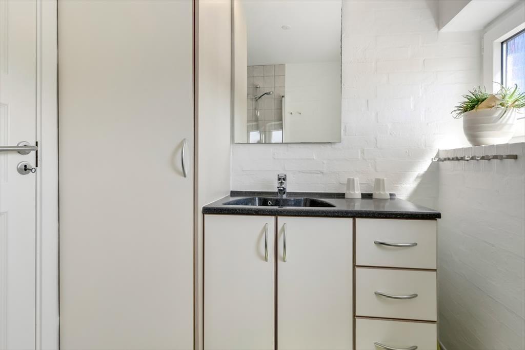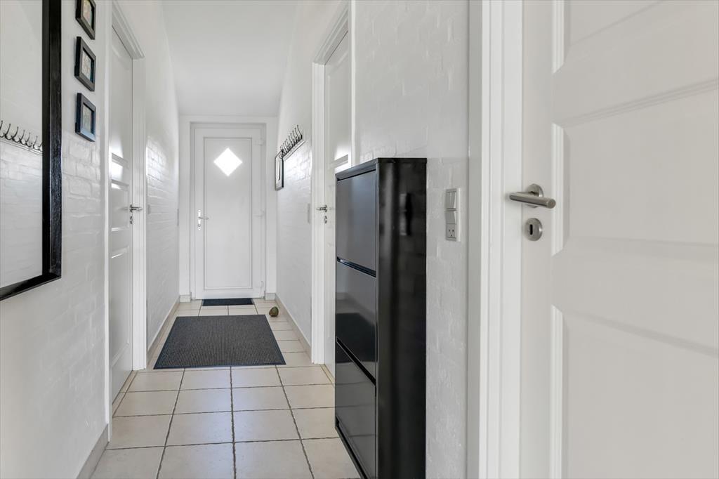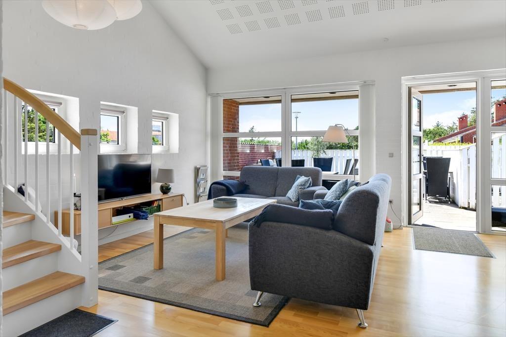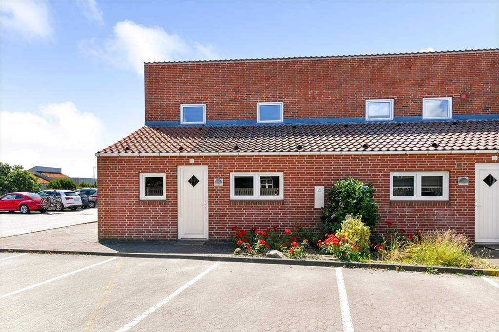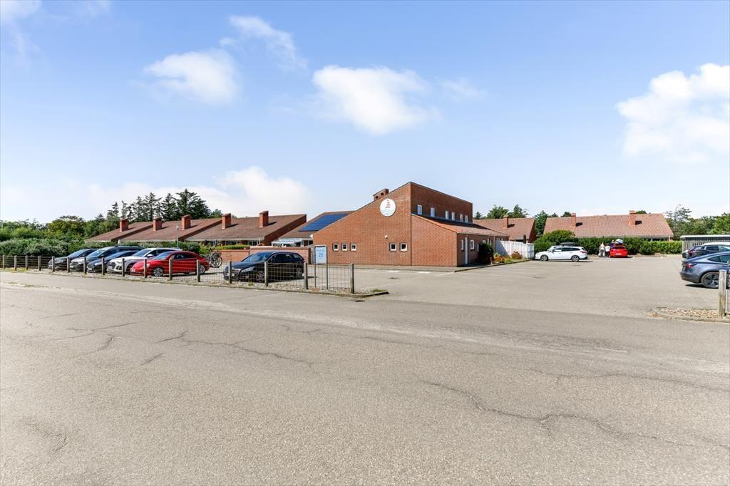Im Anschluss an das Wohnzimmer befindet sich eine schöne Terrasse, die sowohl nach Süden als auch nach Westen Sonne abbekommt, und hier kannst du dich völlig zurücklehnen und das Wohlbefinden eines Sommerhausurlaubs spüren. Die Terrasse ist komplett mit Zaun und Mauerwerk geschlossen, sodass die Außenbereiche gut abgeschirmt sind – und es ist auch angenehm, einen abgeschlossenen Bereich im Freien zu haben, wenn du kleine Kinder dabeihast. Die jüngsten Feriengäste werden sich vielleicht auch über die Spielgeräte freuen, die sich auf der Grünfläche rund um die Siedlung befinden. Ein großer Parkplatz liegt zur Straße hin, was es einfach macht, das Auto in der Nähe der Haustür abzustellen.