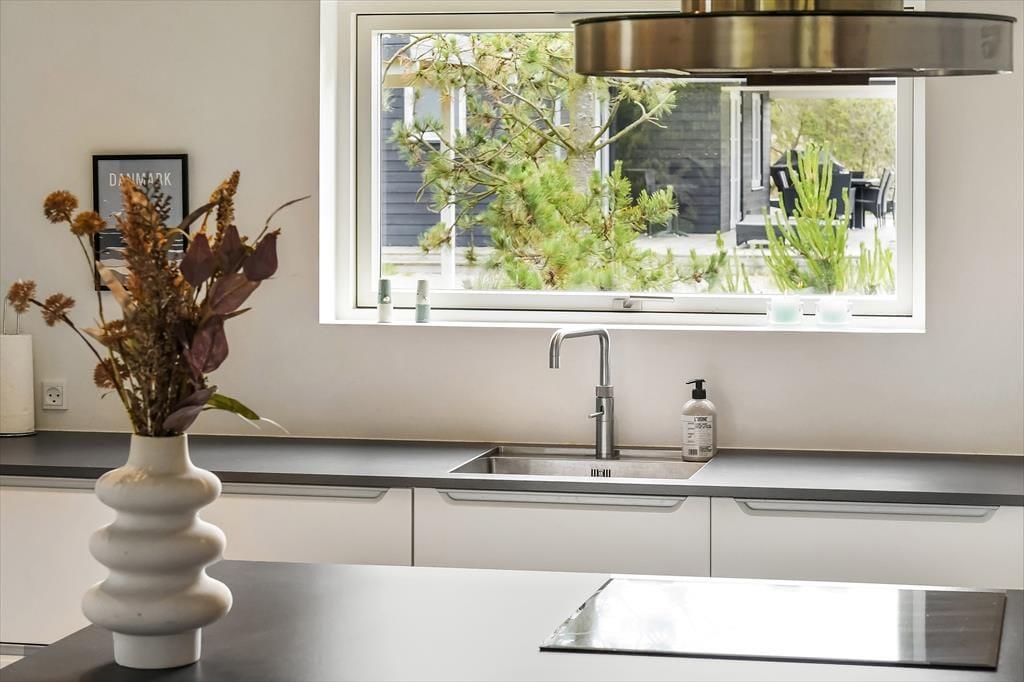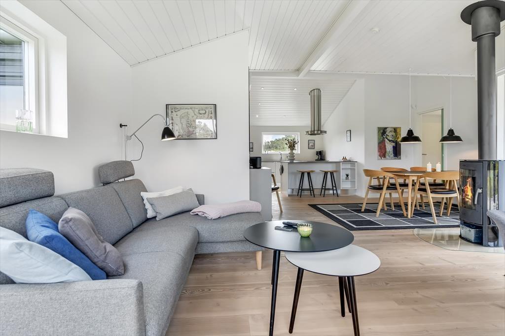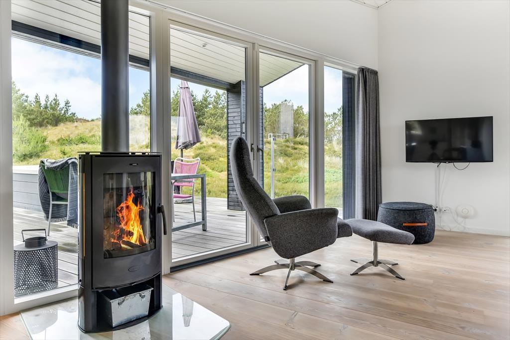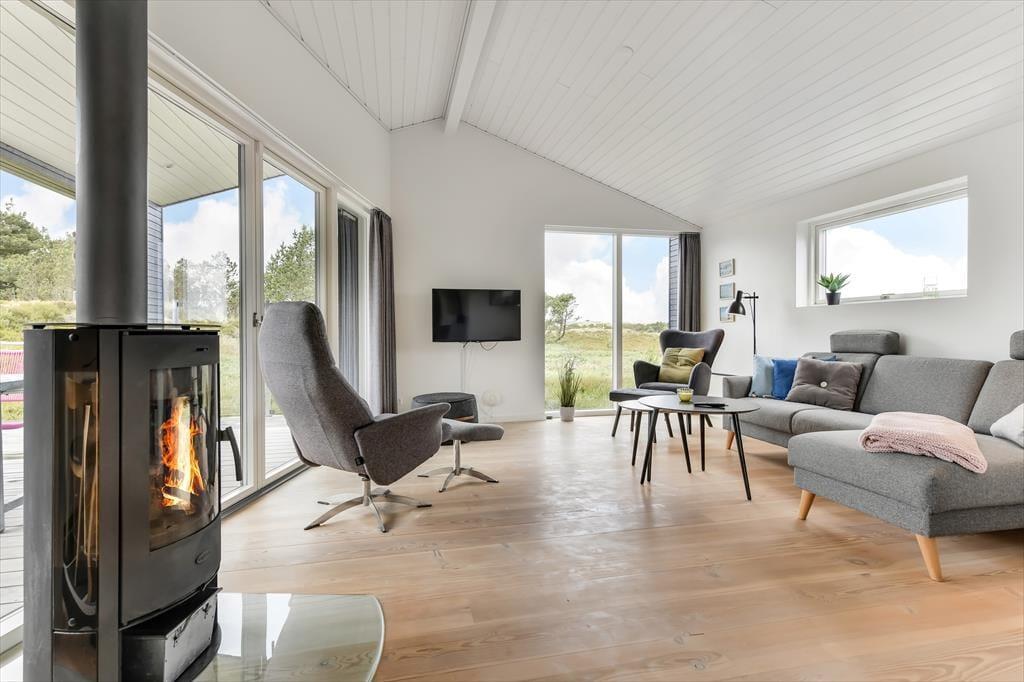 Dieses moderne Ferienhaus aus dem Jahr 2017 eignet sich hervorragend für erholsame Urlaubstage in beschaulichem Tempo. In den hellen und einladenden Räumlichkeiten kannst du dich nach Herzenslust ausschlafen, entspannende Duschbäder genießen und deiner Kreativität beim Kochen freien Lauf lassen. Deine Urlaubstage verbringst du auf Wunsch mit geselligen Spielrunden, mit deinem Strickzeug und dicken Büchern. An kühlen Tagen und Abenden heizt du den Kaminofen an und machst es dir auf dem Sofa im Wohnraum oder auf einem der komfortablen Lehnstühle gemütlich. Nicht nur im Wohnraum, sondern auch in den Schlafräumen, kommst du in den Genuss einer atemberaubend schönen Aussicht, die das angenehme Gefühl von Ruhe und Frieden unterstreicht - perfekt, um neue Energien für den oft hektischen Alltag zu schöpfen.