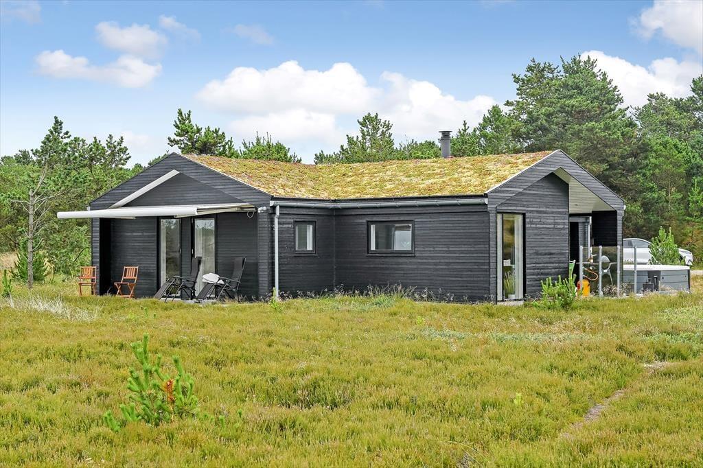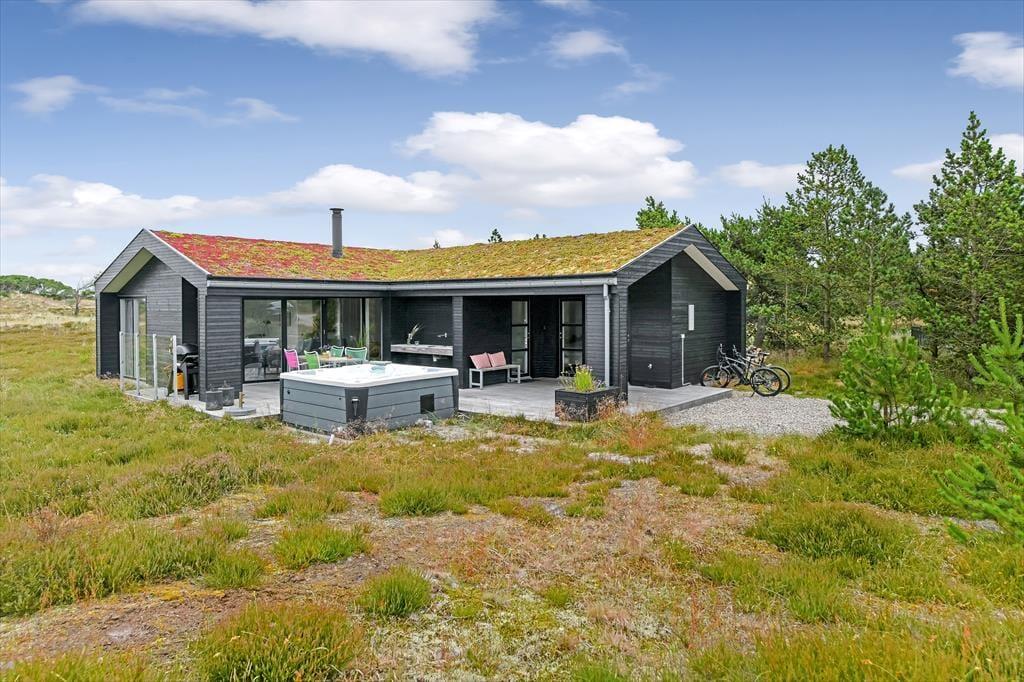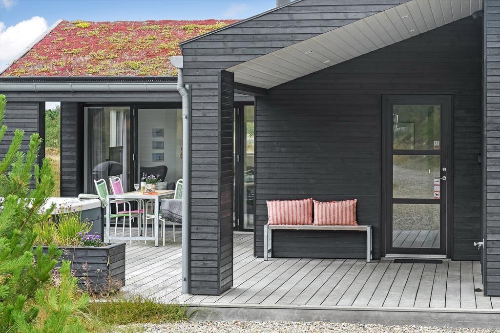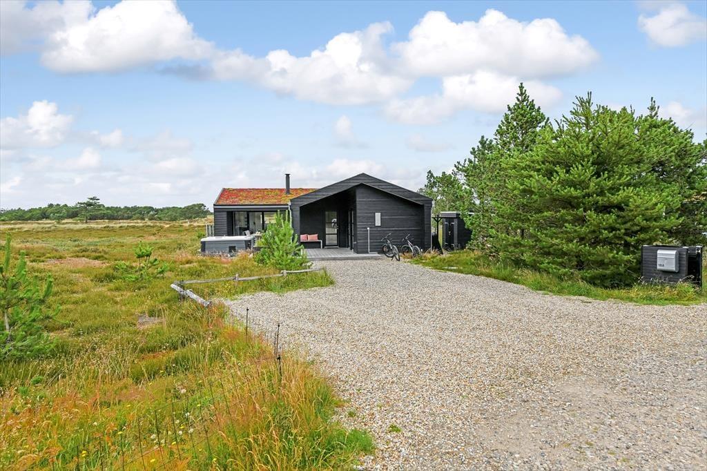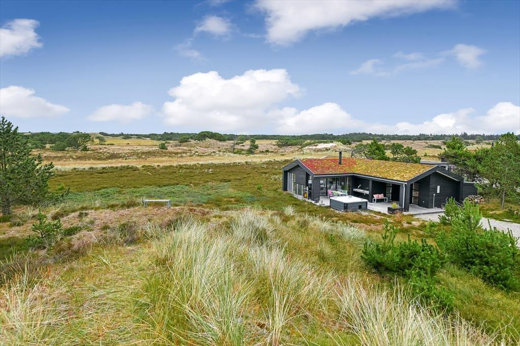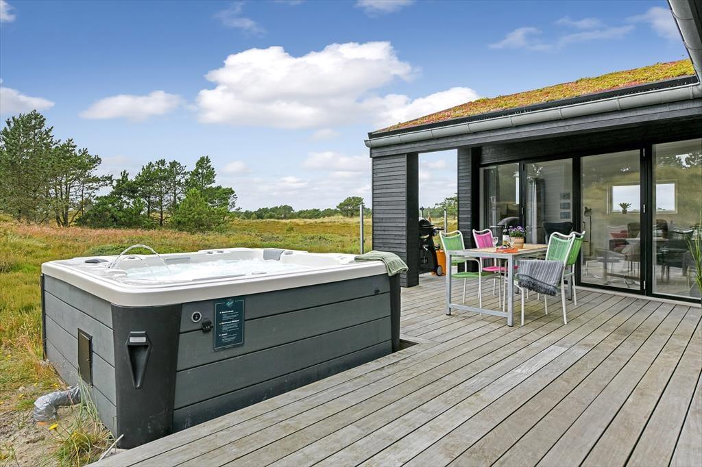 Das Ferienhaus liegt mitten auf einem großen Grundstück, das durch einen hübschen Heideteppich und anderen naturbelassenen Bewuchs geziert wird. Gen Norden erstreckt sich die Dünenheide - ein Ausblick, an dem du dich nie sattsehen wirst, ganz gleich, ob du es dir auf einem Gartenstuhl, auf der Aussichtsbank oder im Outdoor-Whirlpool gemütlich machst. Die singenden Vögel in den Baumkronen und der Duft der Heide wecken deine Sinne. Selbst wenn sich die Dämmerung über Blåvand senkt, ist es einfach herrlich, sich draußen in friedvoller Umgebung aufzuhalten - eventuell auf einem der überdachten Terrassenbereiche, die sich abends als stimmungsvolle Rückzugsorte erweisen.