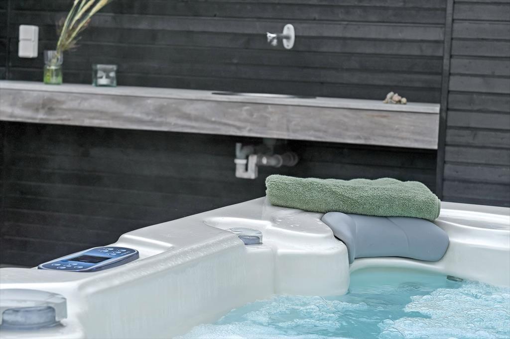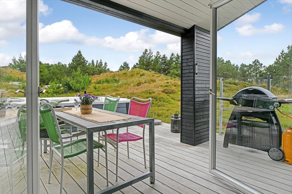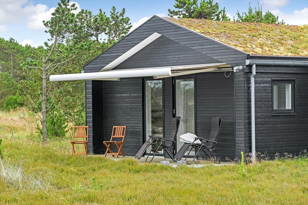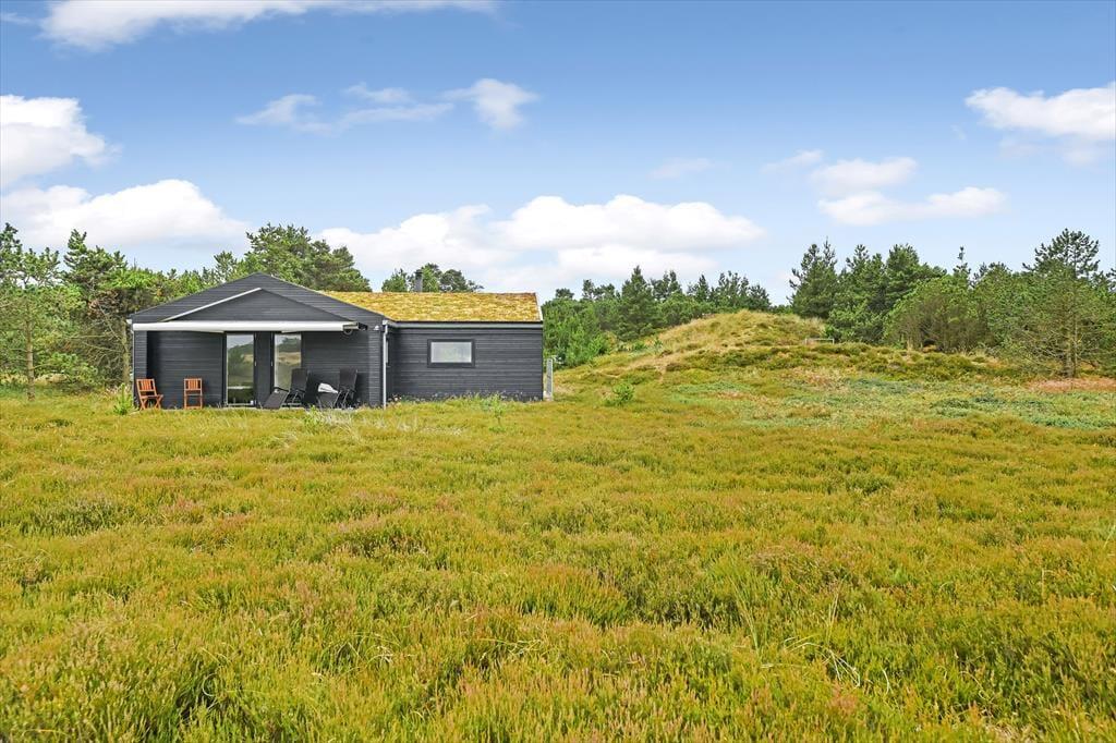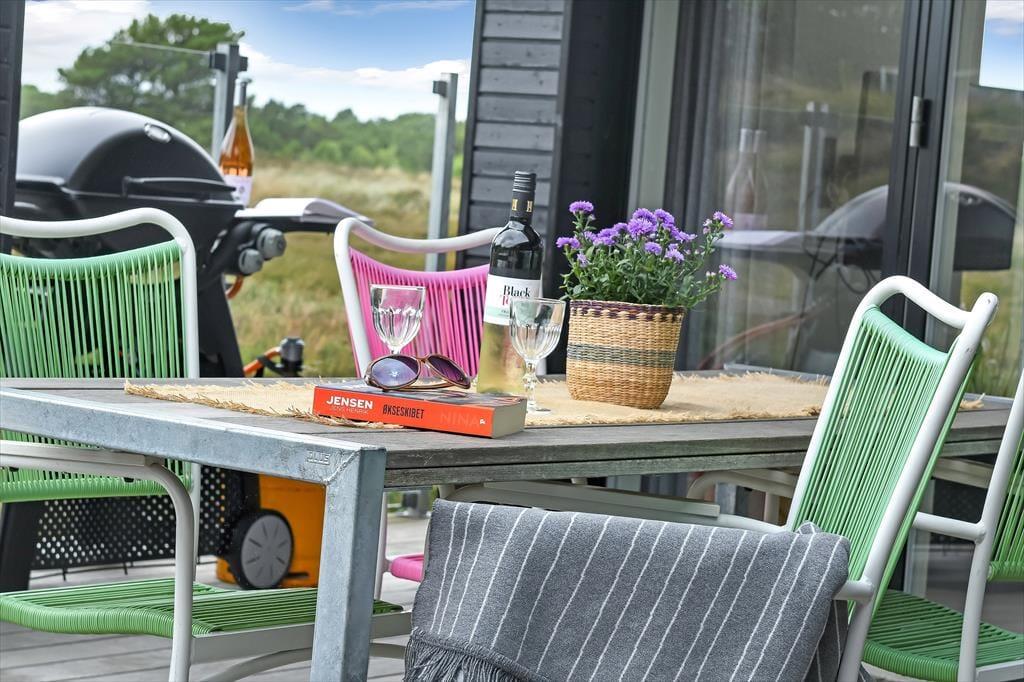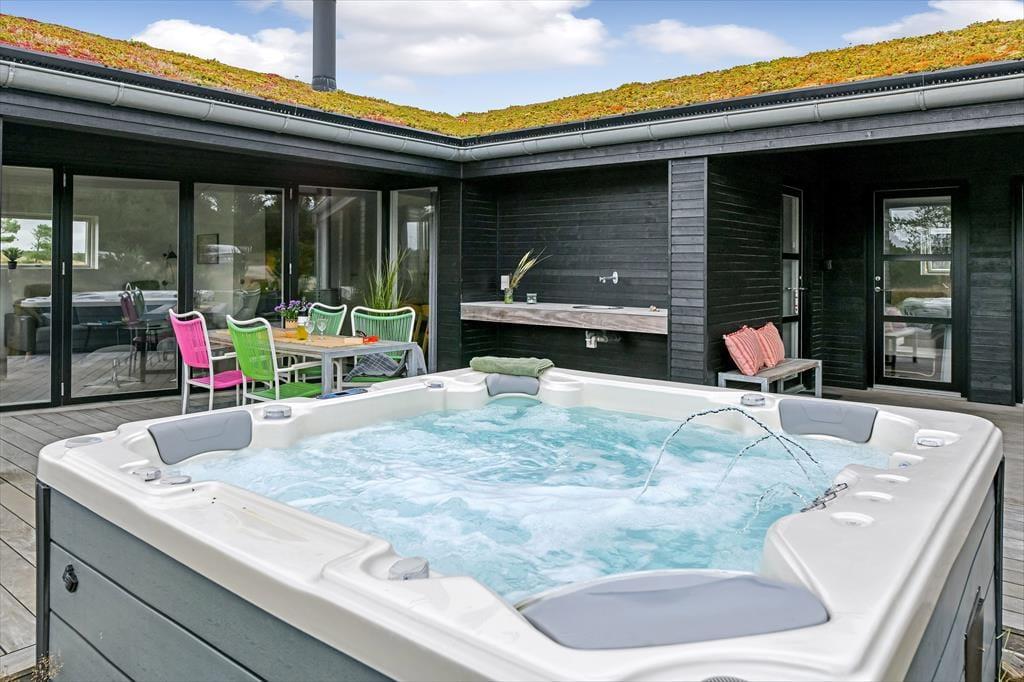Das Ferienhaus liegt mitten auf einem großen Grundstück, das durch einen hübschen Heideteppich und anderen naturbelassenen Bewuchs geziert wird. Gen Norden erstreckt sich die Dünenheide - ein Ausblick, an dem du dich nie sattsehen wirst, ganz gleich, ob du es dir auf einem Gartenstuhl, auf der Aussichtsbank oder im Outdoor-Whirlpool gemütlich machst. Die singenden Vögel in den Baumkronen und der Duft der Heide wecken deine Sinne. Selbst wenn sich die Dämmerung über Blåvand senkt, ist es einfach herrlich, sich draußen in friedvoller Umgebung aufzuhalten - eventuell auf einem der überdachten Terrassenbereiche, die sich abends als stimmungsvolle Rückzugsorte erweisen.