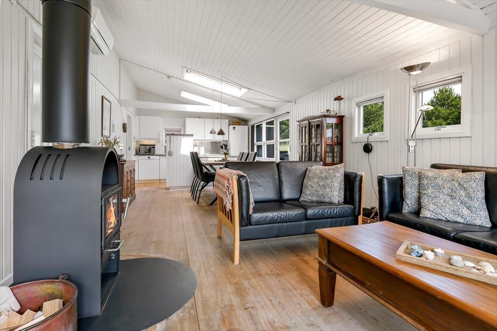 Dieses Ferienhaus zählt zu den schönen Mietobjekten, in denen dich unmittelbar nach dem ersten Betreten das Gefühl von Ruhe und Entspannung überkommt. Wohnraum und Küche bilden eine offen verbundene Einheit. Gemütliche Stunden verlebst du beim Lesen und beim Lösen von Kreuzworträtseln in der Polstersitzgruppe ebenso, wie beim Zubereiten der Mahlzeiten und beim anschließenden gemeinsamen Essen am Esstisch. An kalten Tagen sorgt der Kaminofen mit seinem knisternden Feuer für ein Maximum an behaglicher Wärme und Stimmung. An Tagen, an denen die Sommersonne hoch über dem Haus steht, stellst du hingegen die Terrassentüren weit auf und lässt die frische Seeluft durch die Räume ziehen. Mit einem Duschbadezimmer und zwei Schlafräumen beherbergt dieses Urlaubsdomizil bis zu vier Personen. Dein Hund ist ebenfalls herzlich willkommen.