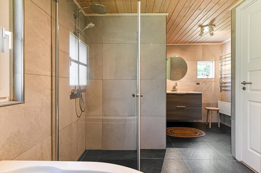 Das Naturgrundstück bietet dir beste Möglichkeiten, die Sonne zu genießen und es dir mit einem frischen Becher Kaffee im Schatten auf einem guten Gartenstuhl gemütlich zu machen. Die Holzterrasse ist gut zur Sonne hin ausgerichtet. Sie ist angenehm groß und bietet Platz für die Sonnenliegen, den Gartentisch und die Loungemöbel. Auf der angrenzenden gepflasterten Terrasse stehen eine Außendusche und ein Outdoor-Whirlpool bereit. Letztgenannter ist einfach über Tastendruck befüllbar und beheizbar, sodass du dich völlig unkompliziert nach Herzenslust in ruhiger Umgebung, sogar unter dem funkelnden Sternenhimmel, entspannen kannst. Die Grasfläche animiert dich und deine Familie zu gemeinsamen Gartenspielen. Auf der gepflasterten Parkfläche kannst du ohne Weiteres zwei Pkws abstellen.