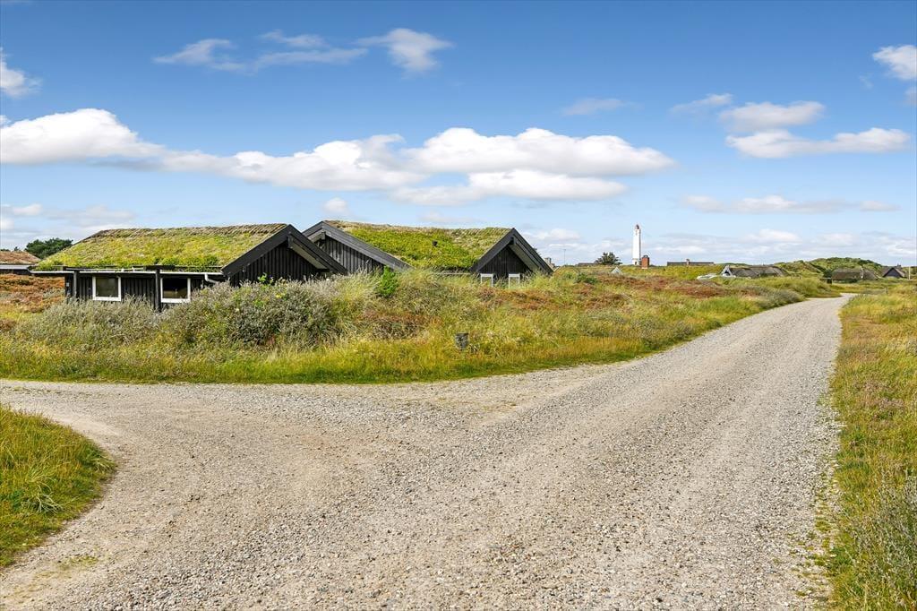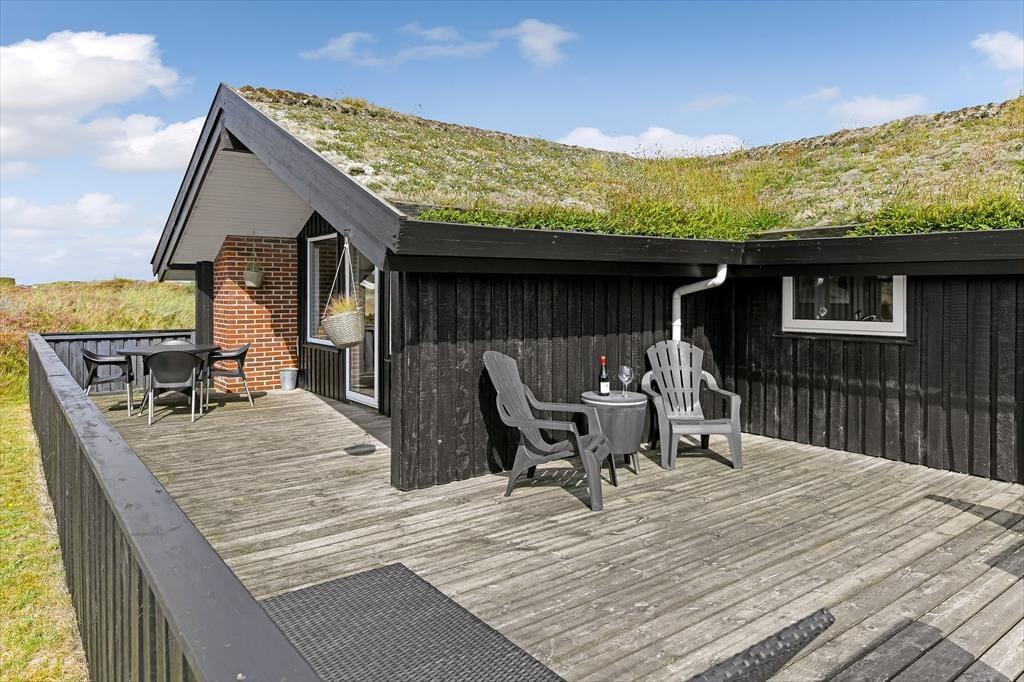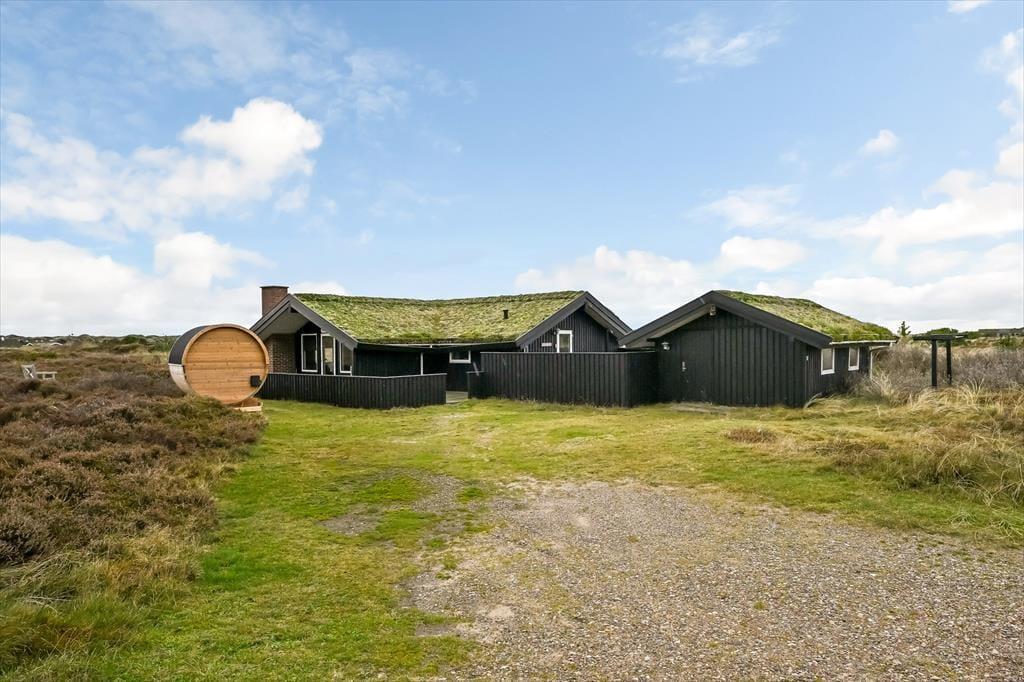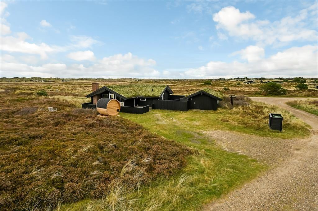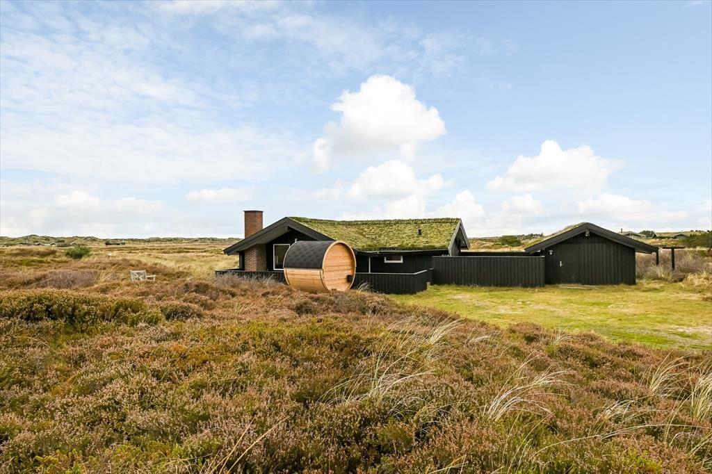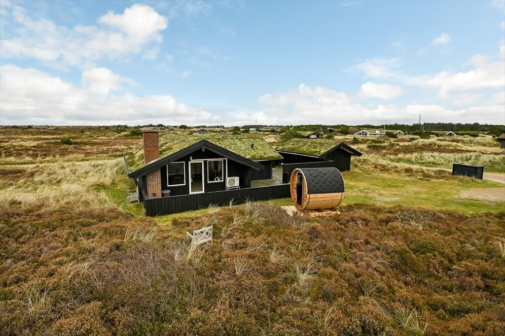 Mit seinem grünen Dach und der schwarzen Holzfassade fügt sich das Ferienhaus harmonisch in die offene Heidelandschaft ein, die sich hier erstreckt. Drinnen kannst du direkt auf das lila Heidekraut, die wogenden Strandhafer und den blauen Himmel blicken, sodass du auch dann die Natur genießen kannst, wenn du den ganzen Tag auf dem Sofa verbringen möchtest. Der Grundriss bietet drei Schlafzimmer und ein Badezimmer mit Fußbodenheizung; alle Räume sind hell und ansprechend gestaltet – natürlich auch der Wohnbereich, wo du den Kamin anzünden, dich in der Sofaecke zurücklehnen, mit deinem Strickzeug in den Sessel setzen oder ein leckeres Abendessen am Esstisch vorbereiten kannst.