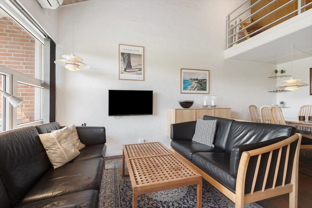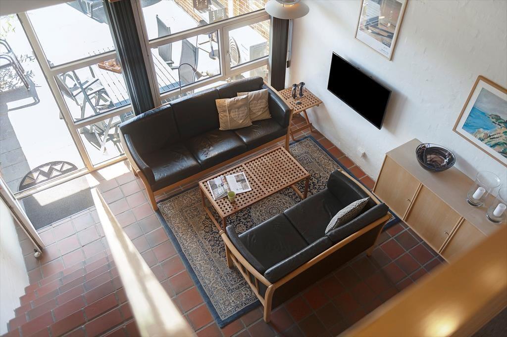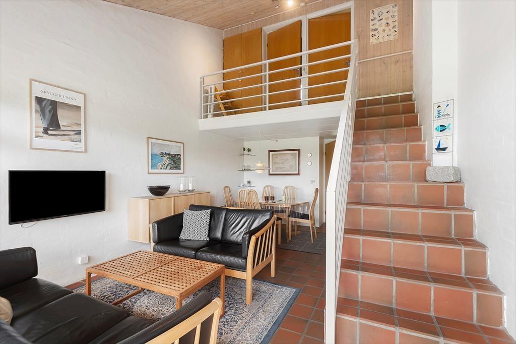Deine zweigeschossige Ferienwohnung ist Teil eines ansprechenden Reihenhauskomplexes. Vom Wohnraum führt dich eine Treppe in das Obergeschoss, in dem zwei Schlafräume zur Verfügung stehen. Diese beiden Schlafräume können gut von deinen Kindern genutzt werden, während ihr als Erwachsene im Schlafraum des Erdgeschosses übernachtet. Die Küche und der Wohnraum sind offen miteinander kombiniert und fungieren somit als zentraler Sammelpunkt für die gesamte Familie. In diesem Raum werdet ihr gemeinsam eure Mahlzeiten zubereiten und genießen sowie gesellige, stimmungsvolle Spiele- und Filmabende verleben. An kühlen Tagen heizt du den Kaminofen an, der für ein Maximum an behaglicher Wärme und Atmosphäre sorgt. An warmen Sommertagen stellst du hingegen die Terrassentür weit auf und lässt die frische Seeluft und die Düfte des Sommers durch deine Wohnung ziehen.