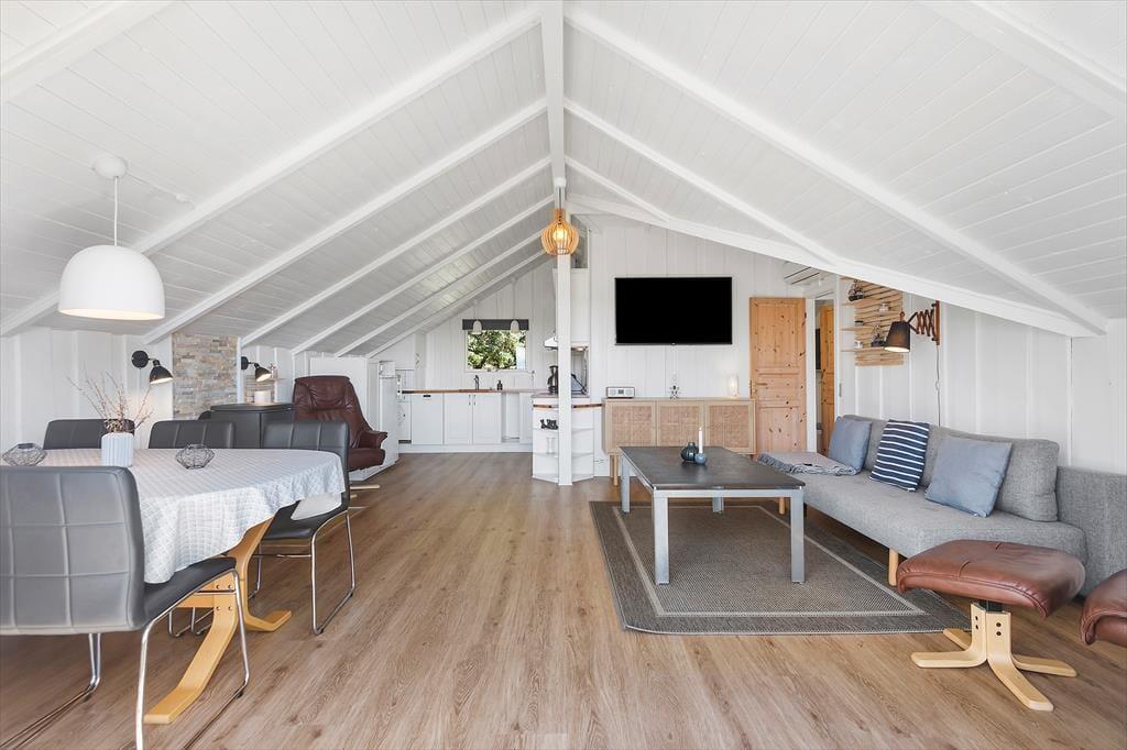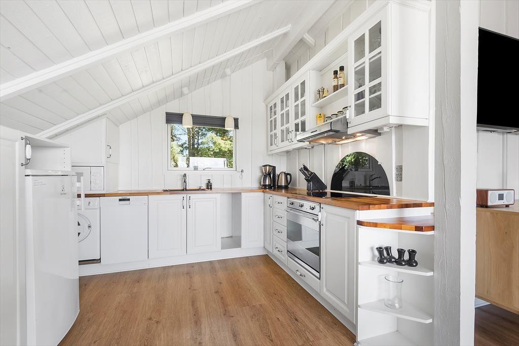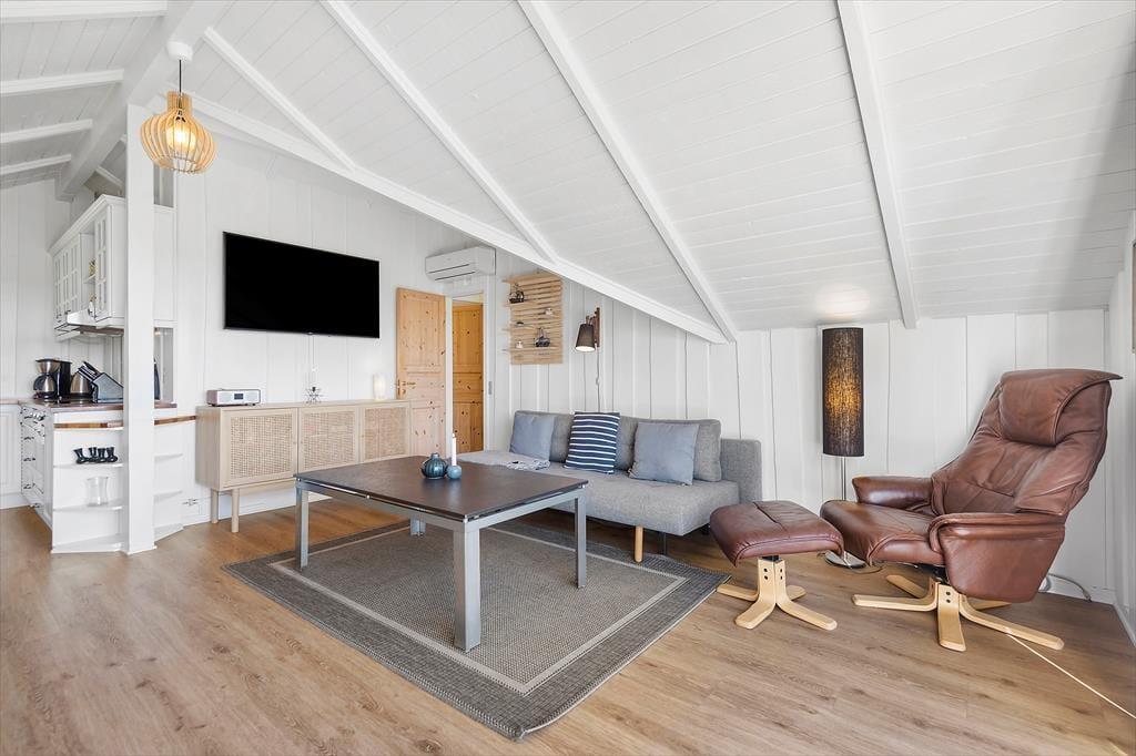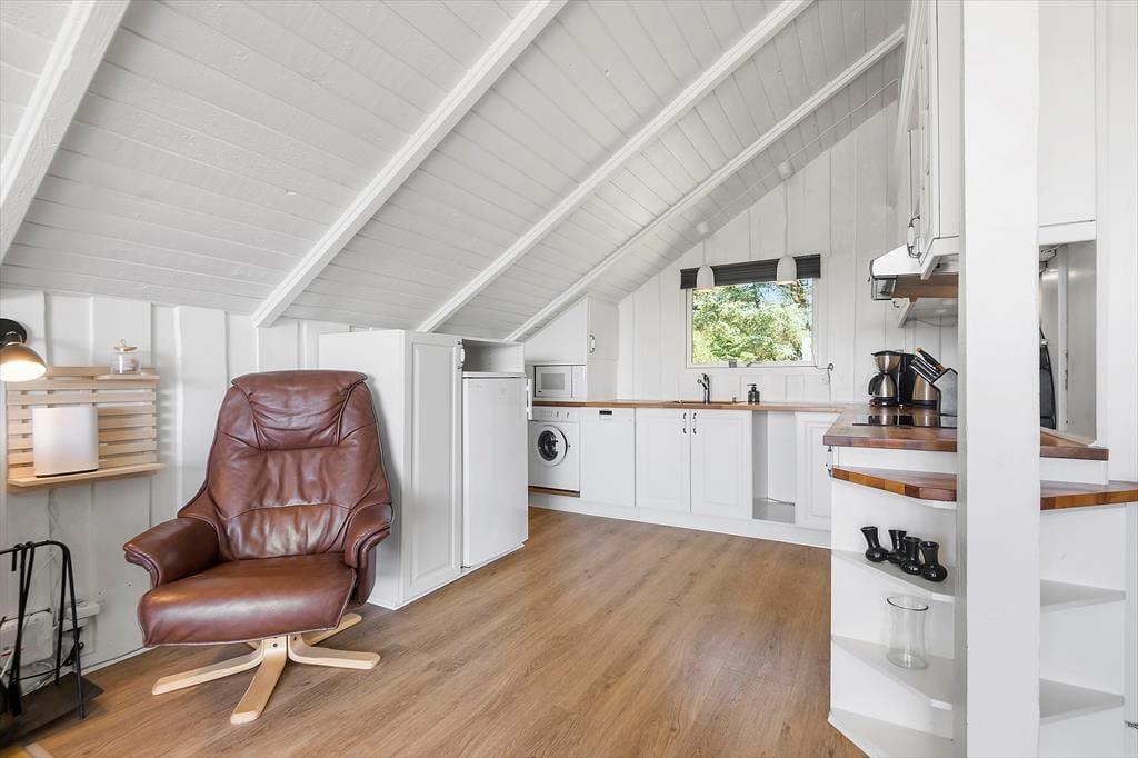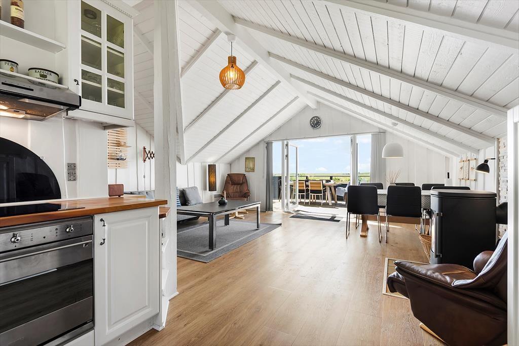 Einen Großteil deiner Urlaubstage verbringst du sicherlich verträumt vor deinem Wohnraumfenster, das dir bei jeder Wetterlage eine faszinierende Aussicht bietet. Nachdem du deinen Gedanken eine Zeit lang freien Lauf gelassen hast, kannst du es dir mit einem warmen Becher Tee und einem guten Buch in einem der Lehnstühle gemütlich machen. Alternativ sorgt der Flachbild-TV für Unterhaltung und Abwechslung. Behagliche Wärme und ein Maximum an echter Ferienhausatmosphäre verspricht derweil der knisternde Kaminofen. Die offene Küche dir bietet gute Arbeitsbedingungen für die Zubereitung des Frühstücks, kleiner Snacks und ausgefeilter Abendessen. Abends laden zwei Schlafräume zu erholsamen Nächten ein.
