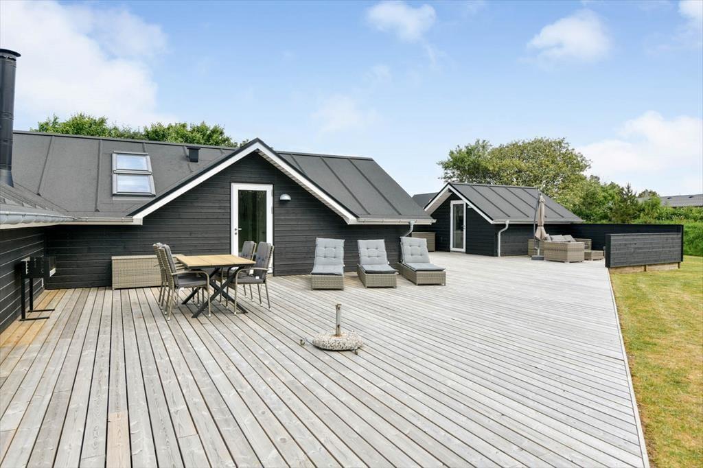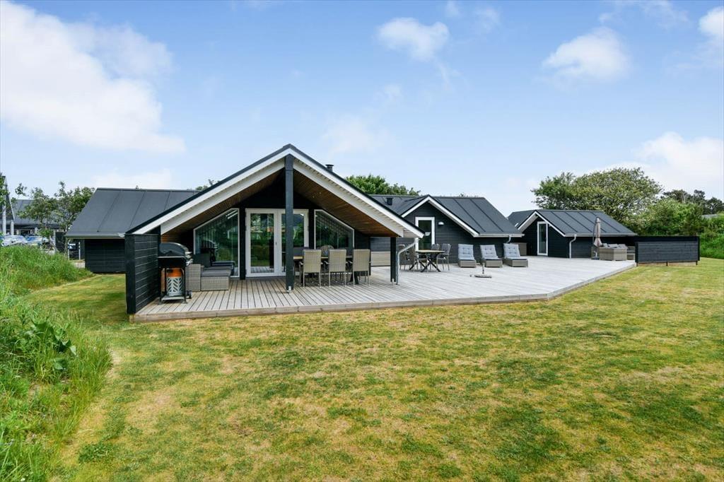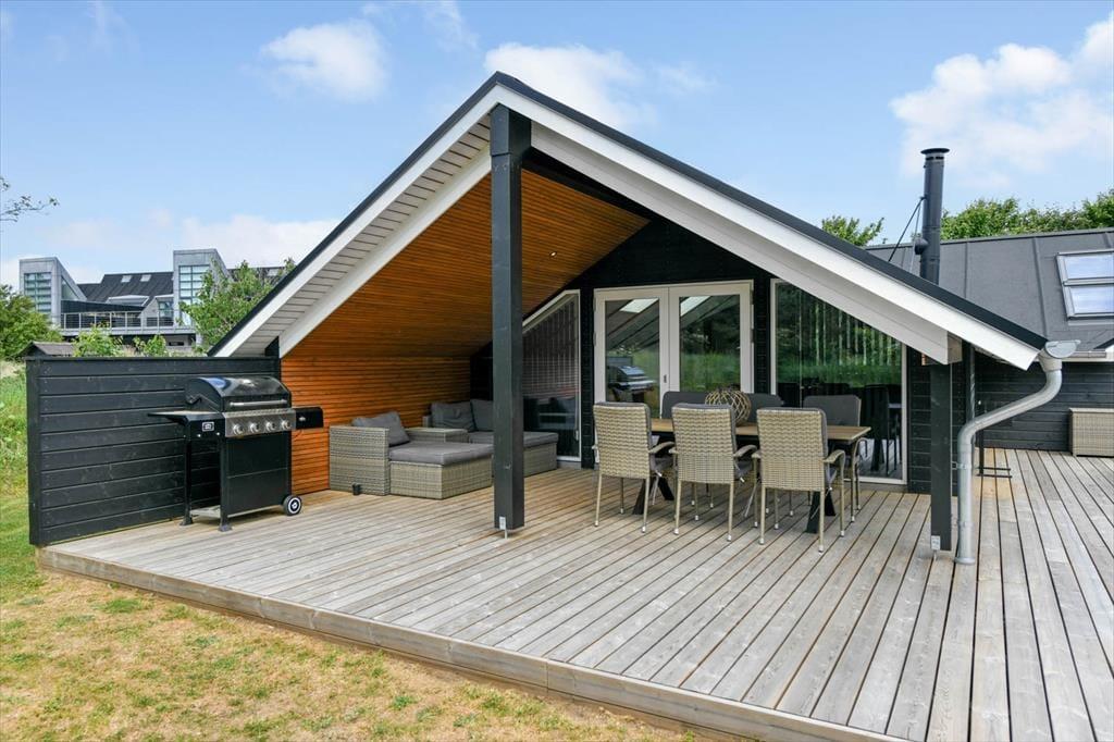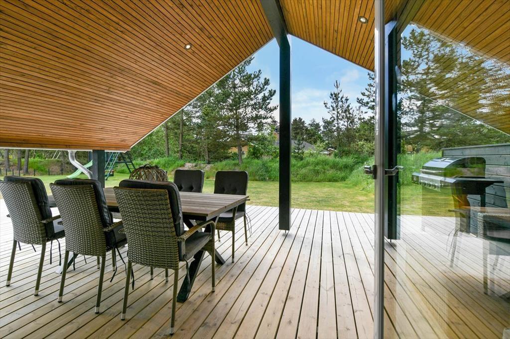 Draußen erwartet dich eine große und schöne überdachte Terrasse, die in den warmen Monaten fast wie ein zusätzliches Wohnzimmer fungiert. Hier kannst du geschützt vor Wind und Wetter ein gutes Essen oder eine Tasse Kaffee an der frischen Luft genießen. Die Terrasse ist mit modernen Gartenmöbeln ausgestattet, sodass du die Möglichkeit hast, dich zu entspannen und den Urlaub in vollen Zügen zu genießen. Der Garten rund um das Ferienhaus ist eine schöne Oase mit Platz zum Spielen und Entspannen. Hier können die Kinder sich austoben, während du dich zurücklehnst und die friedliche Atmosphäre genießt.