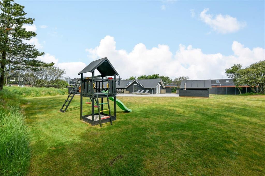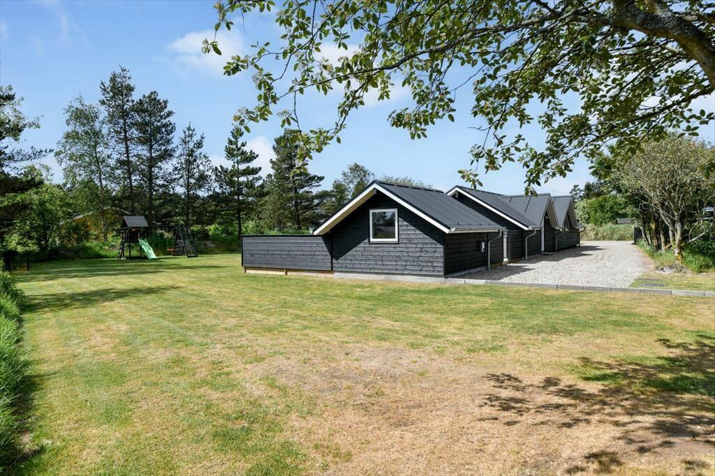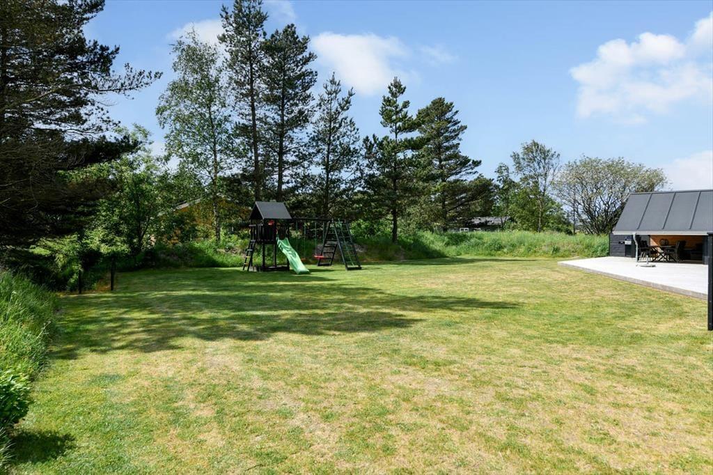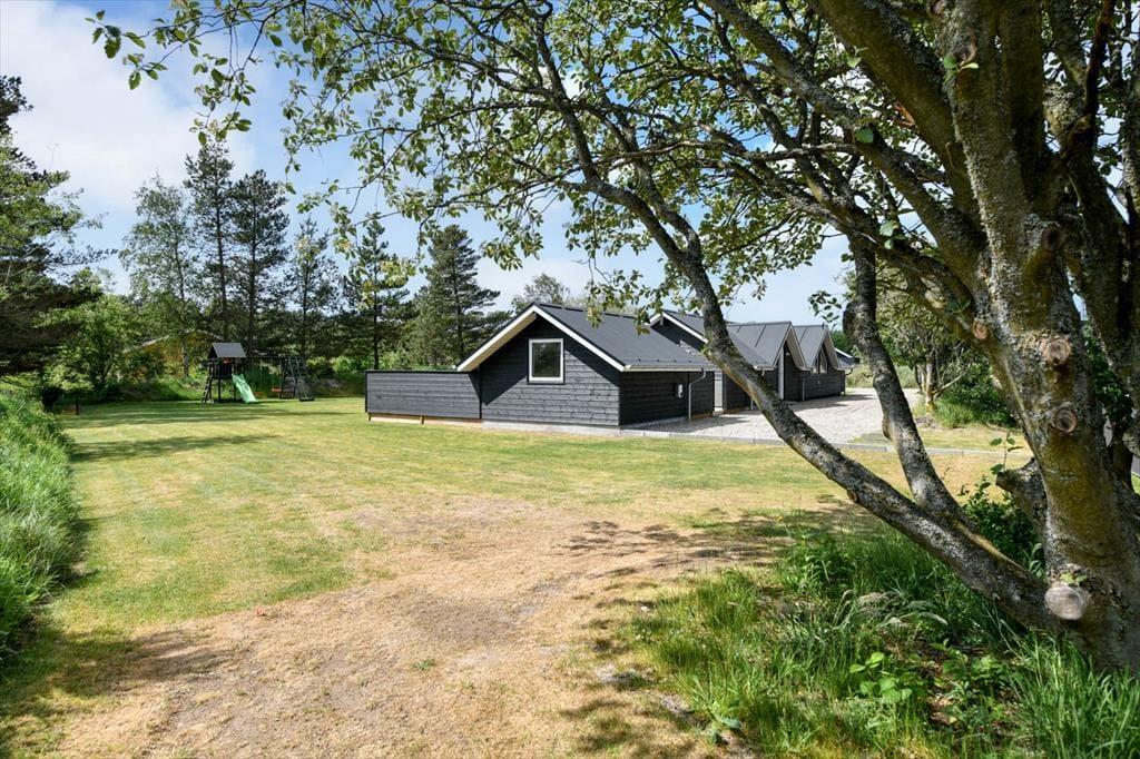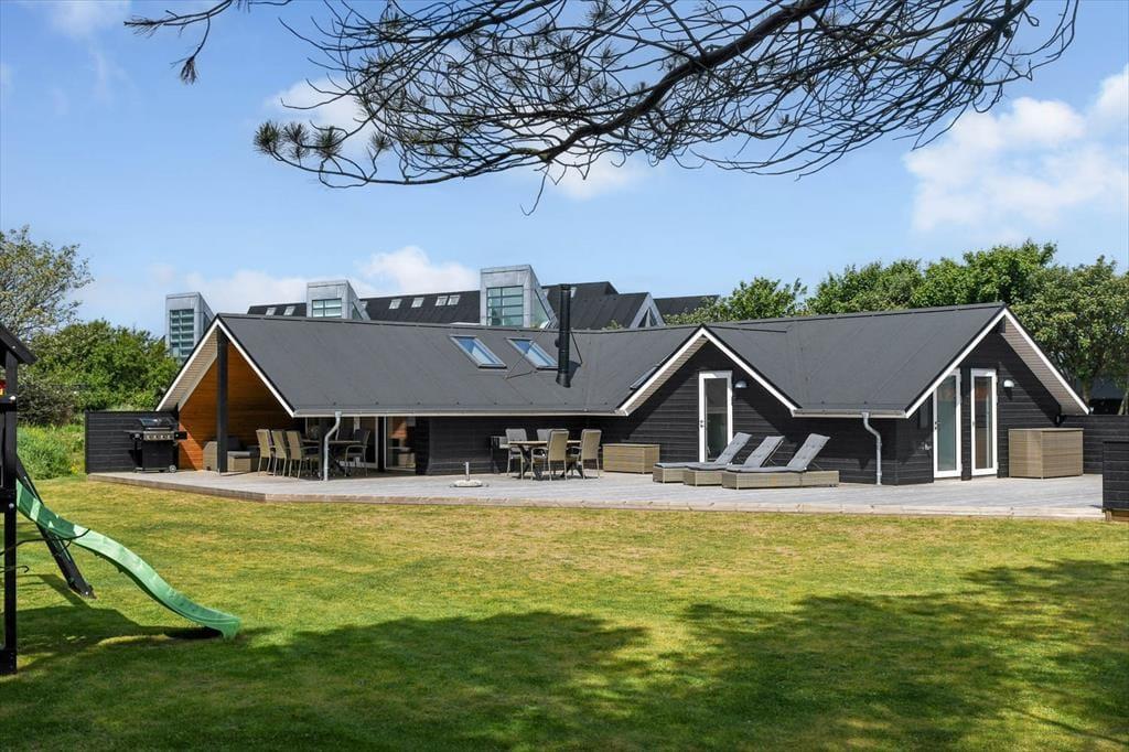 Draußen erwartet dich eine große und schöne überdachte Terrasse, die in den warmen Monaten fast wie ein zusätzliches Wohnzimmer fungiert. Hier kannst du geschützt vor Wind und Wetter ein gutes Essen oder eine Tasse Kaffee an der frischen Luft genießen. Die Terrasse ist mit modernen Gartenmöbeln ausgestattet, sodass du die Möglichkeit hast, dich zu entspannen und den Urlaub in vollen Zügen zu genießen. Der Garten rund um das Ferienhaus ist eine schöne Oase mit Platz zum Spielen und Entspannen. Hier können die Kinder sich austoben, während du dich zurücklehnst und die friedliche Atmosphäre genießt.