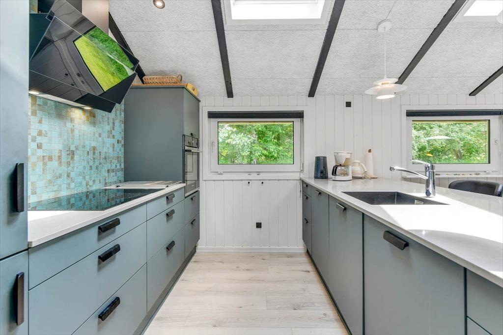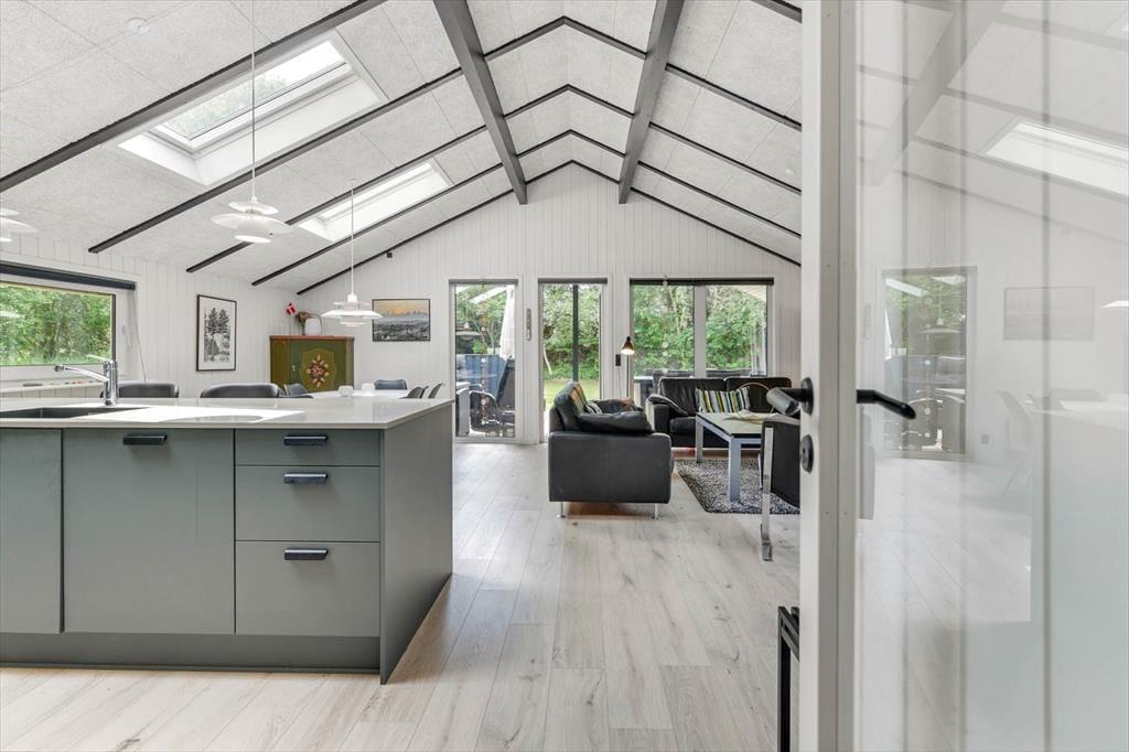 Wenn du dieses schöne Ferienhaus betrittst, wirst du von einer schicken und gut ausgestatteten Küche empfangen, die zu kulinarischen Erlebnissen einlädt. Die offenen und hellen Räume im Haus sorgen dafür, dass du dich vom ersten Moment an wie zu Hause fühlst. Das Wohnzimmer ist der ideale Ort, um gemütliche Abende vor dem Kamin mit der Familie zu verbringen, während große Fenster das Tageslicht hereinströmen lassen und eine angenehme Atmosphäre schaffen. Die zwei schönen Badezimmer mit modernen Einrichtungen machen es leicht, Entspannung und Luxus im Alltag zu verbinden. Vom Wohnzimmer aus hast du direkten Zugang zu mehreren schönen Terrassen, wo du den Blick auf die umliegende Natur genießen kannst.