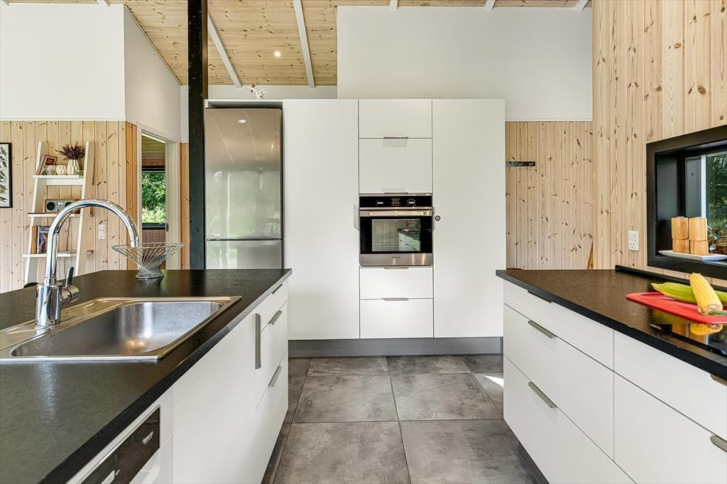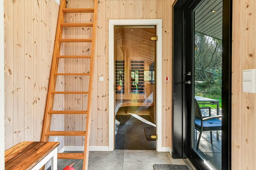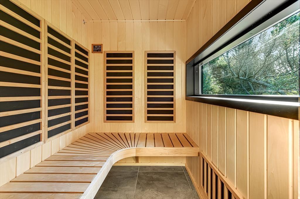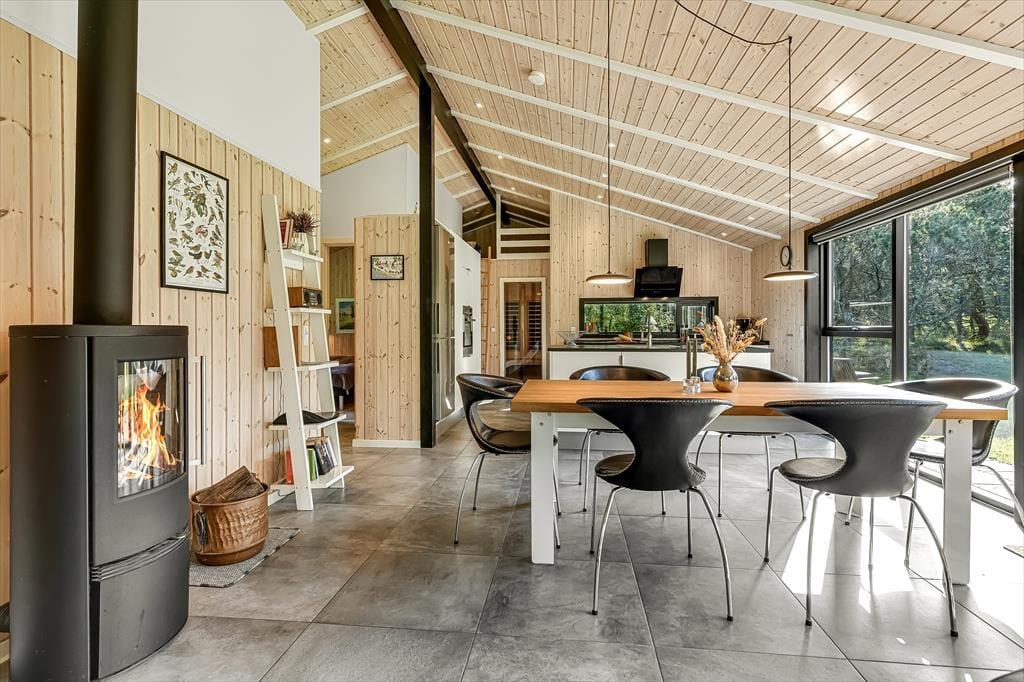 Wenn du dieses schöne Ferienhaus betrittst, wirst du sofort die offene und helle Atmosphäre bemerken. Die große, offen gestaltete Küche, die mit dem Wohnzimmer verbunden ist, ist mit modernen Qualitätsmaterialien eingerichtet, die sowohl zu kulinarischen Erlebnissen als auch zu gemütlichem Beisammensein einladen. Hier kannst du köstliche Mahlzeiten zubereiten, während du dennoch Teil des Gemeinschaftsraums im Wohnzimmer bist. Das gemütliche Wohnzimmer mit seinem stilvollen Design vermittelt ein Gefühl von heimeliger Behaglichkeit, besonders wenn du den Kamin anzündest und die warmen Flammen genießt. Ein zusätzliches Highlight erwartet dich in der Infrarotsauna des Hauses, die perfekt zur Entspannung nach einem Tag in der Natur geeignet ist. Das Haus bietet auch mehrere schöne Schlafzimmer.