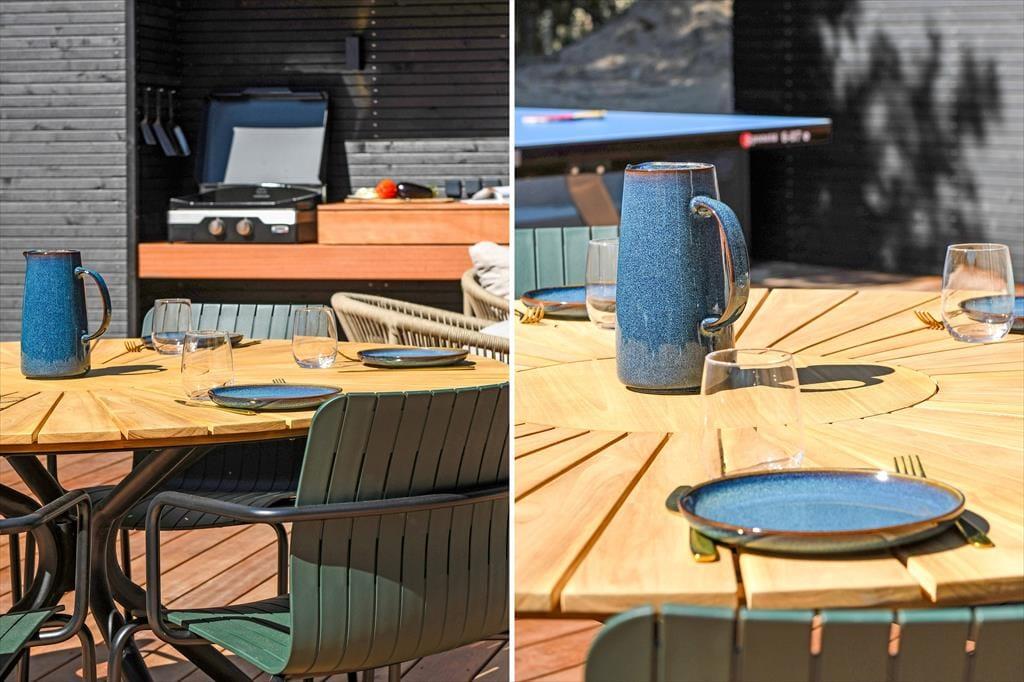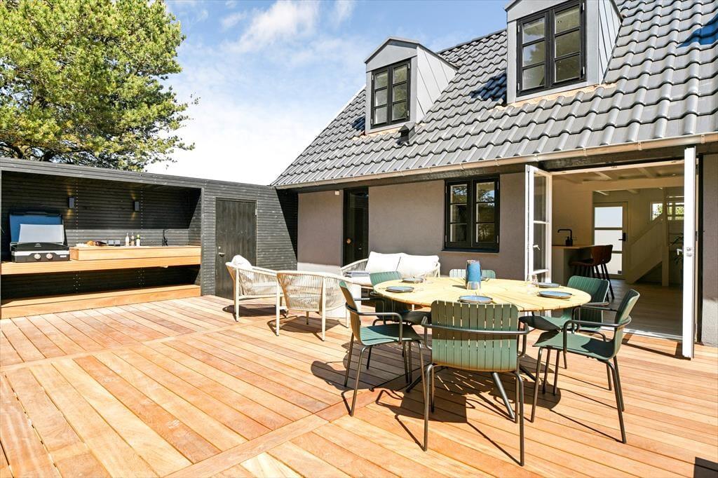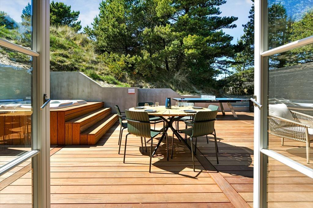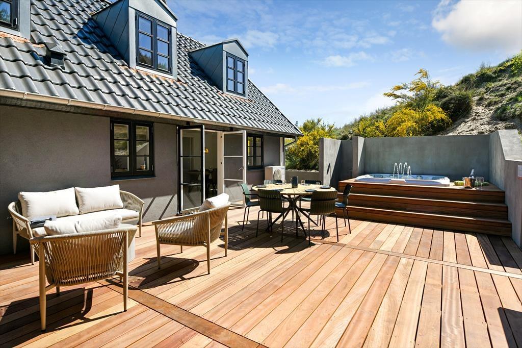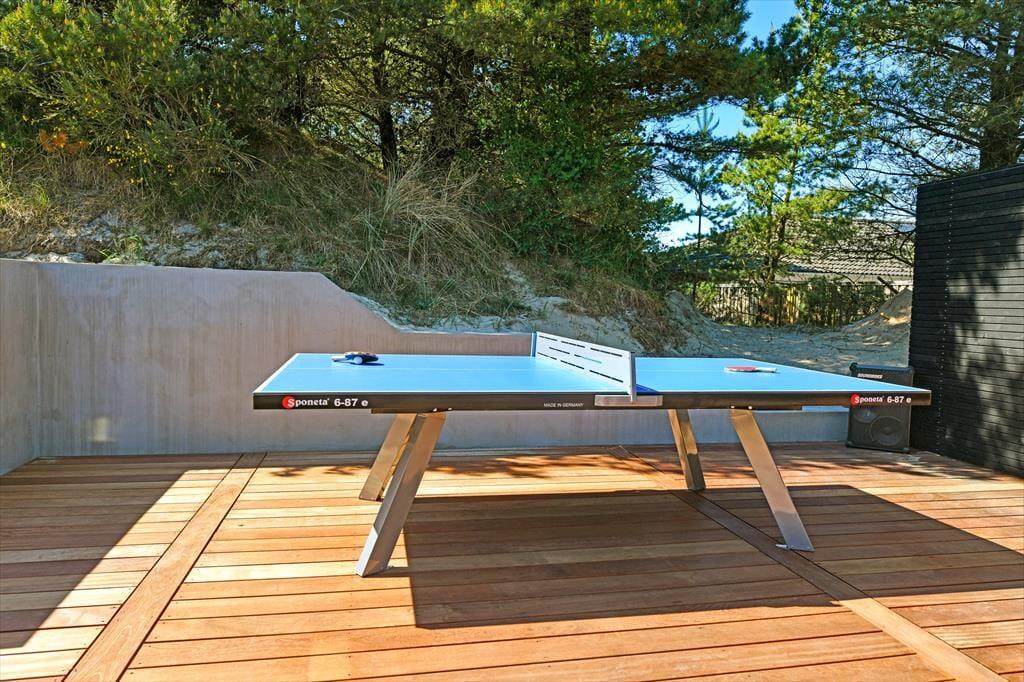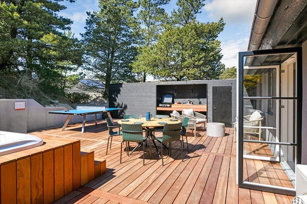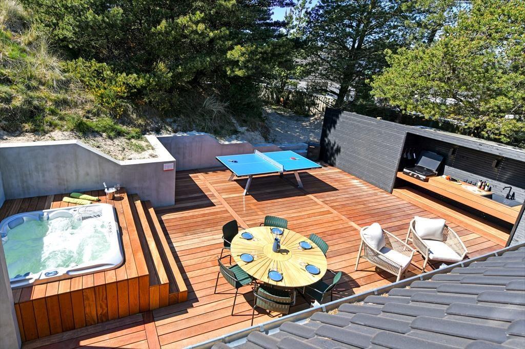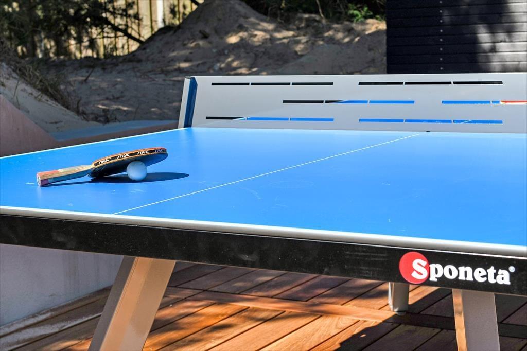 Das Ferienhaus ist von einer landschaftlich schönen Dünenmulde umgeben, die ein ganz besonderes Gefühl von Ruhe und Privatsphäre vermittelt. Auf der großen Terrasse kannst du den ganzen Tag die Sonne genießen und hast dabei einen Blick auf die grünen Umgebungen. Bereite in der schönen Außenküche ein köstliches Essen für diee Familie zu. Der Außen-Whirlpool ist ein perfekter Ort, um zu entspannen und die frische Luft zu genießen, während du den Blick auf die schöne Natur schweifen lässt. Du kannst auch die Außensauna nutzen, die direkt an das Terrassenumfeld angrenzt. Für diejenigen, die etwas Aktivität lieben, gibt es auch einen Tischtennistisch auf der Terrasse, sodass du deine Mitreisenden zu einem lustigen und energiegeladenen Turnier herausfordern kannst. Egal, ob du dich entspannen oder aktiv sein möchtest, die Möglichkeiten liegen direkt vor der Tür.