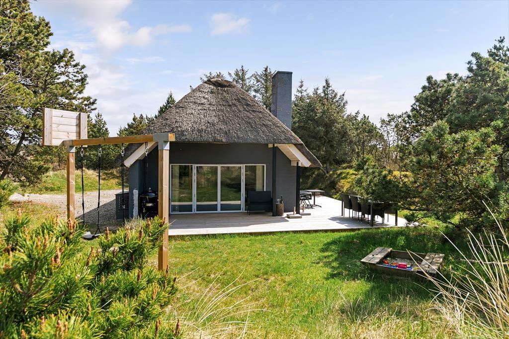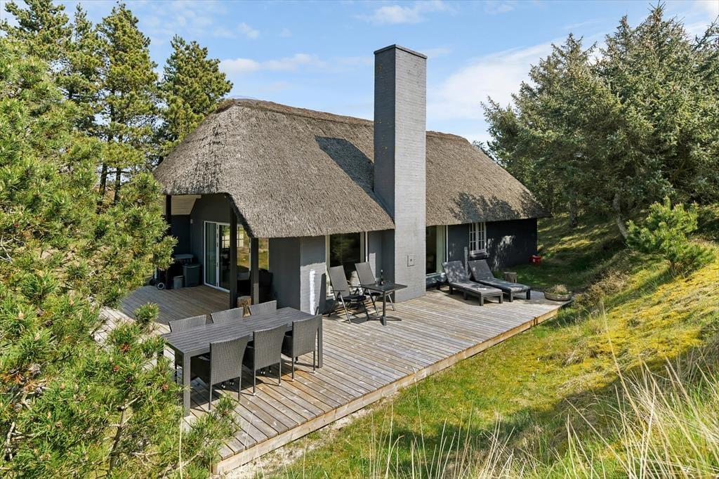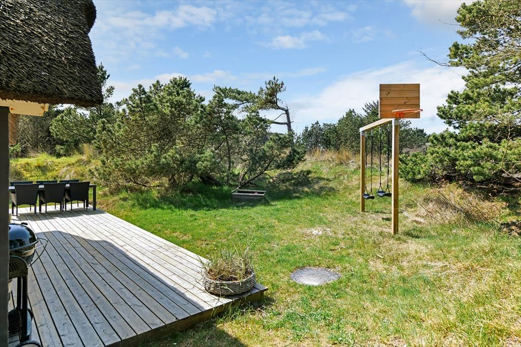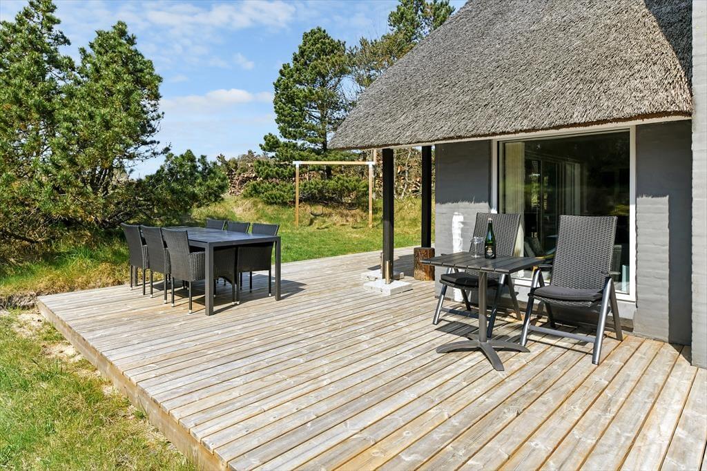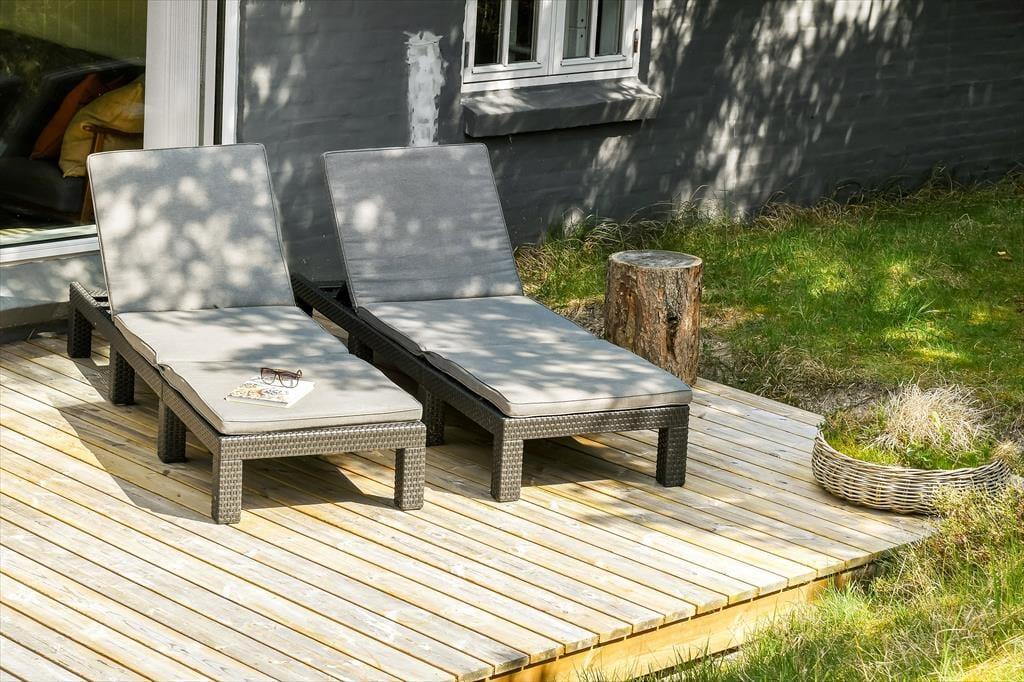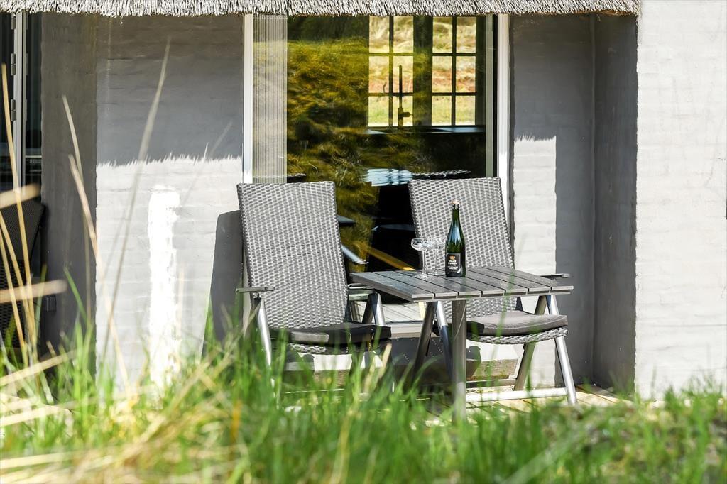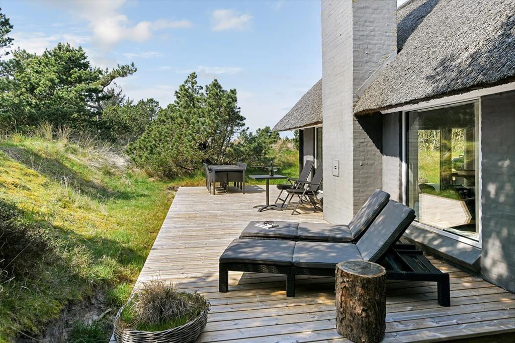 Auch draußen geht das Urlaubsgefühl nahtlos weiter. Das Ferienhaus liegt eingebettet in einer Senke, in der man sich ganz für sich allein fühlt – umgeben von einem schönen Naturgrundstück, auf dem Heidekraut und Strandhafer sanft im Wind wiegen. Die ruhige Umgebung macht es leicht, vollkommen abzuschalten. Auf der großen Holzterrasse kannst du die Sonne in vollen Zügen genießen – vielleicht mit einem Buch in der Hand und einer Tasse Kaffee in Reichweite. Hier lässt sich ein köstliches Abendessen unter freiem Himmel genießen – zum Beispiel frisch Gegrilltes aus der Region – oder du lehnst dich einfach zurück und lässt die Geräusche der Natur auf dich wirken. Die Terrasse ist sowohl gemütlich als auch funktional – ein idealer Ort, um viele Stunden des Urlaubs zu verbringen, egal ob bei strahlendem Sonnenschein oder eingekuschelt in eine Decke mit frischer Westjütlandluft um die Nase.