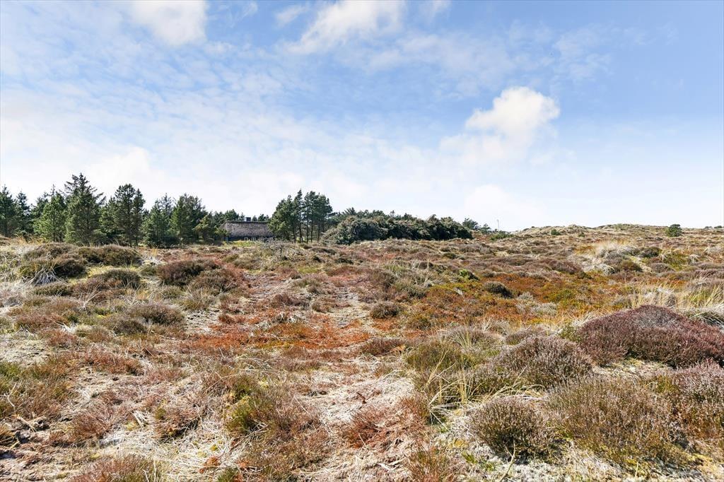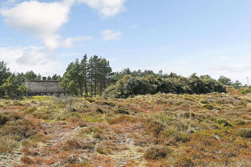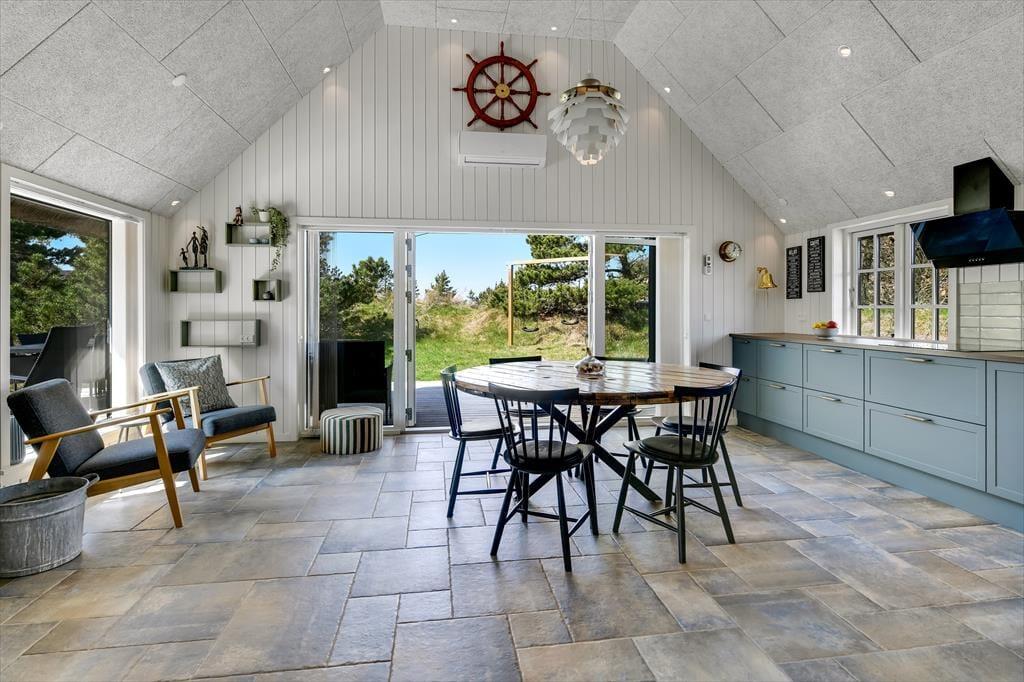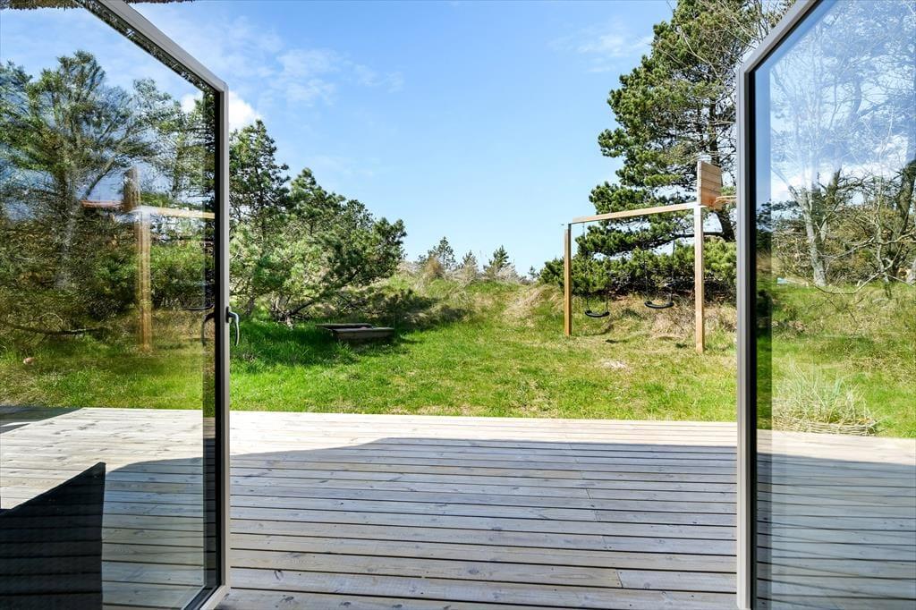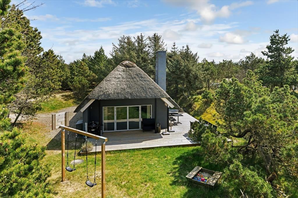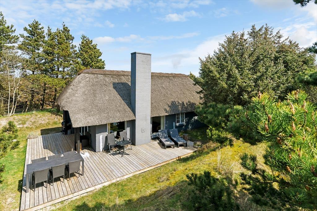 Auch draußen geht das Urlaubsgefühl nahtlos weiter. Das Ferienhaus liegt eingebettet in einer Senke, in der man sich ganz für sich allein fühlt – umgeben von einem schönen Naturgrundstück, auf dem Heidekraut und Strandhafer sanft im Wind wiegen. Die ruhige Umgebung macht es leicht, vollkommen abzuschalten. Auf der großen Holzterrasse kannst du die Sonne in vollen Zügen genießen – vielleicht mit einem Buch in der Hand und einer Tasse Kaffee in Reichweite. Hier lässt sich ein köstliches Abendessen unter freiem Himmel genießen – zum Beispiel frisch Gegrilltes aus der Region – oder du lehnst dich einfach zurück und lässt die Geräusche der Natur auf dich wirken. Die Terrasse ist sowohl gemütlich als auch funktional – ein idealer Ort, um viele Stunden des Urlaubs zu verbringen, egal ob bei strahlendem Sonnenschein oder eingekuschelt in eine Decke mit frischer Westjütlandluft um die Nase.