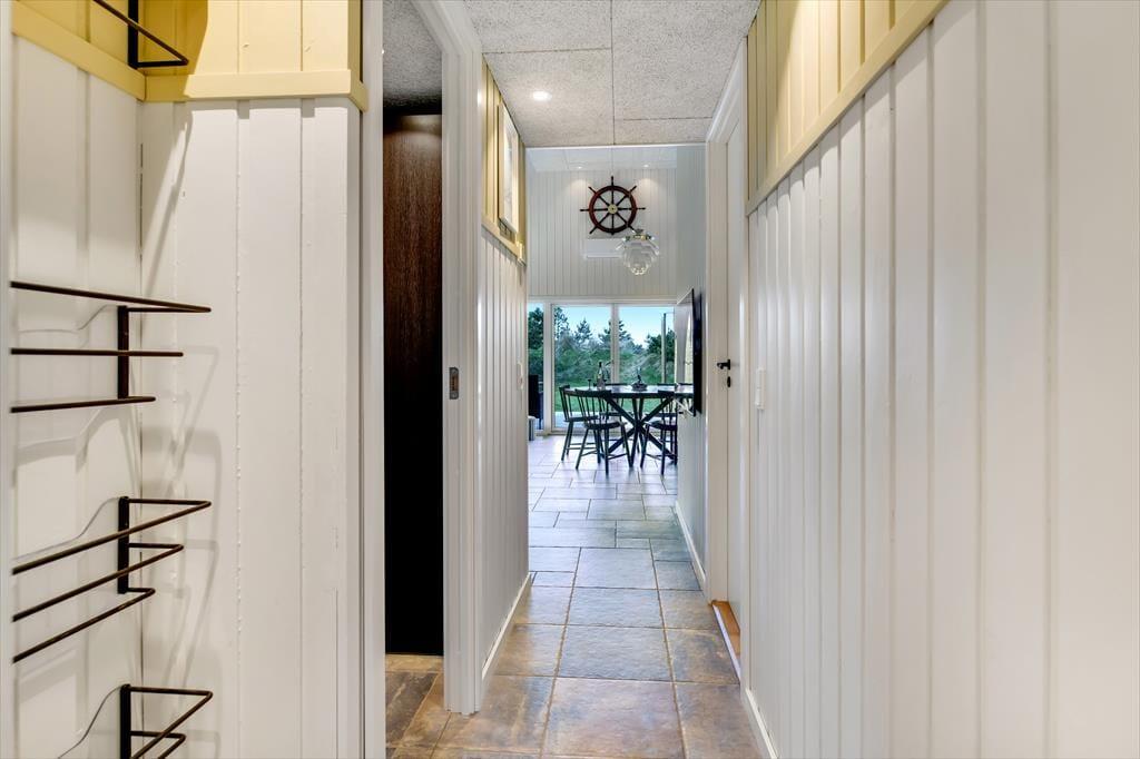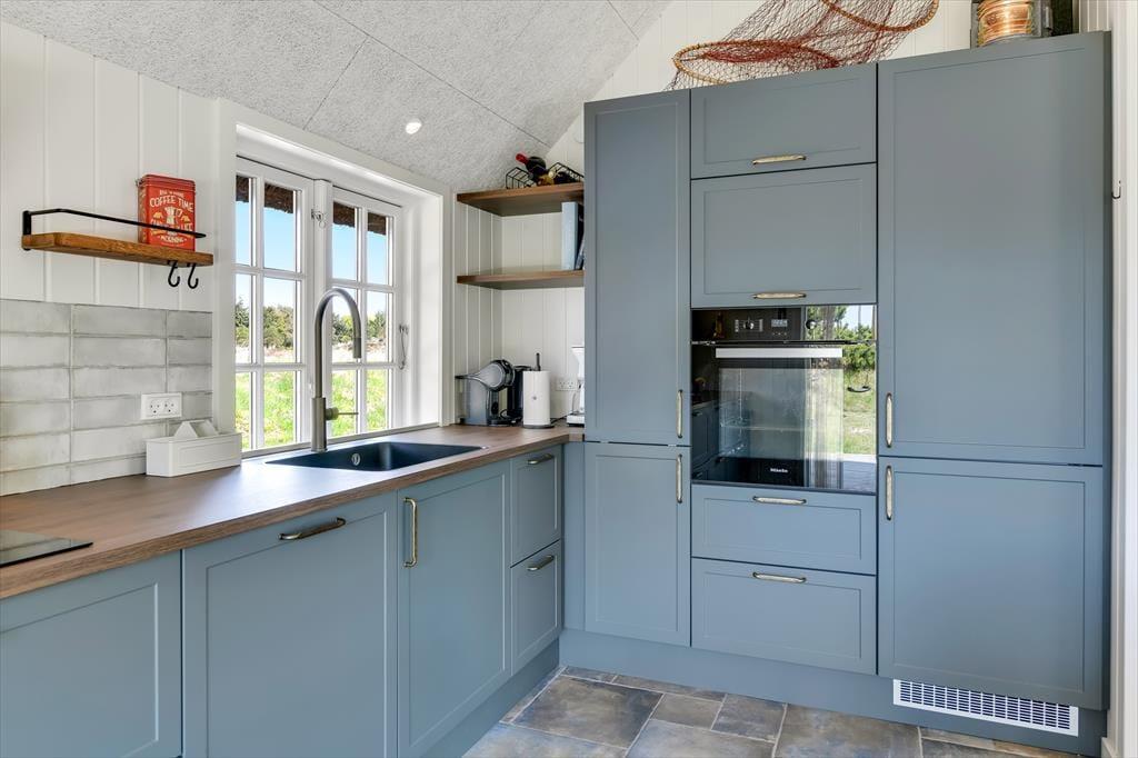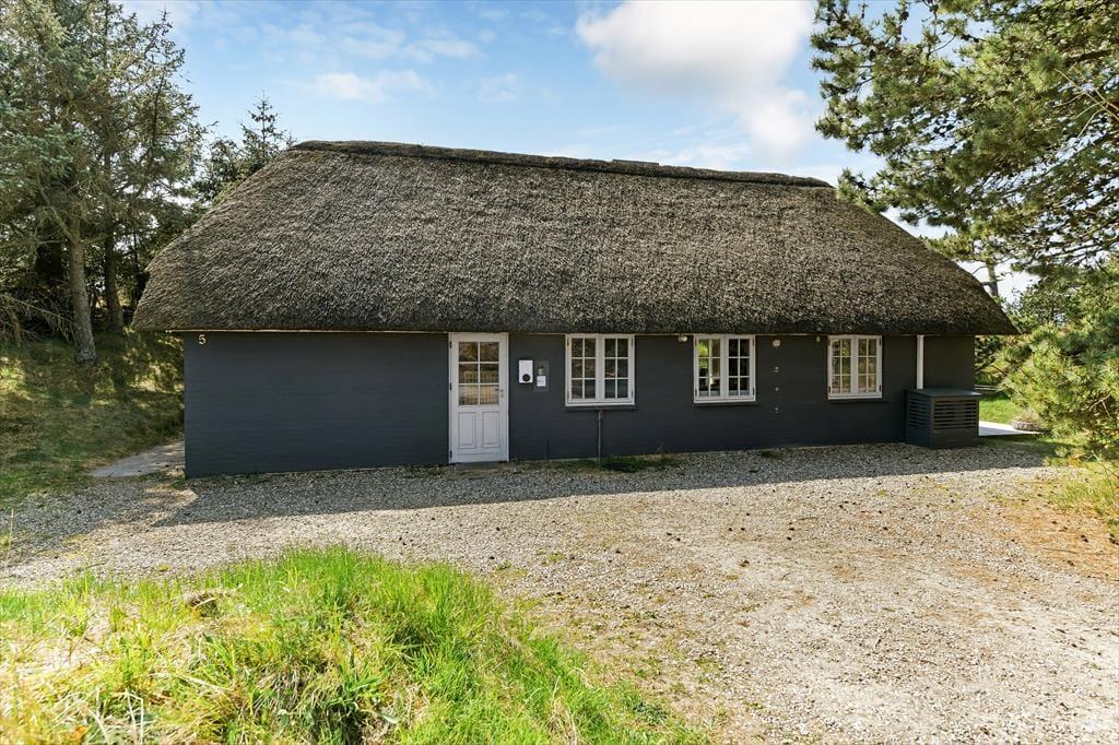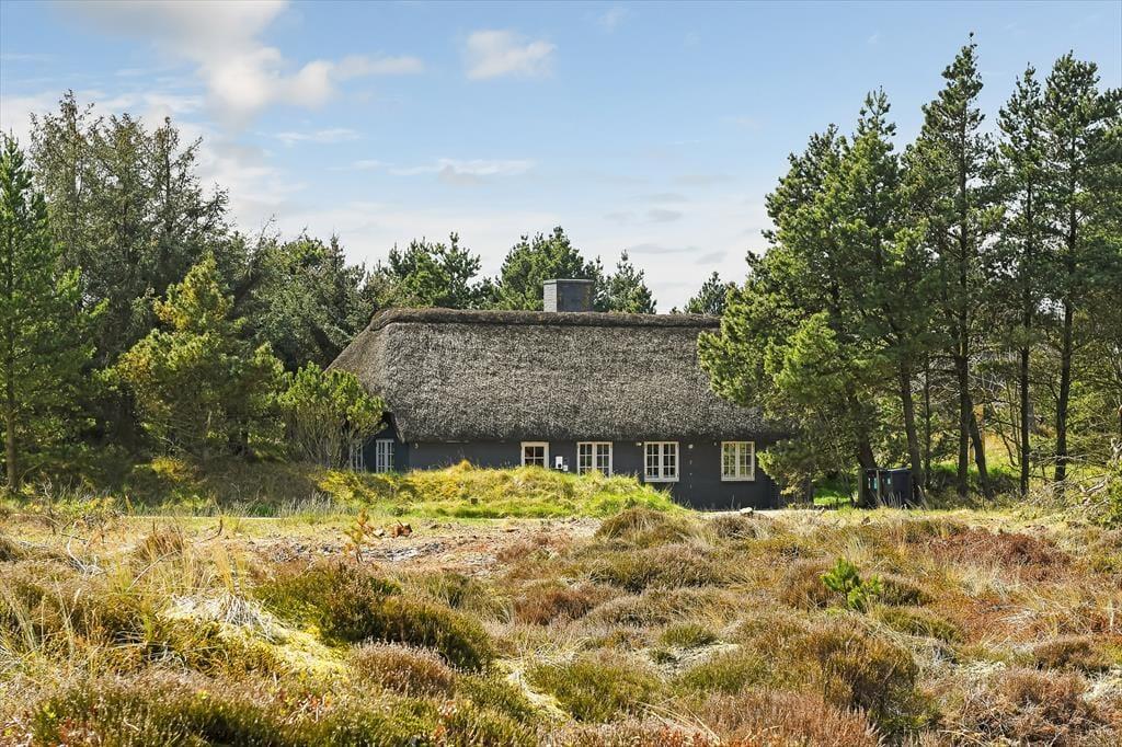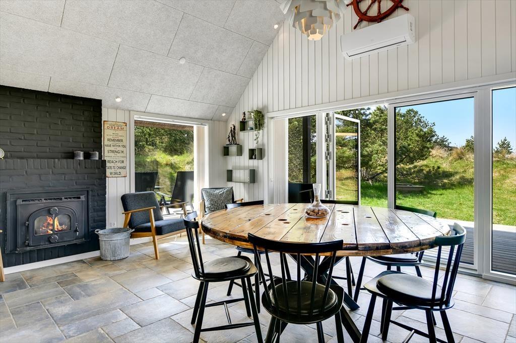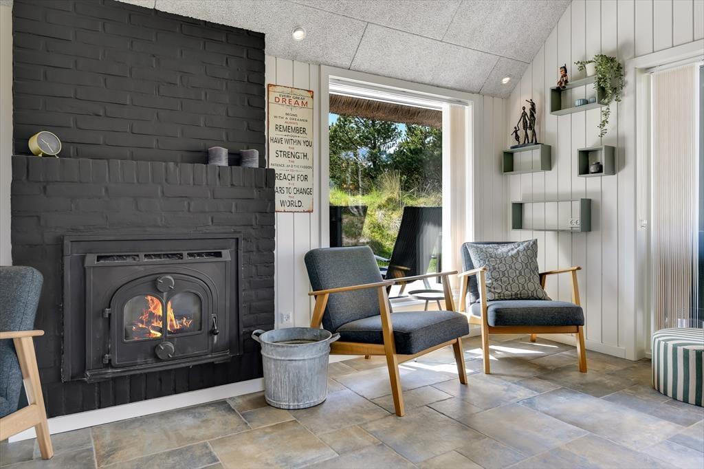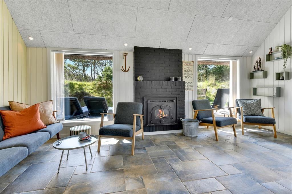 Auch draußen geht das Urlaubsgefühl nahtlos weiter. Das Ferienhaus liegt eingebettet in einer Senke, in der man sich ganz für sich allein fühlt – umgeben von einem schönen Naturgrundstück, auf dem Heidekraut und Strandhafer sanft im Wind wiegen. Die ruhige Umgebung macht es leicht, vollkommen abzuschalten. Auf der großen Holzterrasse kannst du die Sonne in vollen Zügen genießen – vielleicht mit einem Buch in der Hand und einer Tasse Kaffee in Reichweite. Hier lässt sich ein köstliches Abendessen unter freiem Himmel genießen – zum Beispiel frisch Gegrilltes aus der Region – oder du lehnst dich einfach zurück und lässt die Geräusche der Natur auf dich wirken. Die Terrasse ist sowohl gemütlich als auch funktional – ein idealer Ort, um viele Stunden des Urlaubs zu verbringen, egal ob bei strahlendem Sonnenschein oder eingekuschelt in eine Decke mit frischer Westjütlandluft um die Nase.