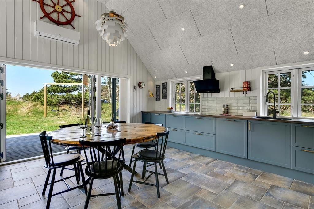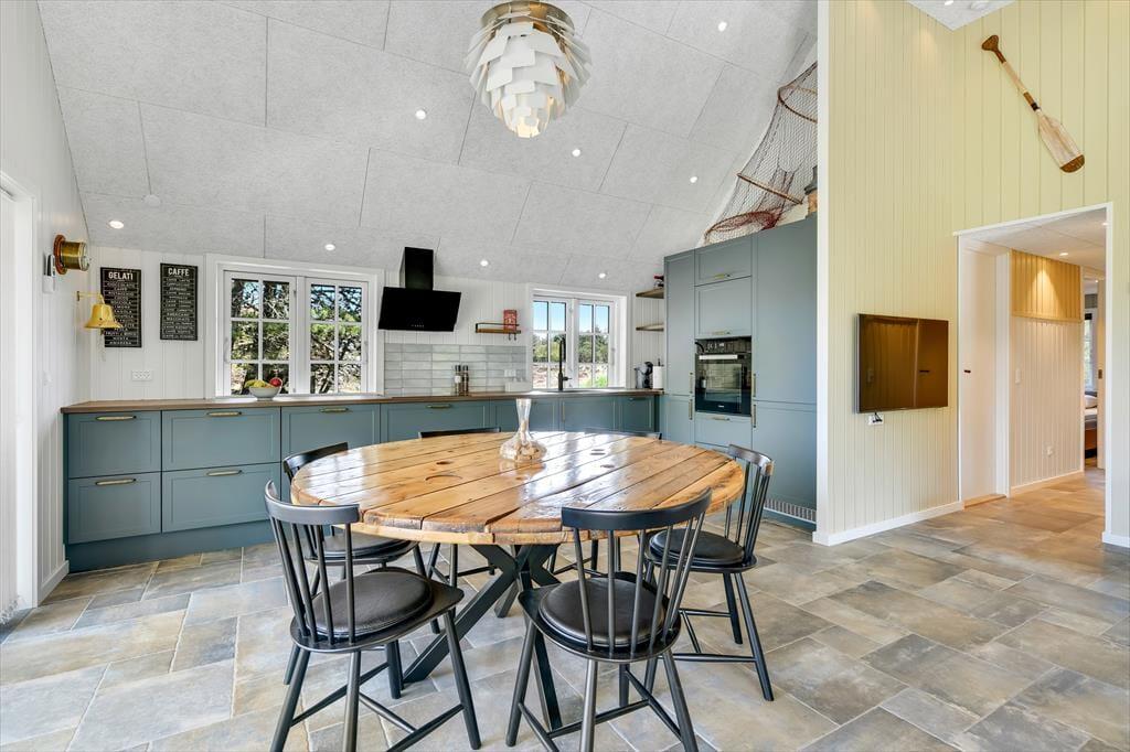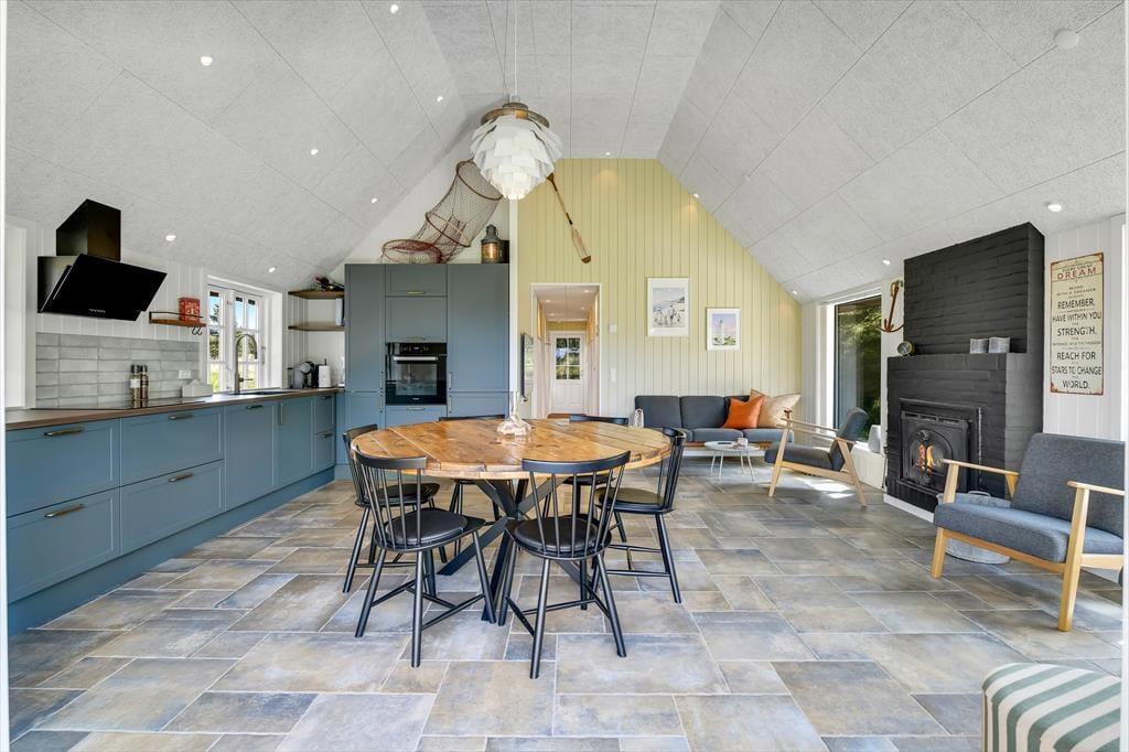 Echte Ferienhausstimmung ist garantiert, wenn dein Urlaub in der Nordslugen 5 beginnt. Das Erste, was dich empfängt, ist der helle und offene Wohnbereich, in dem Küche, Essplatz und Wohnzimmer harmonisch miteinander verbunden sind – ein wunderbarer Treffpunkt für Alltägliches und gesellige Urlaubsmomente. Während einige das Essen zubereiten, können andere am Esstisch spielen, auf dem Sofa lesen oder einfach die gemeinsame Zeit genießen. Die Räume haben eine entspannte Atmosphäre, in der man sich schnell wie zu Hause fühlt, und die großen Fenster lassen viel Tageslicht herein. Öffnest du die Terrassentüren, verschwimmt die Grenze zwischen drinnen und draußen – du bist der Natur ganz nah, auch wenn du im Haus bist. Es gibt viel Platz, um zur Ruhe zu kommen und einfach zu entspannen – genau das lädt dieses Haus ein, zu tun.