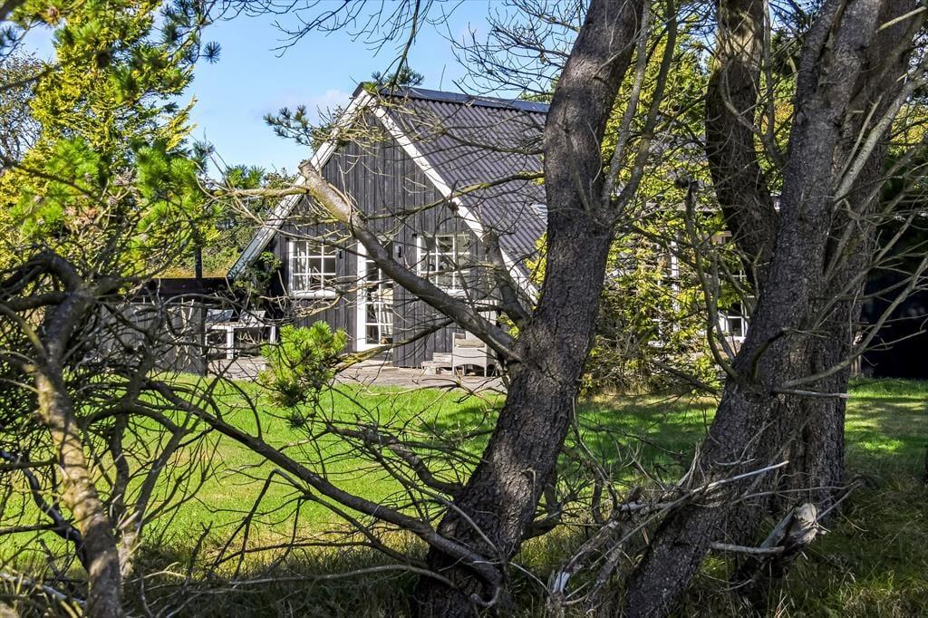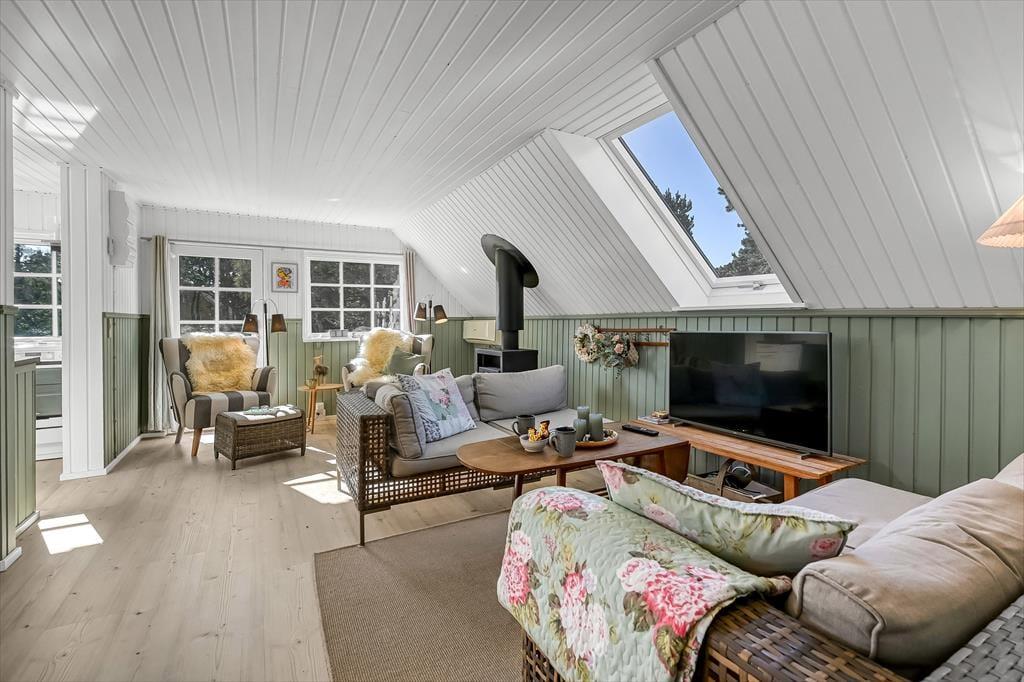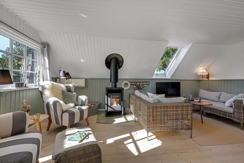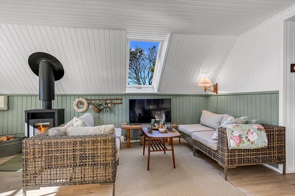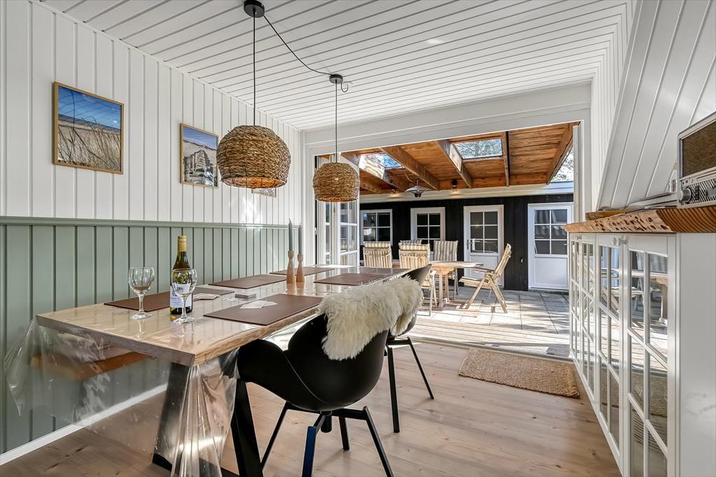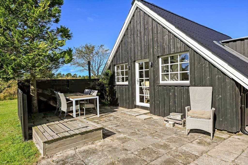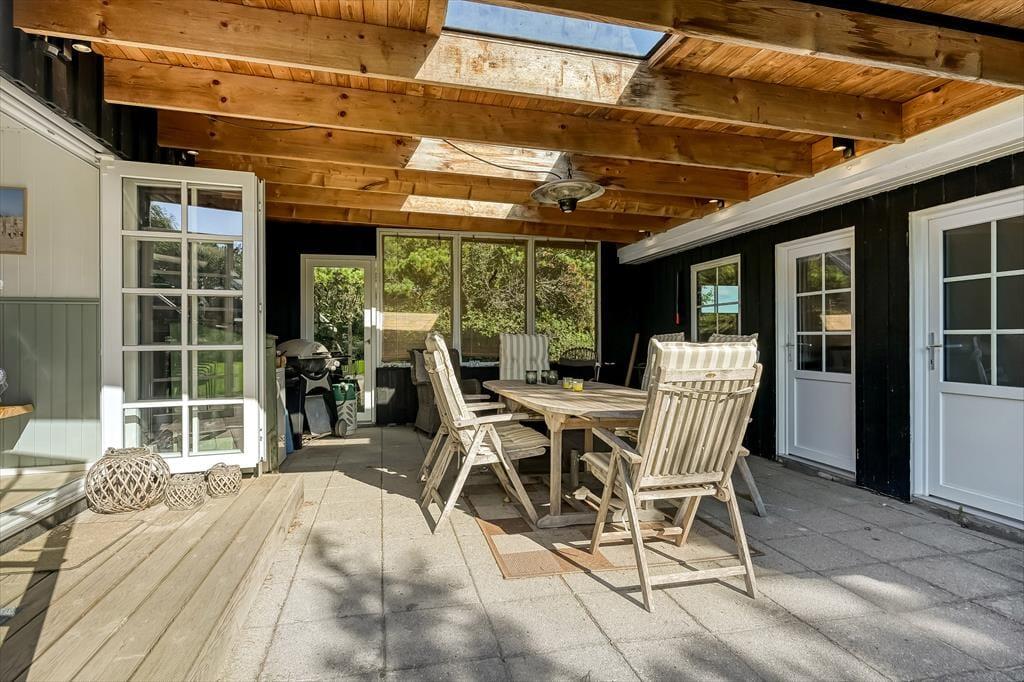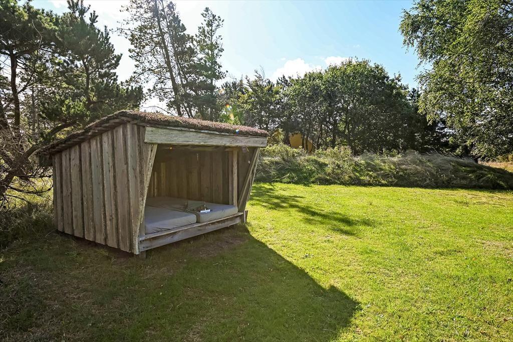 Draußen erwartet euch ein großes, herrliches Naturgrundstück, das euch das Gefühl gibt, euer eigenes kleines Refugium mitten in Blåvands wunderschöner Natur zu haben. Die Kinder werden es lieben, auf der Wiese zu spielen, im Spielturm zu klettern oder das Gebiet rund um den Shelter zu erkunden, wo sie stundenlang kleine Abenteuer erleben können. Für die Erwachsenen gibt es viele gemütliche Plätze zum Verweilen – besonders die überdachte Terrasse mit Oberlichtern. Hier könnt ihr die Türen weit öffnen und Innen- und Außenbereich ineinander übergehen lassen. So lassen sich die Sommerabende mühelos verlängern, selbst wenn der Tau fällt, während der Duft von Gegrilltem und das Zwitschern der Vögel die Atmosphäre perfekt abrunden.