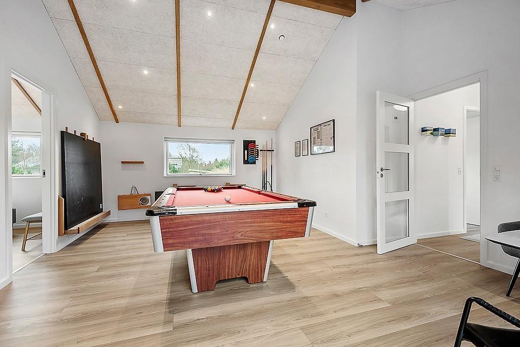 Im Inneren empfängt dich ein Ferienhaus, in dem Qualität, Komfort und eine durchdachte Einrichtung den Rahmen für das Urlaubsleben bilden. Helle Materialien, ruhige Farbtöne und die großzügige Raumaufteilung schaffen eine warme und angenehme Atmosphäre, in der du dich schnell zuhause fühlst. Sowohl ein Kaminofen als auch eine Wärmepumpe sorgen dafür, dass das Haus behaglich und gemütlich ist. Du kannst den Tag ruhig mit dem Duft von frisch gebrühtem Kaffee beginnen, während die Morgensonne durch die Fenster fällt – oder die Familie zu langen Mahlzeiten, Lachen und guten Gesprächen am Esstisch versammeln. Die vier Schlafzimmer bieten Platz für bis zu acht Personen und sind spürbar auf Ruhe und Erholung ausgelegt, sodass du ausgeruht aufwachst und bereit für neue Urlaubserlebnisse bist. Mit zwei Badezimmern gibt es ausreichend Platz für alle, und das gesamte Haus strahlt jene besondere Ruhe aus, die es leicht macht, bereits ab dem ersten Tag in Urlaubsstimmung zu kommen. Wenn du dein Wettbewerbsgen ausleben möchtest, bietet der Aktivitätsraum reichlich Gelegenheit dazu – hier stehen dir sowohl ein Billardtisch als auch Tischtennis und Shuffleboard zur Verfügung.