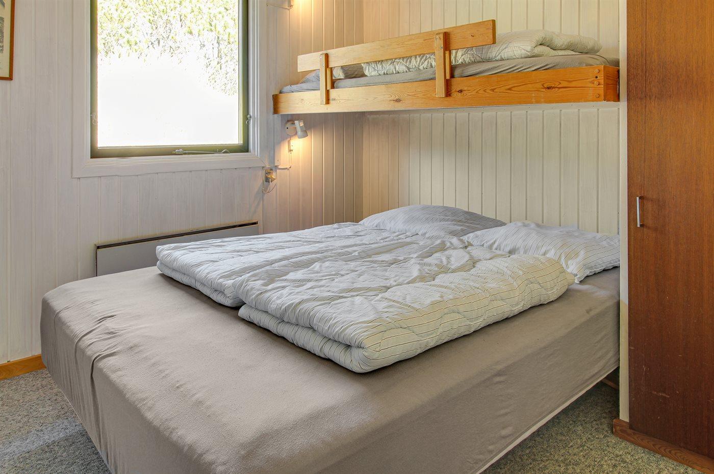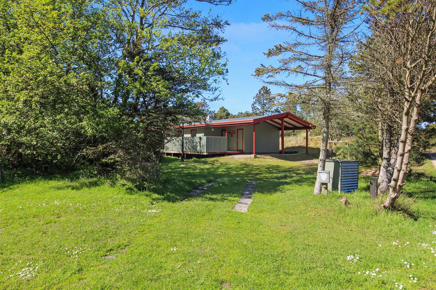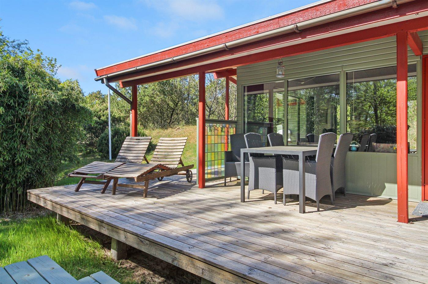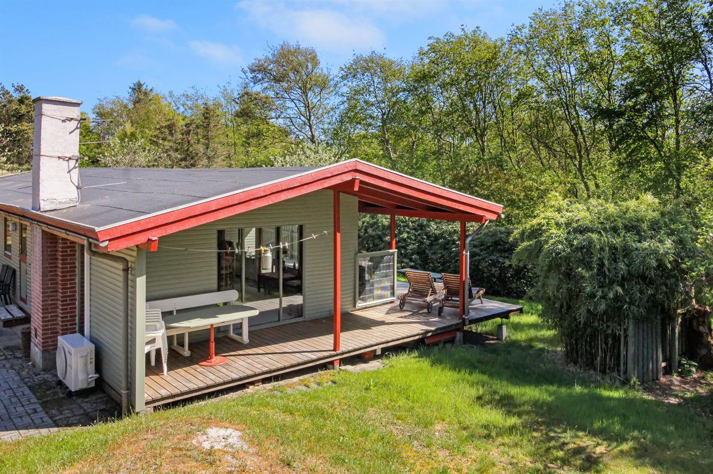 Gepflegtes Ferienhaus aus Holz, 1971 gebaut, auf einem hügeligen Naturgrundstück mit Kiefern und Heide gelegen. Offene und überdachte Terrasse mit Gartenmöbeln. Teppichböden. Die Wände und Decken sind mit Holz verkleidet. Sichtbare Deckenbalken. Badezimmer mit Dusche und Fliesenboden. Die Küche ist u. a. mit Mikrowelle ausgerüstet. Das Wohnzimmer enthält Kaminofen, Radio sowie TV digitalem Satellitenanschluss. Die Schlafplätze des Hauses verteilen sich auf 2 Zimmer mit Doppelbett und 1 mit 1 Einzelbett und 1 Etagenbett. Ein gemütliches Haus, wozu außerdem ein Carport gehört.