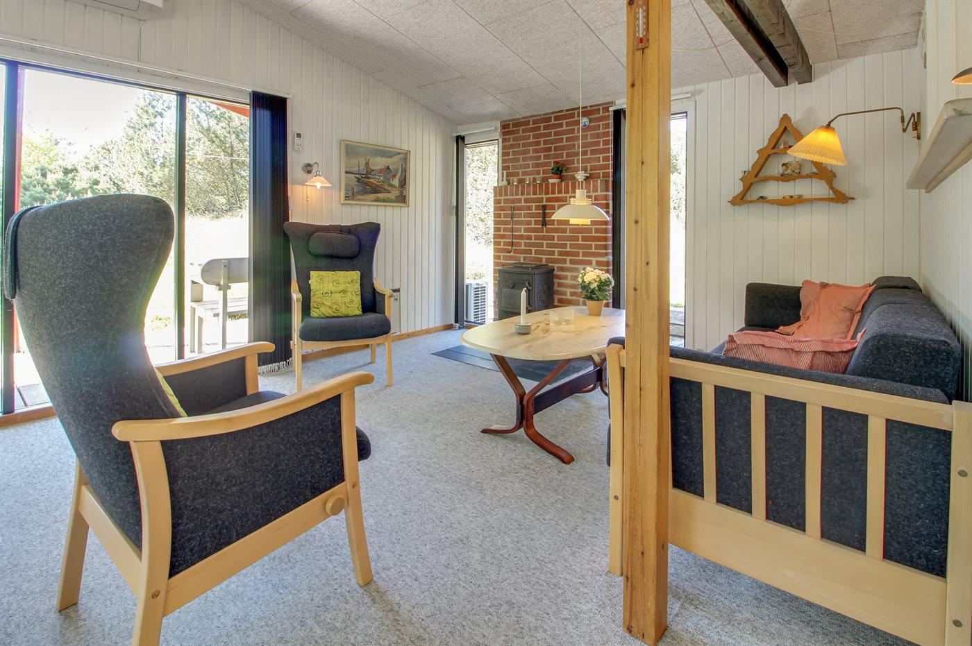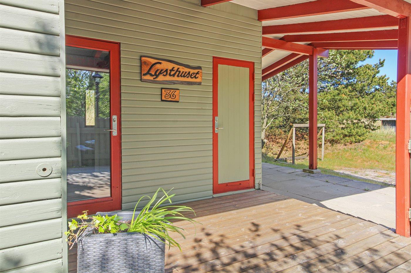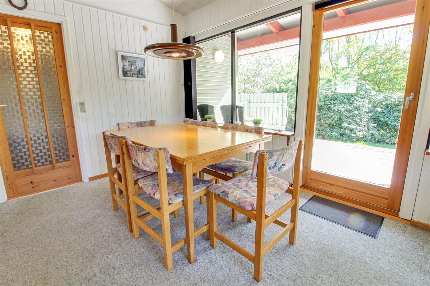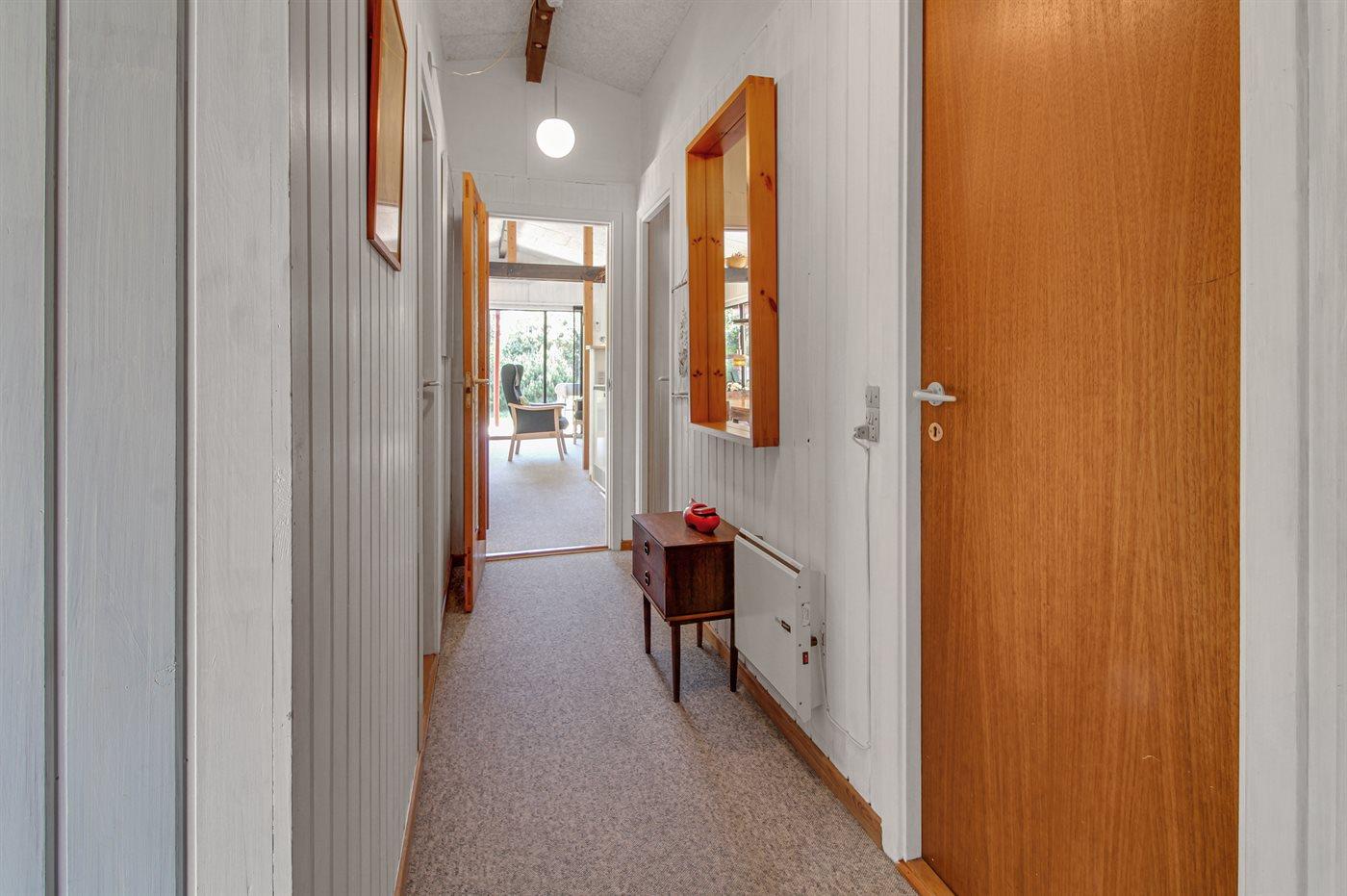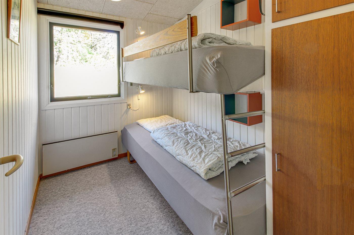 Gepflegtes Ferienhaus aus Holz, 1971 gebaut, auf einem hügeligen Naturgrundstück mit Kiefern und Heide gelegen. Offene und überdachte Terrasse mit Gartenmöbeln. Teppichböden. Die Wände und Decken sind mit Holz verkleidet. Sichtbare Deckenbalken. Badezimmer mit Dusche und Fliesenboden. Die Küche ist u. a. mit Mikrowelle ausgerüstet. Das Wohnzimmer enthält Kaminofen, Radio sowie TV digitalem Satellitenanschluss. Die Schlafplätze des Hauses verteilen sich auf 2 Zimmer mit Doppelbett und 1 mit 1 Einzelbett und 1 Etagenbett. Ein gemütliches Haus, wozu außerdem ein Carport gehört.