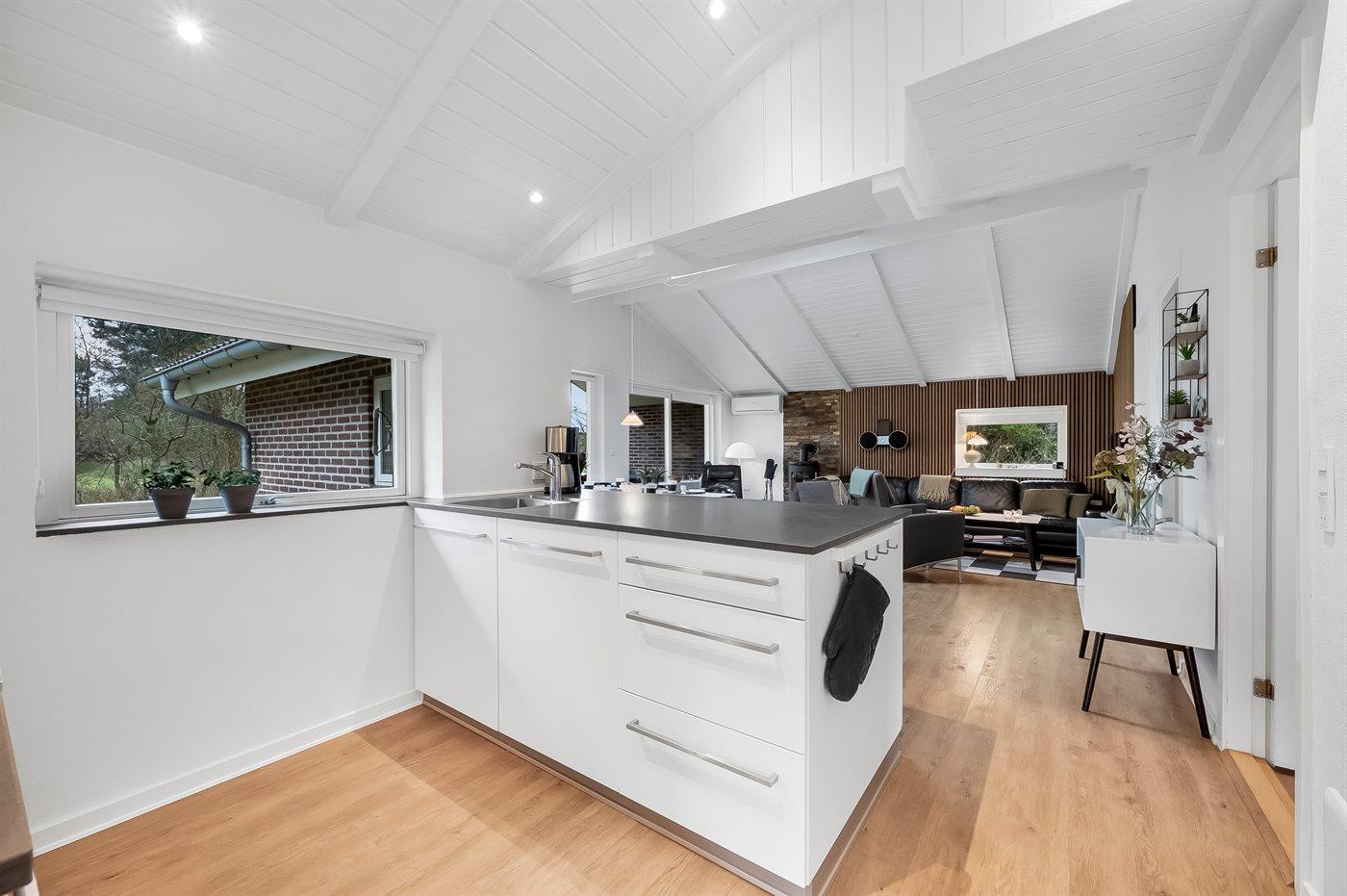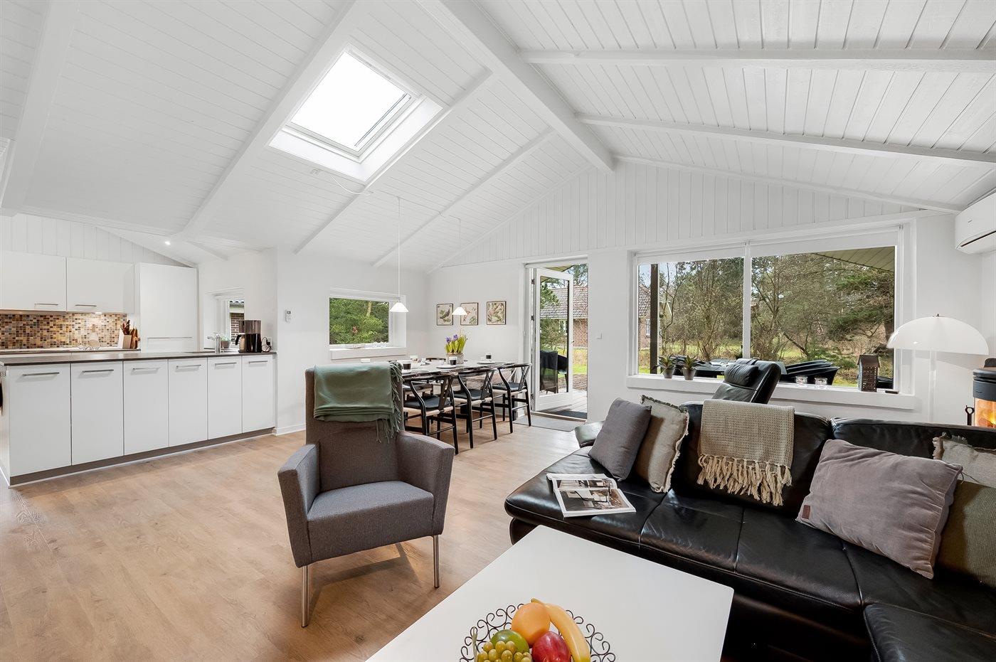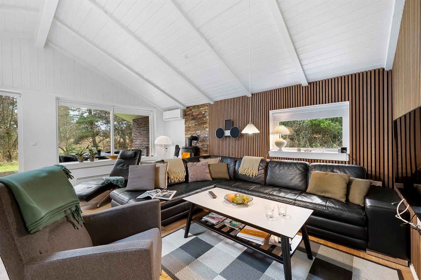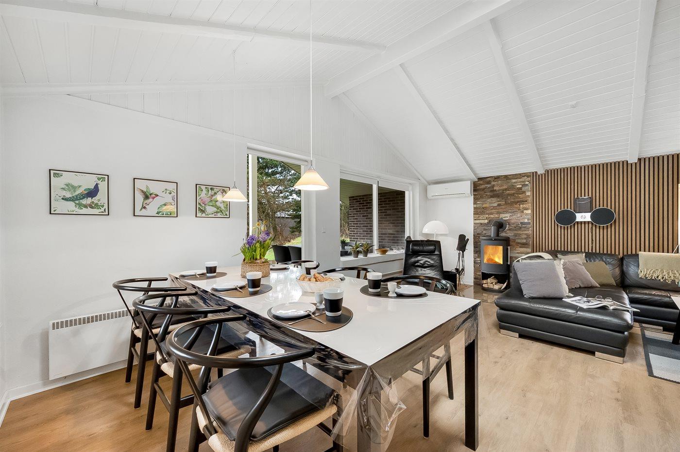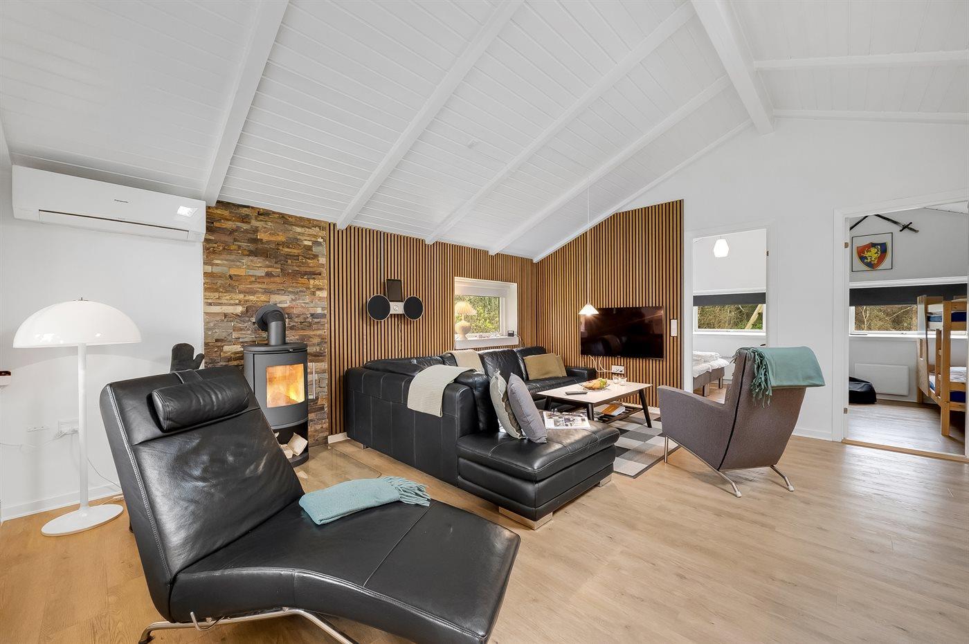 An weiterer Ausstattung können energiesparende Wärmepumpe, Kaminofen, Waschmaschine, Wäschetrockner, kabellose Internetverbindung, 3 Smart-TV´s mit mindestens 4 deutsche und dänische Fernsehsender und DAB-Radio erwähnt werden. Für die jüngsten Feriengäste gibt es Kinderbett und Kinderhochstuhl sowie Sandkasten, Rutsche und 2 Schaukeln auf dem Grundstück.