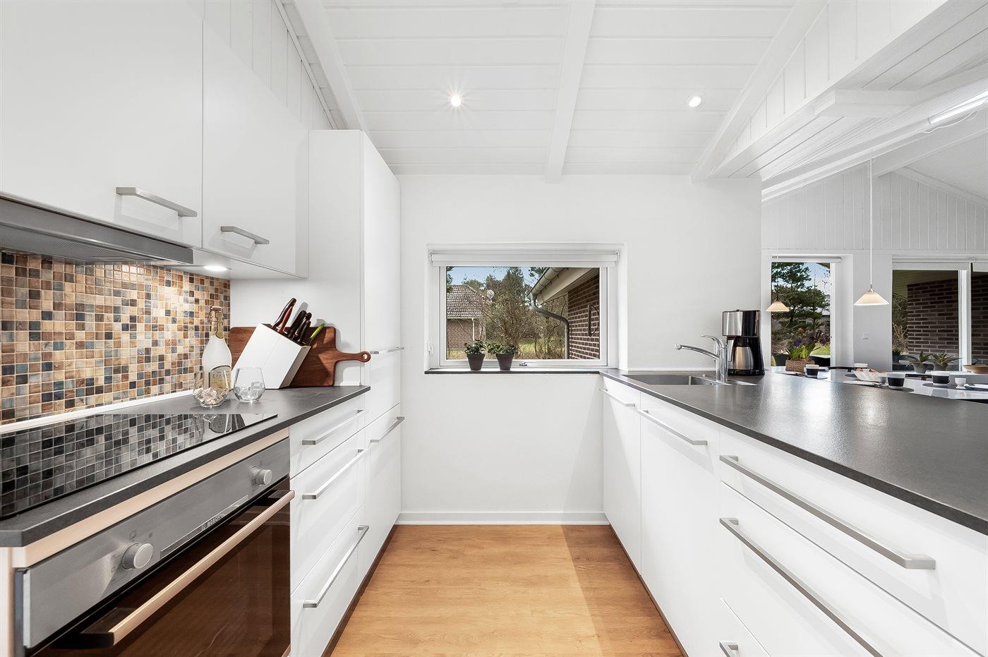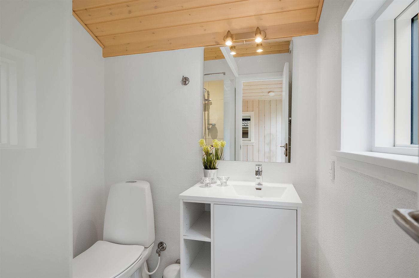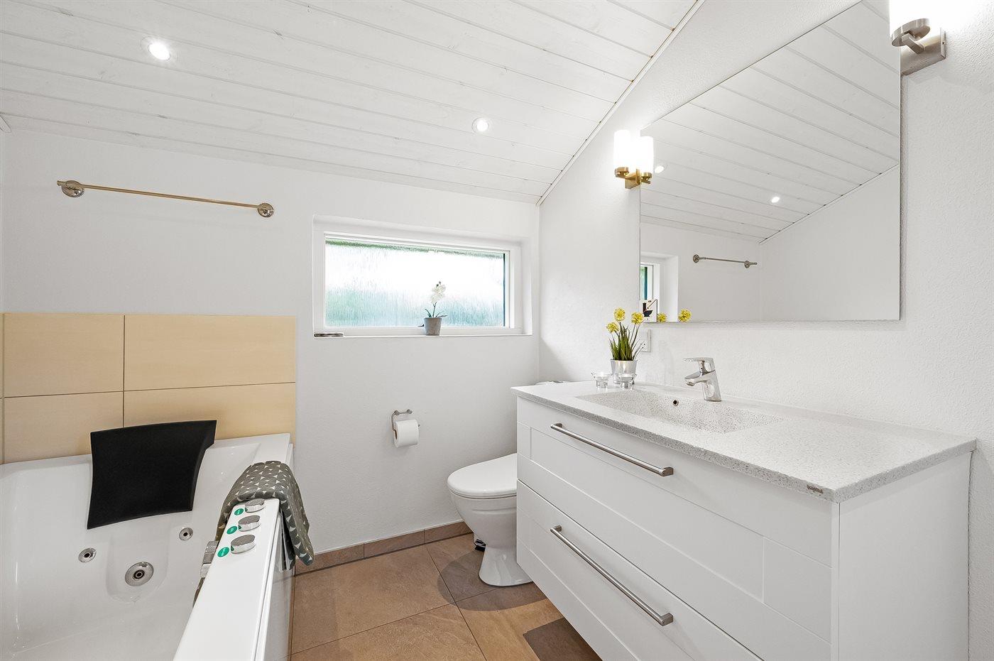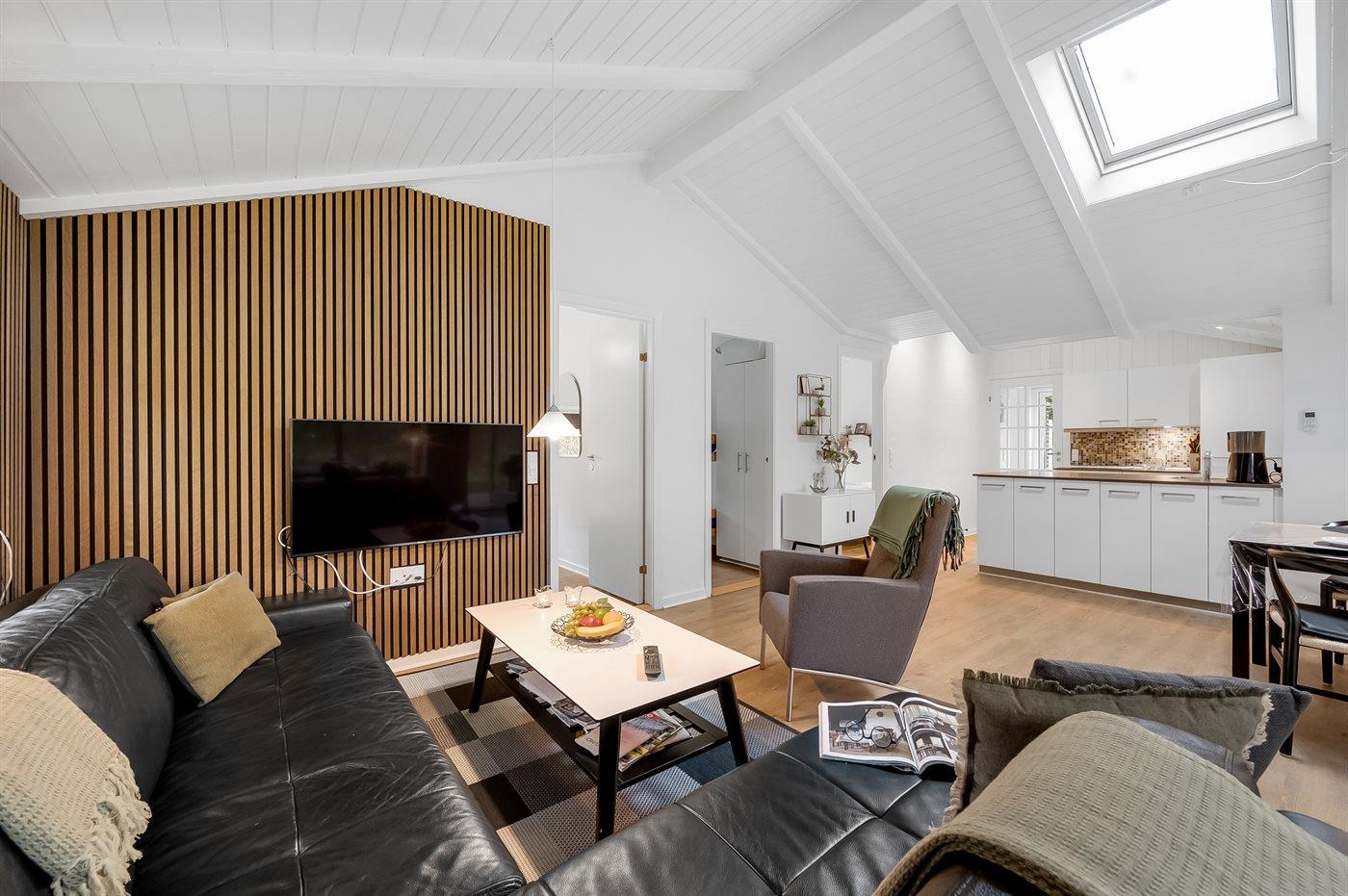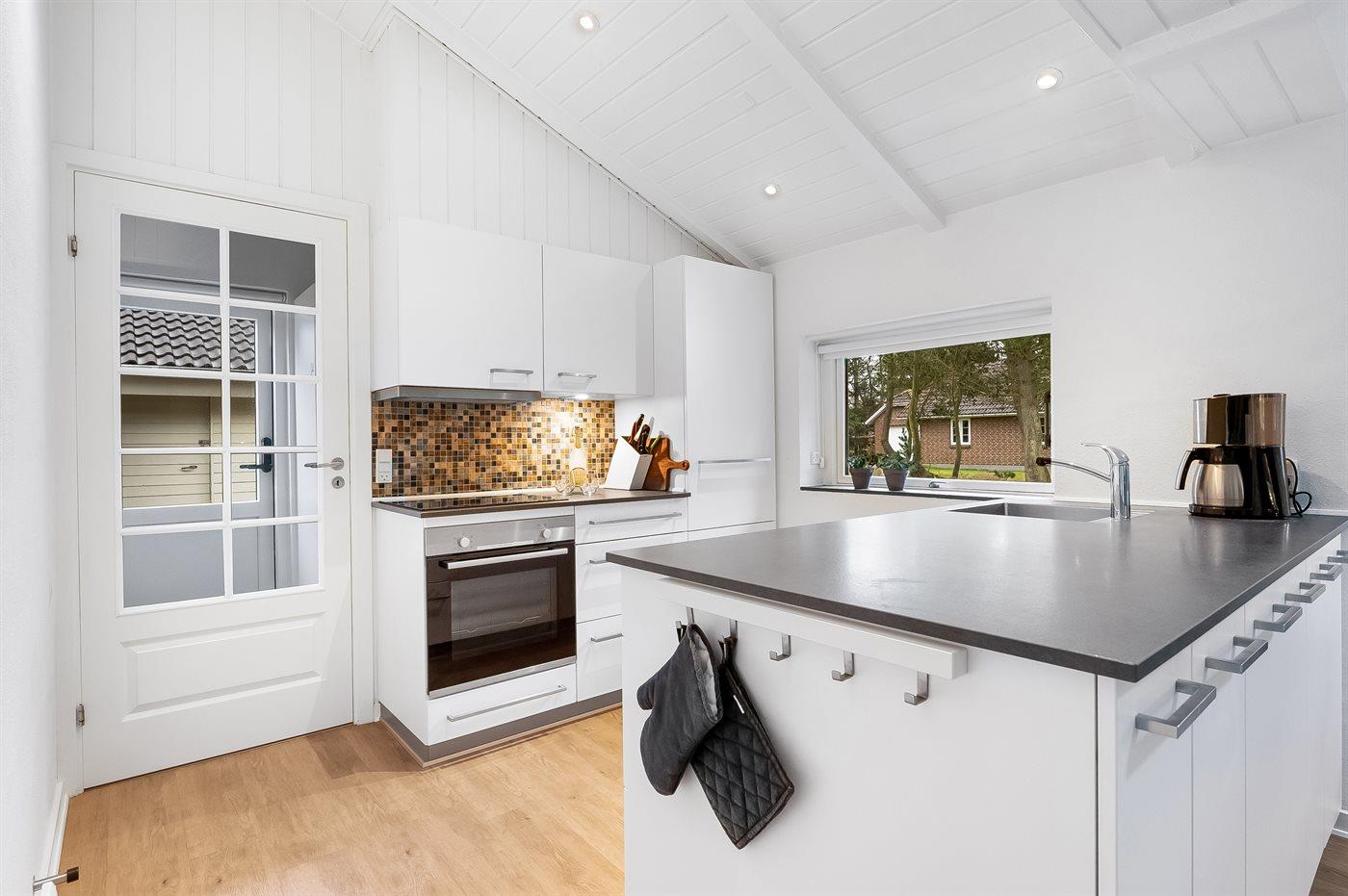 An weiterer Ausstattung können energiesparende Wärmepumpe, Kaminofen, Waschmaschine, Wäschetrockner, kabellose Internetverbindung, 3 Smart-TV´s mit mindestens 4 deutsche und dänische Fernsehsender und DAB-Radio erwähnt werden. Für die jüngsten Feriengäste gibt es Kinderbett und Kinderhochstuhl sowie Sandkasten, Rutsche und 2 Schaukeln auf dem Grundstück.