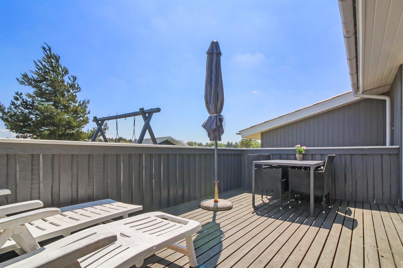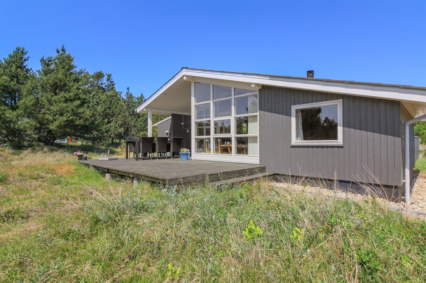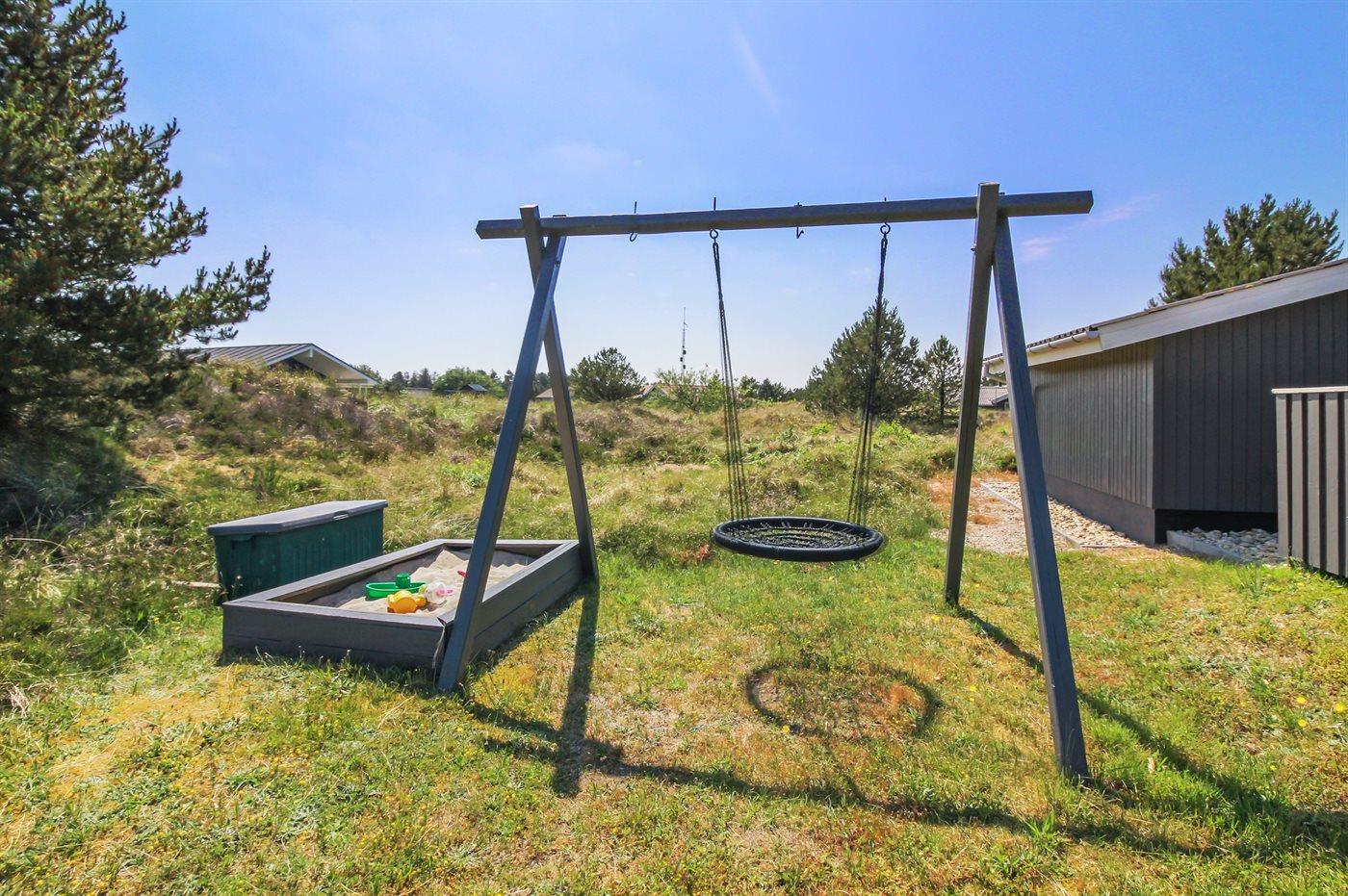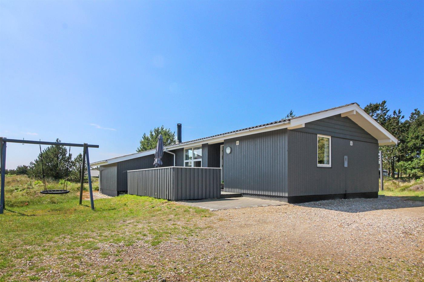 Gemütliches Holzferienhaus in Blåvand mit Terrasse, Kaminofen und kinderfreundlichen Spielmöglichkeiten auf großem Naturgrundstück.