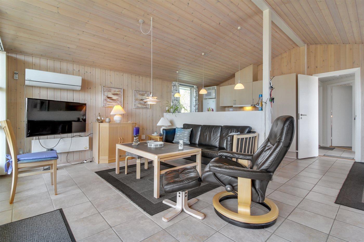 Dieses gemütliche Ferienhaus aus Holz, 1976 gebaut und 2007 renoviert, finden Sie auf einem leicht hügeligen Naturgrundstück mit Gras. Zum Haus gehören sowohl eine offene als auch eine teilweise überdachte Terrassenfläche mit Gartenmöbeln sowie Sandkiste und Schaukel für die Kinder. Innen gibt es Holzwände, hell gebeizte Holzdecken und rustikale Klinkerböden mit Brücken überall. Im Wohnzimmer, das nett möbliert ist, gibt es einen schönen Kaminofen, Stereoanlage mit CD-Spieler, DVD-Spieler und Kabel-TV. Ferner kostenlose, kabellose Internetverbindung vorhanden (Computer ist mitzubringen). Die Küche ist mit Mikrowelle, Geschirrspüler, Waschmaschine sowie Herd mit Umluftofen und Ceran-Feld ausgestattet. Ferner enthält das Haus 3 Schlafzimmer mit je 1 Doppelbett und ein großes Badezimmer mit Duschnische und Fußbodenheizung. Es ist eine energiebesparende Wärmepumpe installiert. Kinderbett und 2 Kinderhochstühle für die Kinder. Das ganze Jahr hindurch ein gutes Ferienhaus.