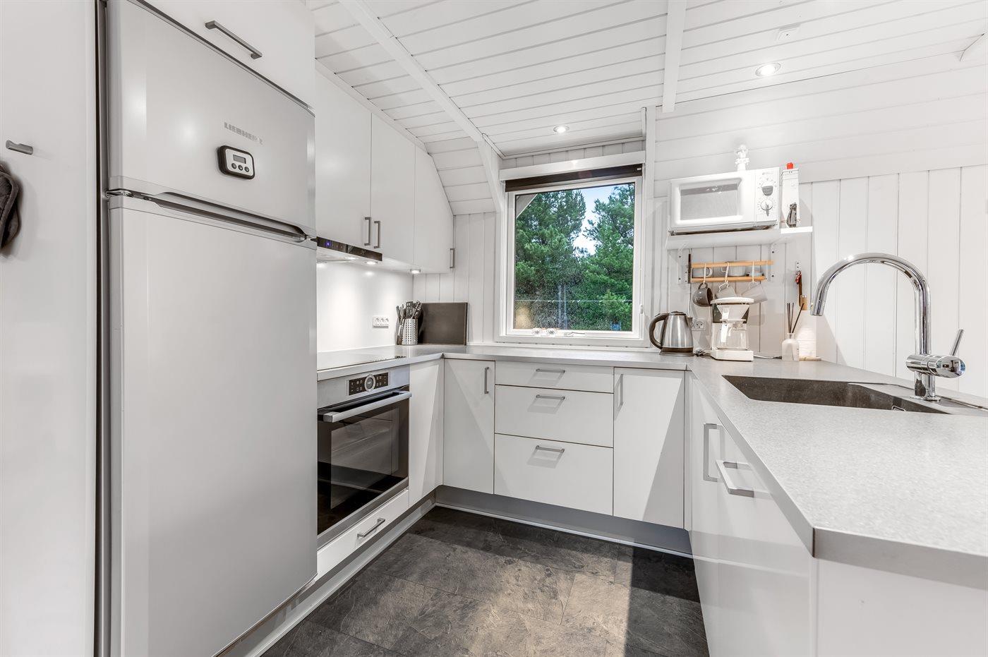 Die Küche ist mit Kühlschrank ausgestattet. Außerdem gibt es 4 Induktions-Kochzonen, Umluftofen, Mikrowelle sowie Geschirrspüler.