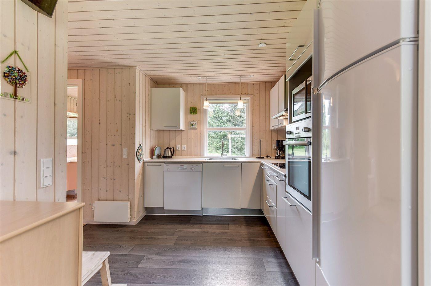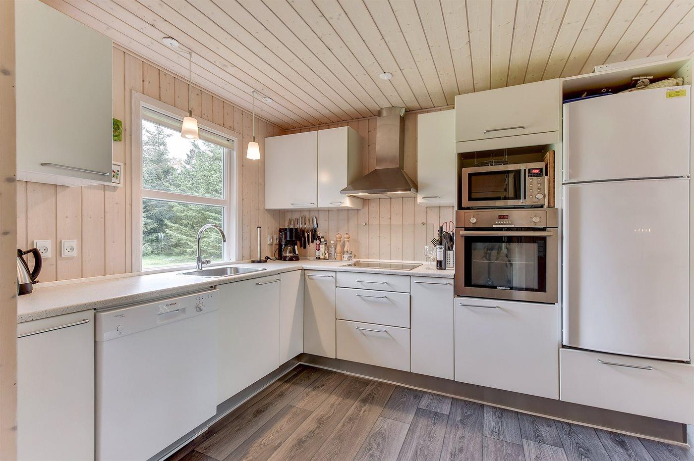 Die Küche ist mit Kühlschrank ausgestattet. Außerdem gibt es 4 Keramik-Kochfelder, Umluftofen, Mikrowelle sowie Geschirrspüler.