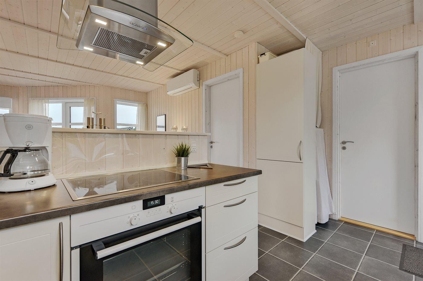Die Küche ist mit Kühlschrank ausgestattet. Außerdem gibt es 4 Keramik-Kochfelder, Umluftofen sowie Geschirrspüler.