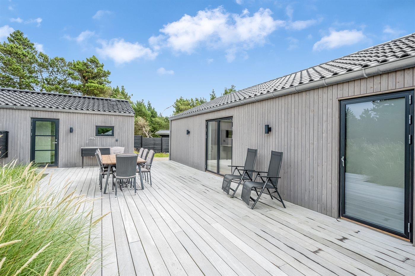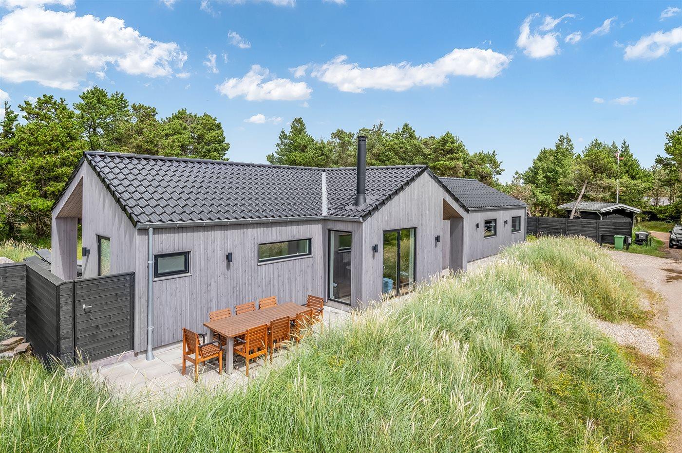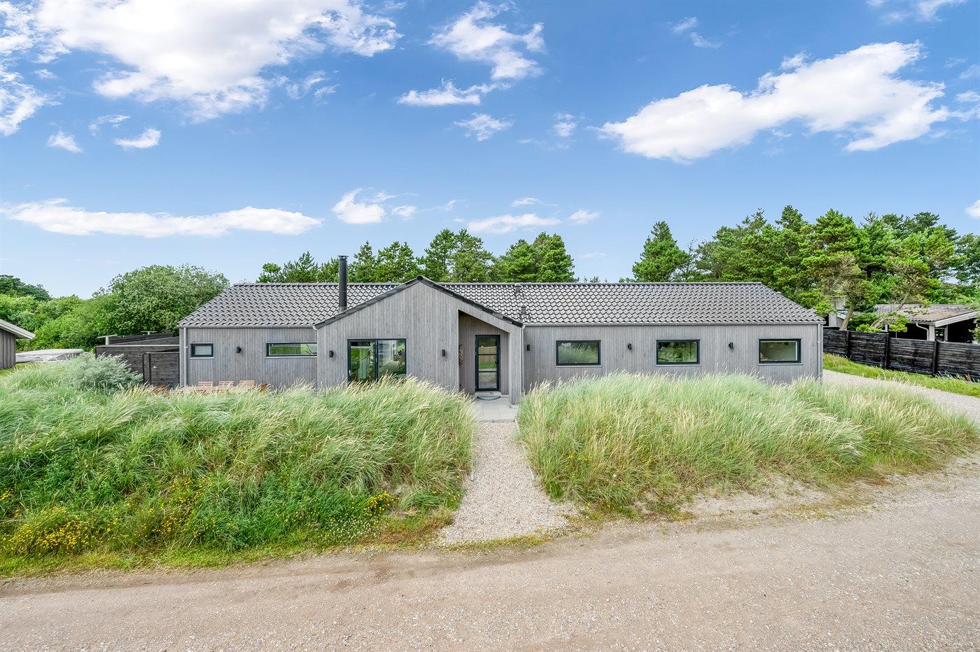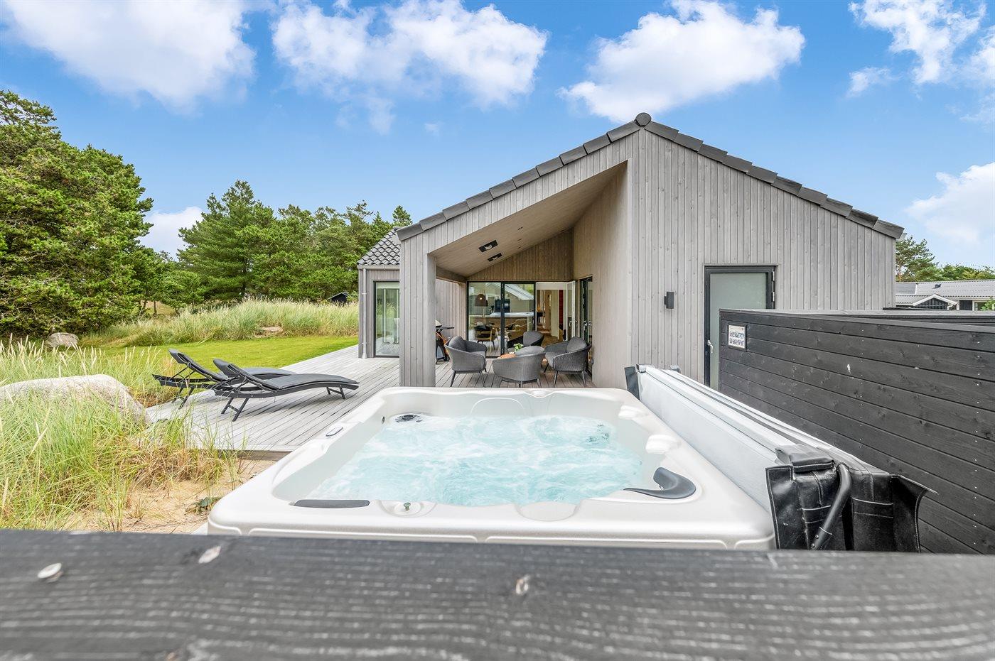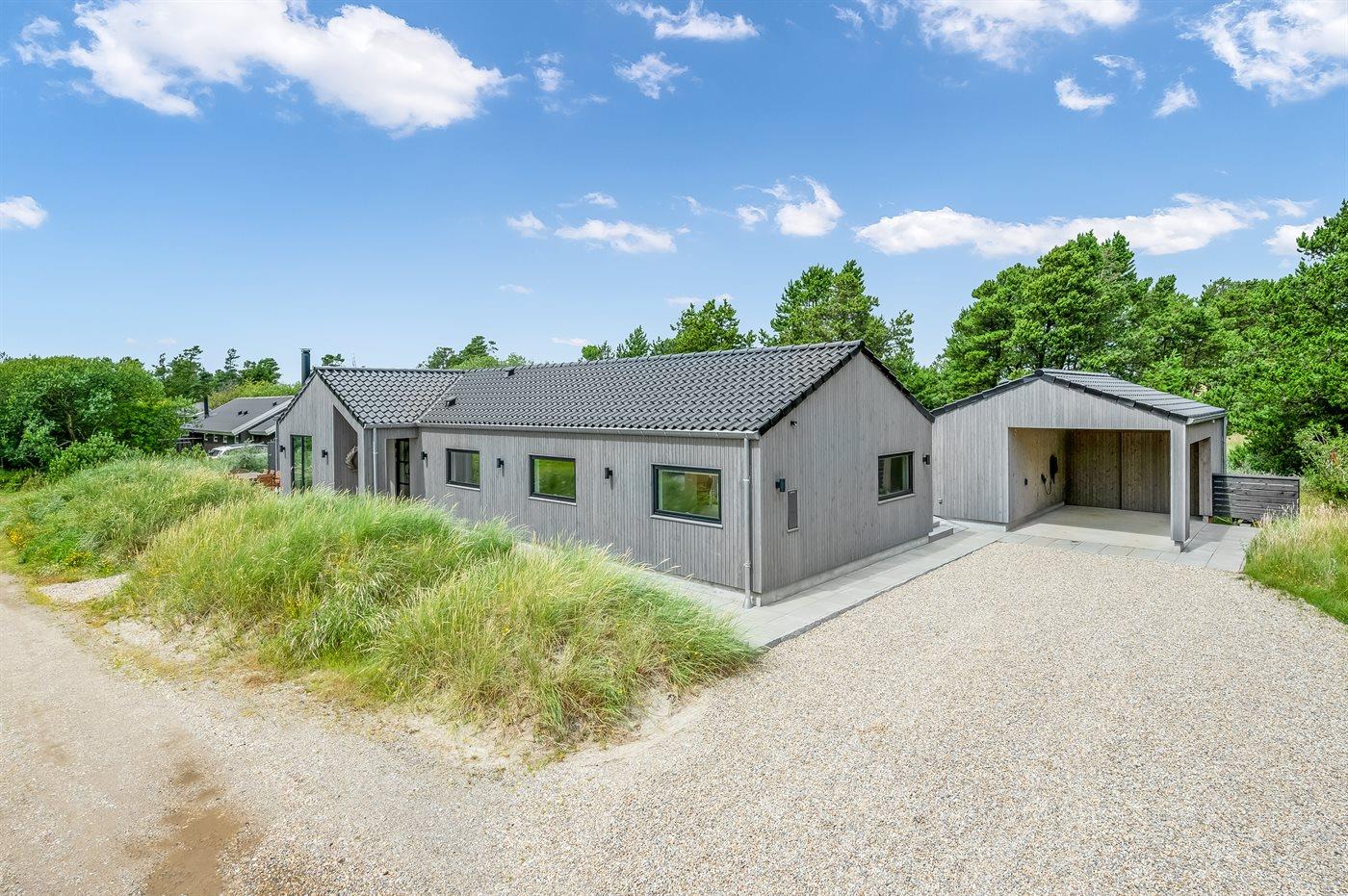 Ein besonders schönes Qualitätsferienhaus in Blåvand, das zu einem schönen, entspannten Familienurlaub einlädt. Das Naturgrundstück ist 1800 m² groß und ruhig gelegen. Das Haus weist eine besonders tolle Ausstattung auf. Wenn Sie gern Zeit im Freien verbringen, stehen Ihnen eine Außenküche mit Grill und eine Außendusche zur Verfügung. Alternativ bietet sich ein Saunagang mit Aussicht auf die umliegende Natur an. Dank des Außenlichts auf der Holzterrasse lassen sich die Tage etwas verlängern. Auf der überdachten Terrasse sorgen Infrarot-Terrassenwärmer für eine angenehme Wärme, die zum Genießen eines temperierten Glas Weins aus dem Weinkühler einlädt. Während des abendlichen Besuchs im Outdoor-Whirlpool haben Sie ganzjährig Blick auf die urige Fichte, die abends beleuchtet werden kann. Bis zum Meer sind es 1800 m. Das nächste Geschäft liegt mit 800 m Entfernung in Laufweite. Das Ferienhaus eignet sich für 8 Personen sowie 1 Kind bis zu 3 Jahren. Die Ferienunterkunft wurde 2021 erbaut und verfügt über eine Fläche von 170 m². Die Ferienunterkunft ist mit 1 energiesparenden Wärmepumpe ausgestattet. Die gesamte Ferienunterkunft verfügt über Fußbodenheizung. Die Küche ist mit einem Kühlschrank, Induktionskochfeld, Backofen, Mikrowelle, Weinkühler und Spülmaschine ausgestattet. Die Ferienunterkunft hat einen separaten Waschraum mit Waschmaschine, Trockner und Tiefkühler mit 50 l Kapazität. Zudem gibt es einen Kamin. Für die ganz Kleinen ist 1 Kinderstuhl, eine Schaukel und ein Sandkasten vorhanden. Im Aktivitätsraum können Sie Pool, Tischtennis und Shuffleboard spielen. Insgesamt gibt es 4 Schlafzimmer. Die Schlafplätze verteilen sich wie folgt: 6 Schlafplätze in Doppelbetten und 2 Schlafplätze in Einzelbetten. Zudem gibt es 1 Kinderbett. Es gibt 2 Badezimmer mit Duschnische, Fußbodenheizung, Nachtbeleuchtung und 2 Toiletten. In der Ferienunterkunft gibt es 2 Smart-TVs und 1 Bluetooth-Lautsprecher. Sie empfangen mindestens 4 dänische Sender. 1–3 schwedische Sender. 1–3 norwegische Sender. Mindestens 4 deutsche Sender. WLAN ist vorhanden. Es gibt einen Geräteraum und ein Carport mit Lademöglichkeit für E-Autos. Es gibt Parkmöglichkeiten an der Ferienunterkunft. Das Haus verfügt über eine Lüftungsanlage mit Pollenfilter. Wenn Ihnen der Sinn nach ungestörter Ruhe steht, lässt sich das WLAN im Eingangsbereich ausschalten.