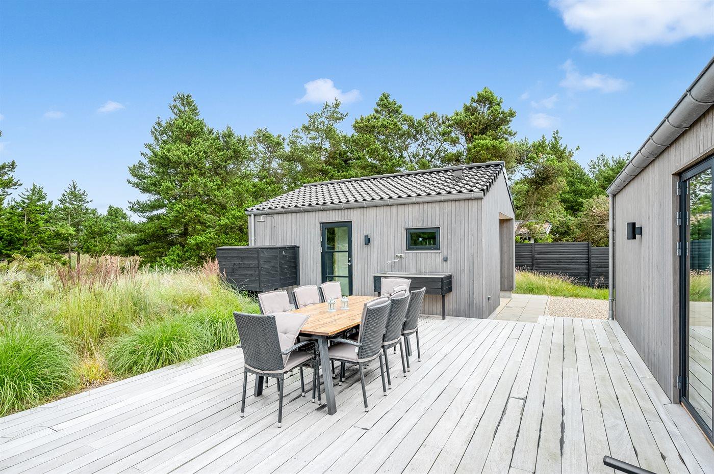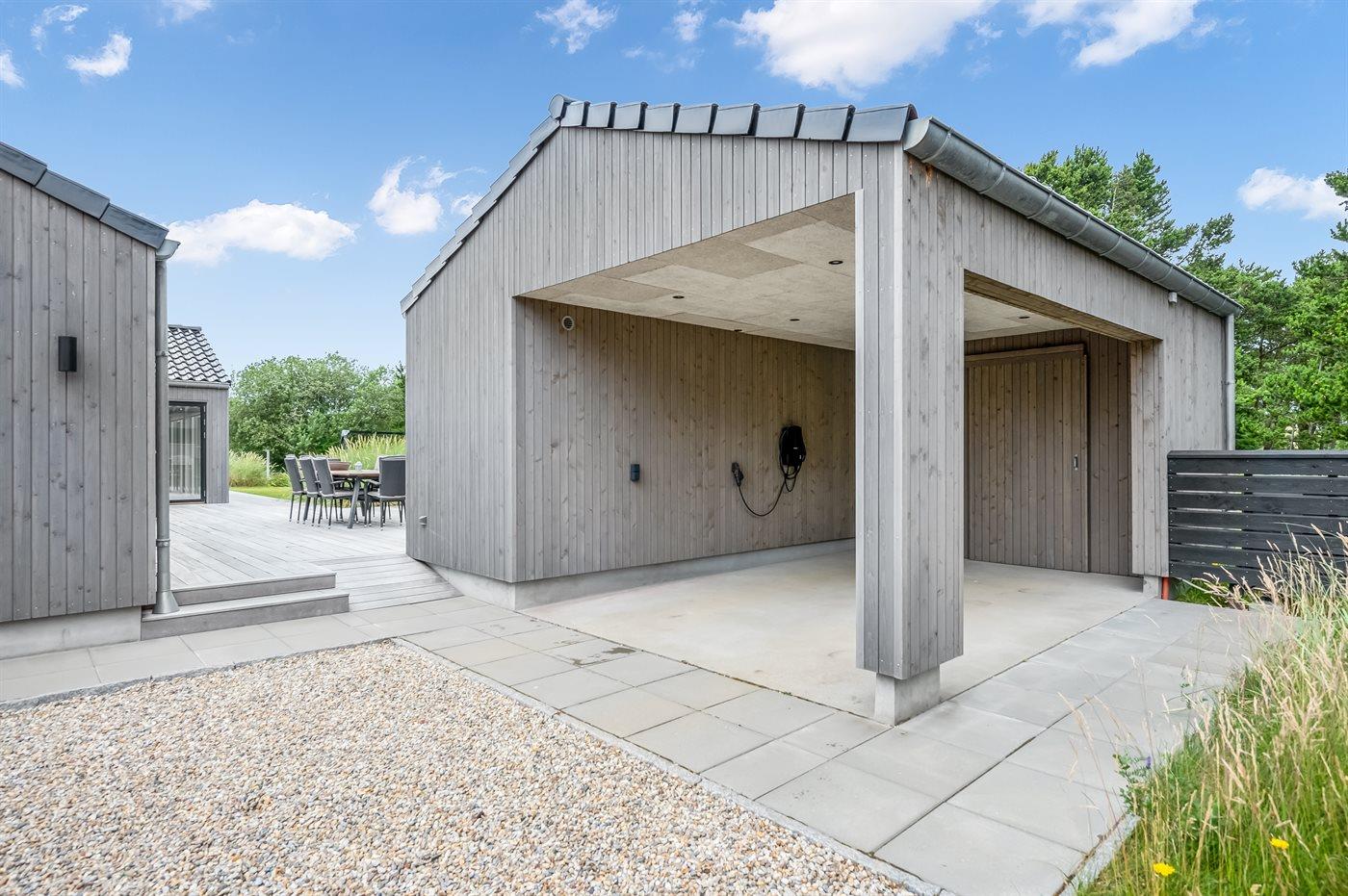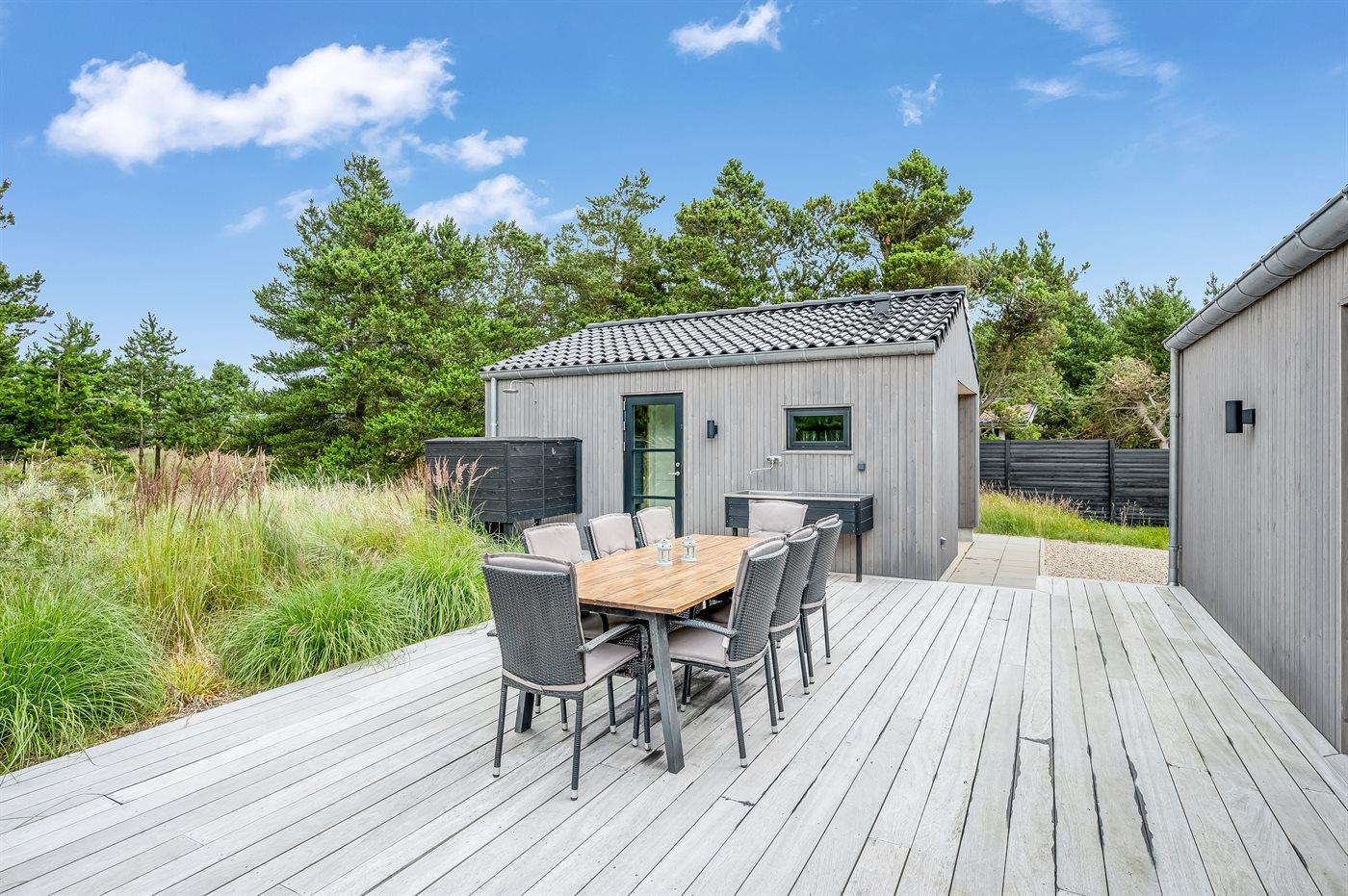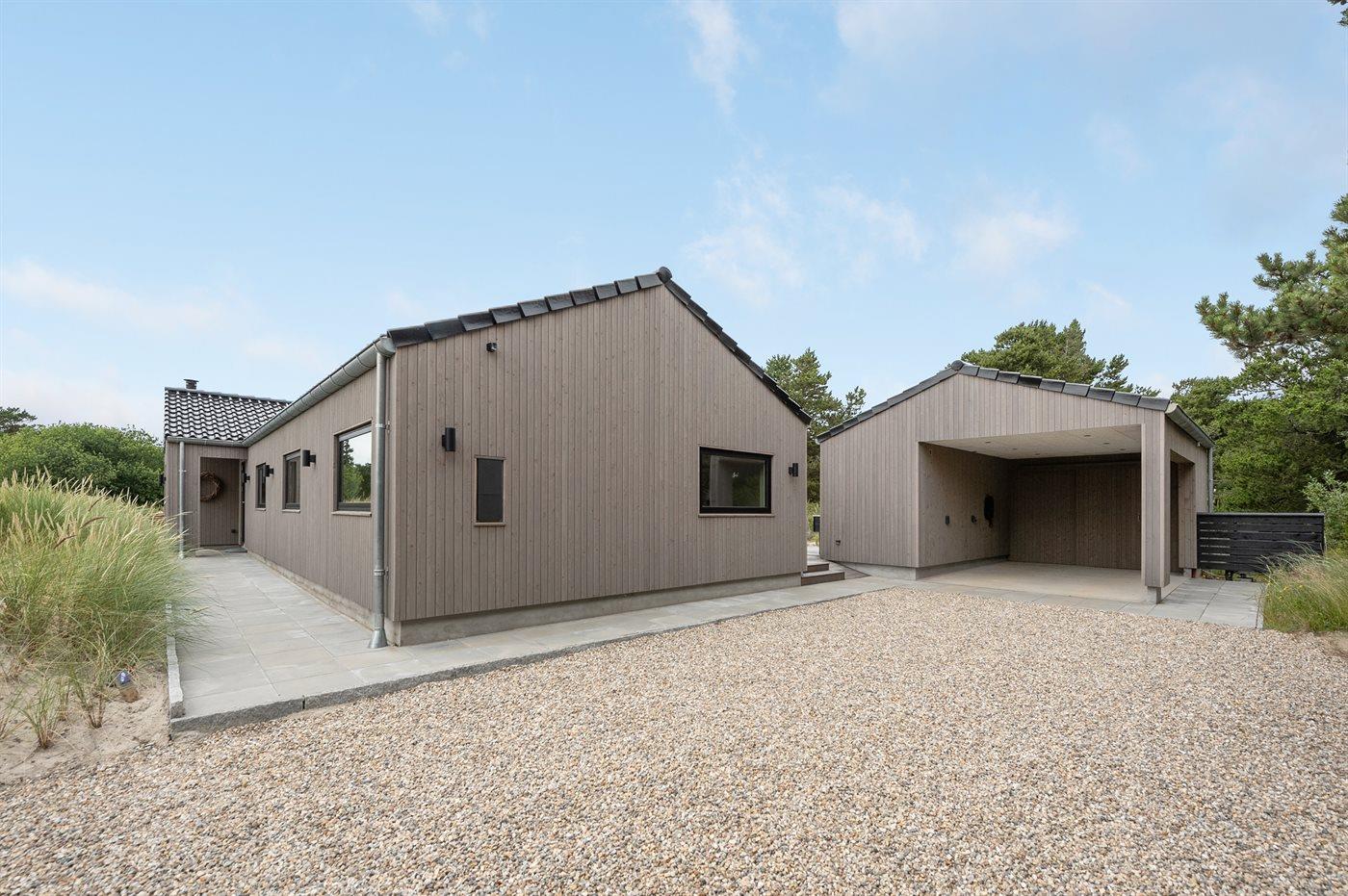 Ein besonders schönes Qualitätsferienhaus in Blåvand, das zu einem schönen, entspannten Familienurlaub einlädt. Das Naturgrundstück ist 1800 m² groß und ruhig gelegen. Das Haus weist eine besonders tolle Ausstattung auf. Wenn Sie gern Zeit im Freien verbringen, stehen Ihnen eine Außenküche mit Grill und eine Außendusche zur Verfügung. Alternativ bietet sich ein Saunagang mit Aussicht auf die umliegende Natur an. Dank des Außenlichts auf der Holzterrasse lassen sich die Tage etwas verlängern. Auf der überdachten Terrasse sorgen Infrarot-Terrassenwärmer für eine angenehme Wärme, die zum Genießen eines temperierten Glas Weins aus dem Weinkühler einlädt. Während des abendlichen Besuchs im Outdoor-Whirlpool haben Sie ganzjährig Blick auf die urige Fichte, die abends beleuchtet werden kann. Bis zum Meer sind es 1800 m. Das nächste Geschäft liegt mit 800 m Entfernung in Laufweite. Das Ferienhaus eignet sich für 8 Personen sowie 1 Kind bis zu 3 Jahren. Die Ferienunterkunft wurde 2021 erbaut und verfügt über eine Fläche von 170 m². Die Ferienunterkunft ist mit 1 energiesparenden Wärmepumpe ausgestattet. Die gesamte Ferienunterkunft verfügt über Fußbodenheizung. Die Küche ist mit einem Kühlschrank, Induktionskochfeld, Backofen, Mikrowelle, Weinkühler und Spülmaschine ausgestattet. Die Ferienunterkunft hat einen separaten Waschraum mit Waschmaschine, Trockner und Tiefkühler mit 50 l Kapazität. Zudem gibt es einen Kamin. Für die ganz Kleinen ist 1 Kinderstuhl, eine Schaukel und ein Sandkasten vorhanden. Im Aktivitätsraum können Sie Pool, Tischtennis und Shuffleboard spielen. Insgesamt gibt es 4 Schlafzimmer. Die Schlafplätze verteilen sich wie folgt: 6 Schlafplätze in Doppelbetten und 2 Schlafplätze in Einzelbetten. Zudem gibt es 1 Kinderbett. Es gibt 2 Badezimmer mit Duschnische, Fußbodenheizung, Nachtbeleuchtung und 2 Toiletten. In der Ferienunterkunft gibt es 2 Smart-TVs und 1 Bluetooth-Lautsprecher. Sie empfangen mindestens 4 dänische Sender. 1–3 schwedische Sender. 1–3 norwegische Sender. Mindestens 4 deutsche Sender. WLAN ist vorhanden. Es gibt einen Geräteraum und ein Carport mit Lademöglichkeit für E-Autos. Es gibt Parkmöglichkeiten an der Ferienunterkunft. Das Haus verfügt über eine Lüftungsanlage mit Pollenfilter. Wenn Ihnen der Sinn nach ungestörter Ruhe steht, lässt sich das WLAN im Eingangsbereich ausschalten.