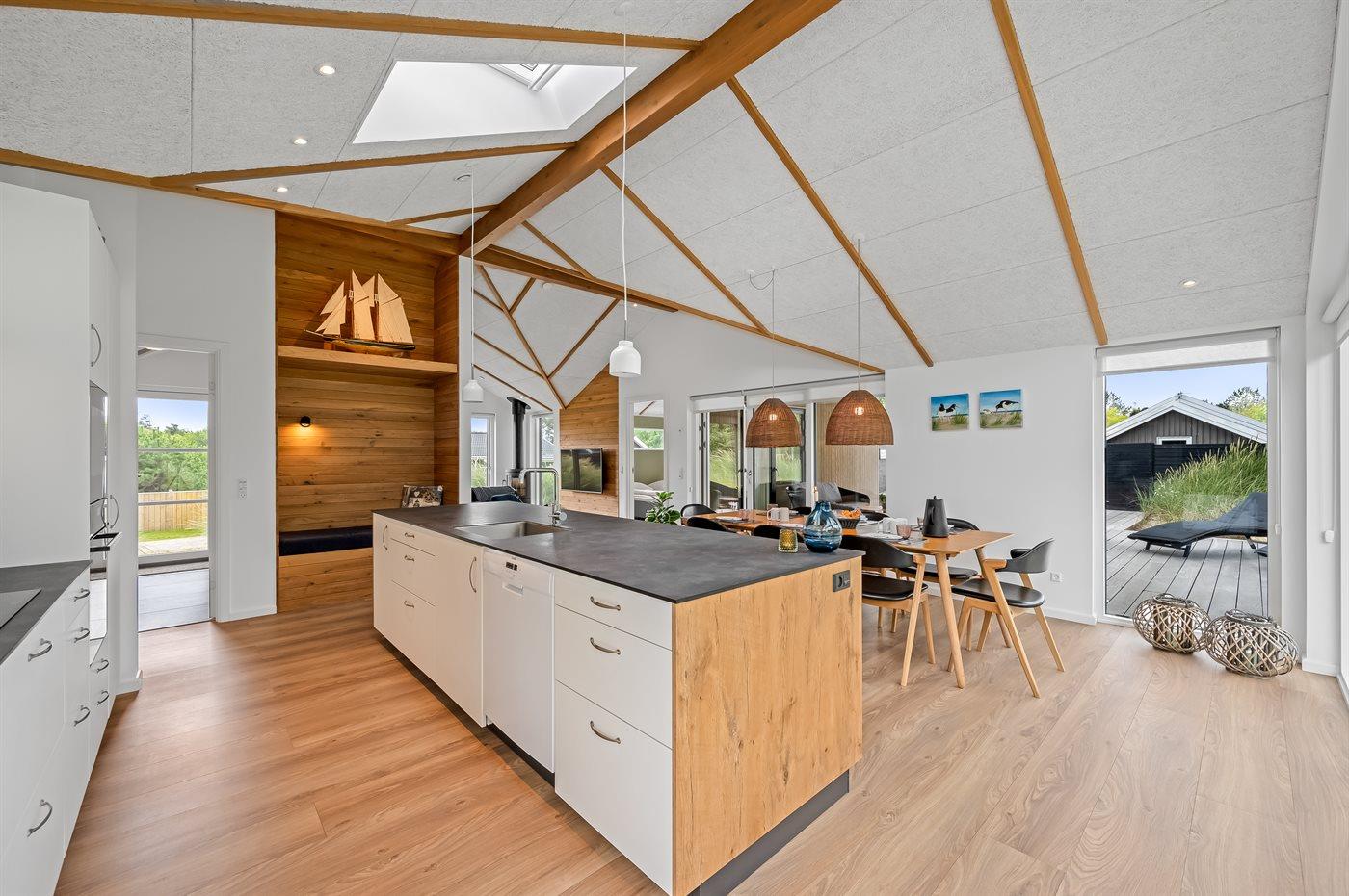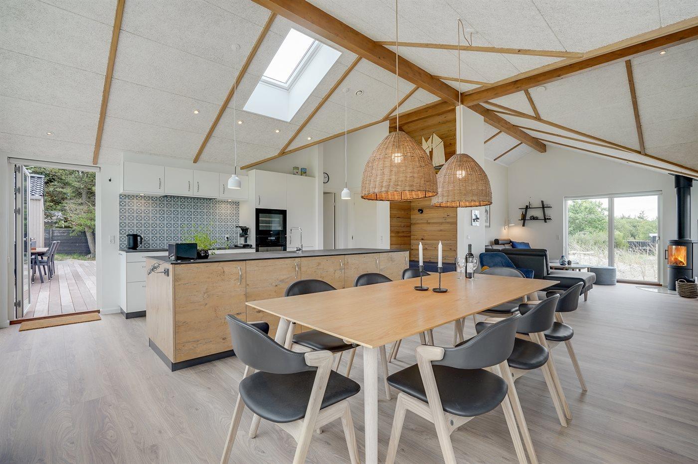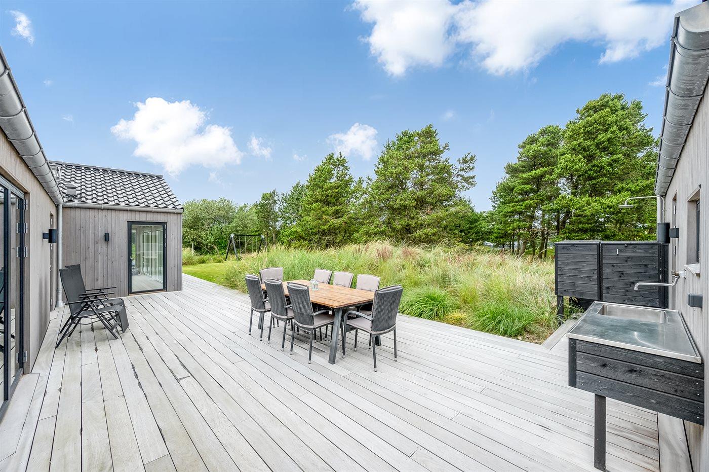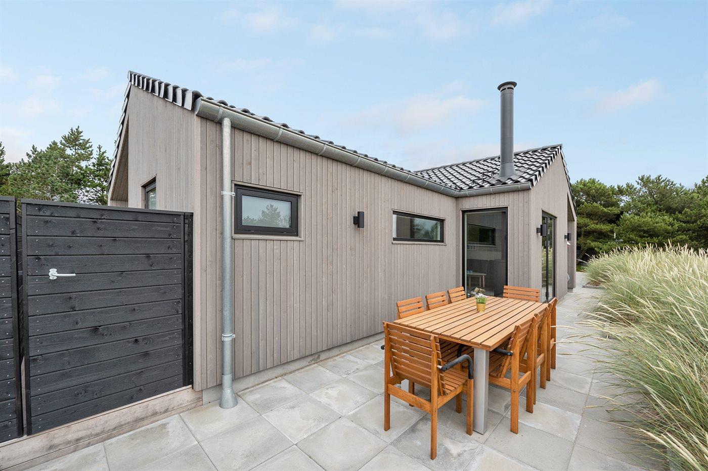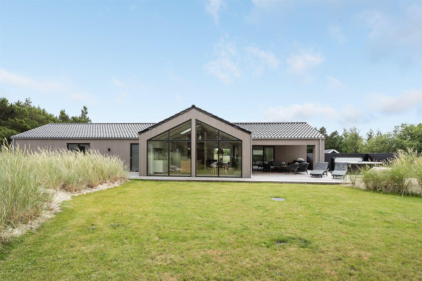 Ein besonders schönes Qualitätsferienhaus in Blåvand, das zu einem schönen, entspannten Familienurlaub einlädt. Das Naturgrundstück ist 1800 m² groß und ruhig gelegen. Das Haus weist eine besonders tolle Ausstattung auf. Wenn Sie gern Zeit im Freien verbringen, stehen Ihnen eine Außenküche mit Grill und eine Außendusche zur Verfügung. Alternativ bietet sich ein Saunagang mit Aussicht auf die umliegende Natur an. Dank des Außenlichts auf der Holzterrasse lassen sich die Tage etwas verlängern. Auf der überdachten Terrasse sorgen Infrarot-Terrassenwärmer für eine angenehme Wärme, die zum Genießen eines temperierten Glas Weins aus dem Weinkühler einlädt. Während des abendlichen Besuchs im Outdoor-Whirlpool haben Sie ganzjährig Blick auf die urige Fichte, die abends beleuchtet werden kann. Bis zum Meer sind es 1800 m. Das nächste Geschäft liegt mit 800 m Entfernung in Laufweite. Das Ferienhaus eignet sich für 8 Personen sowie 1 Kind bis zu 3 Jahren. Die Ferienunterkunft wurde 2021 erbaut und verfügt über eine Fläche von 170 m². Die Ferienunterkunft ist mit 1 energiesparenden Wärmepumpe ausgestattet. Die gesamte Ferienunterkunft verfügt über Fußbodenheizung. Die Küche ist mit einem Kühlschrank, Induktionskochfeld, Backofen, Mikrowelle, Weinkühler und Spülmaschine ausgestattet. Die Ferienunterkunft hat einen separaten Waschraum mit Waschmaschine, Trockner und Tiefkühler mit 50 l Kapazität. Zudem gibt es einen Kamin. Für die ganz Kleinen ist 1 Kinderstuhl, eine Schaukel und ein Sandkasten vorhanden. Im Aktivitätsraum können Sie Pool, Tischtennis und Shuffleboard spielen. Insgesamt gibt es 4 Schlafzimmer. Die Schlafplätze verteilen sich wie folgt: 6 Schlafplätze in Doppelbetten und 2 Schlafplätze in Einzelbetten. Zudem gibt es 1 Kinderbett. Es gibt 2 Badezimmer mit Duschnische, Fußbodenheizung, Nachtbeleuchtung und 2 Toiletten. In der Ferienunterkunft gibt es 2 Smart-TVs und 1 Bluetooth-Lautsprecher. Sie empfangen mindestens 4 dänische Sender. 1–3 schwedische Sender. 1–3 norwegische Sender. Mindestens 4 deutsche Sender. WLAN ist vorhanden. Es gibt einen Geräteraum und ein Carport mit Lademöglichkeit für E-Autos. Es gibt Parkmöglichkeiten an der Ferienunterkunft. Das Haus verfügt über eine Lüftungsanlage mit Pollenfilter. Wenn Ihnen der Sinn nach ungestörter Ruhe steht, lässt sich das WLAN im Eingangsbereich ausschalten.