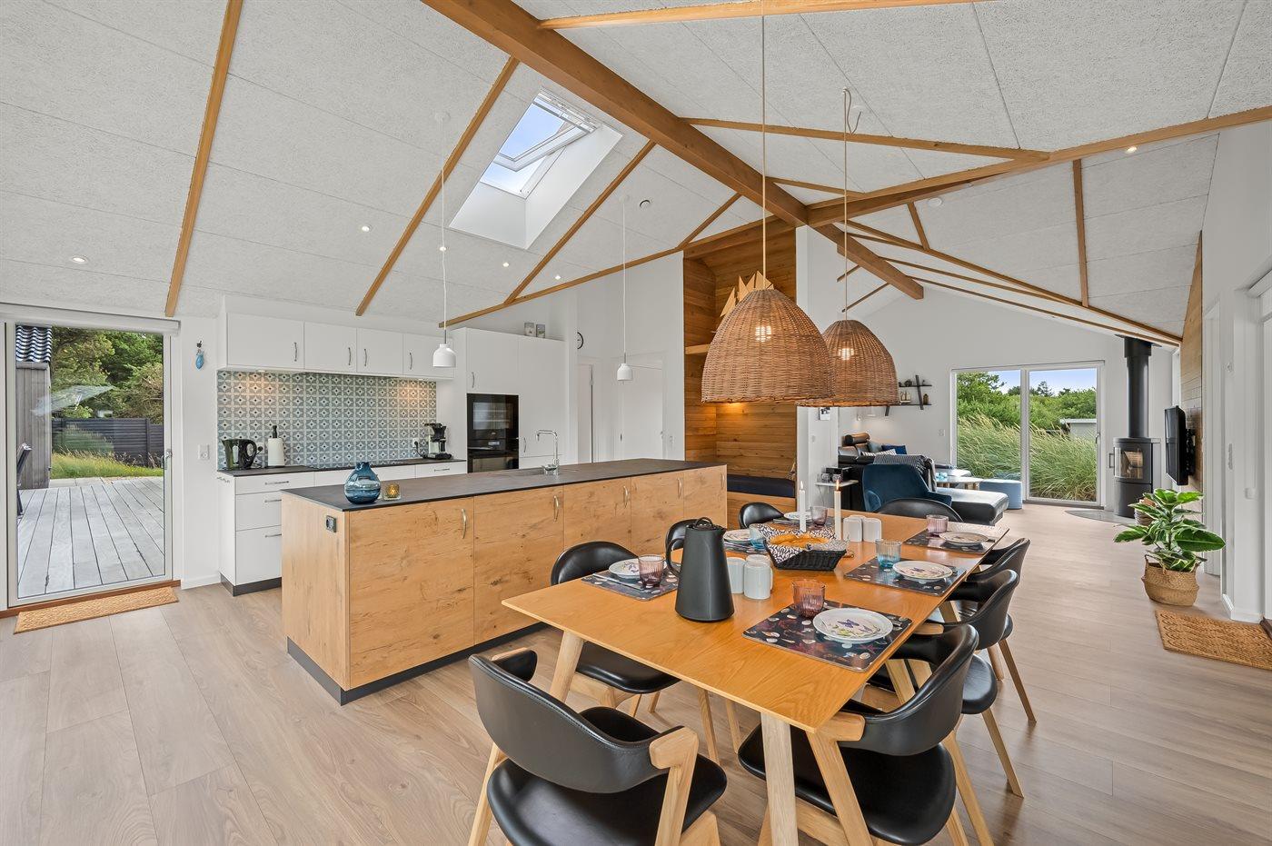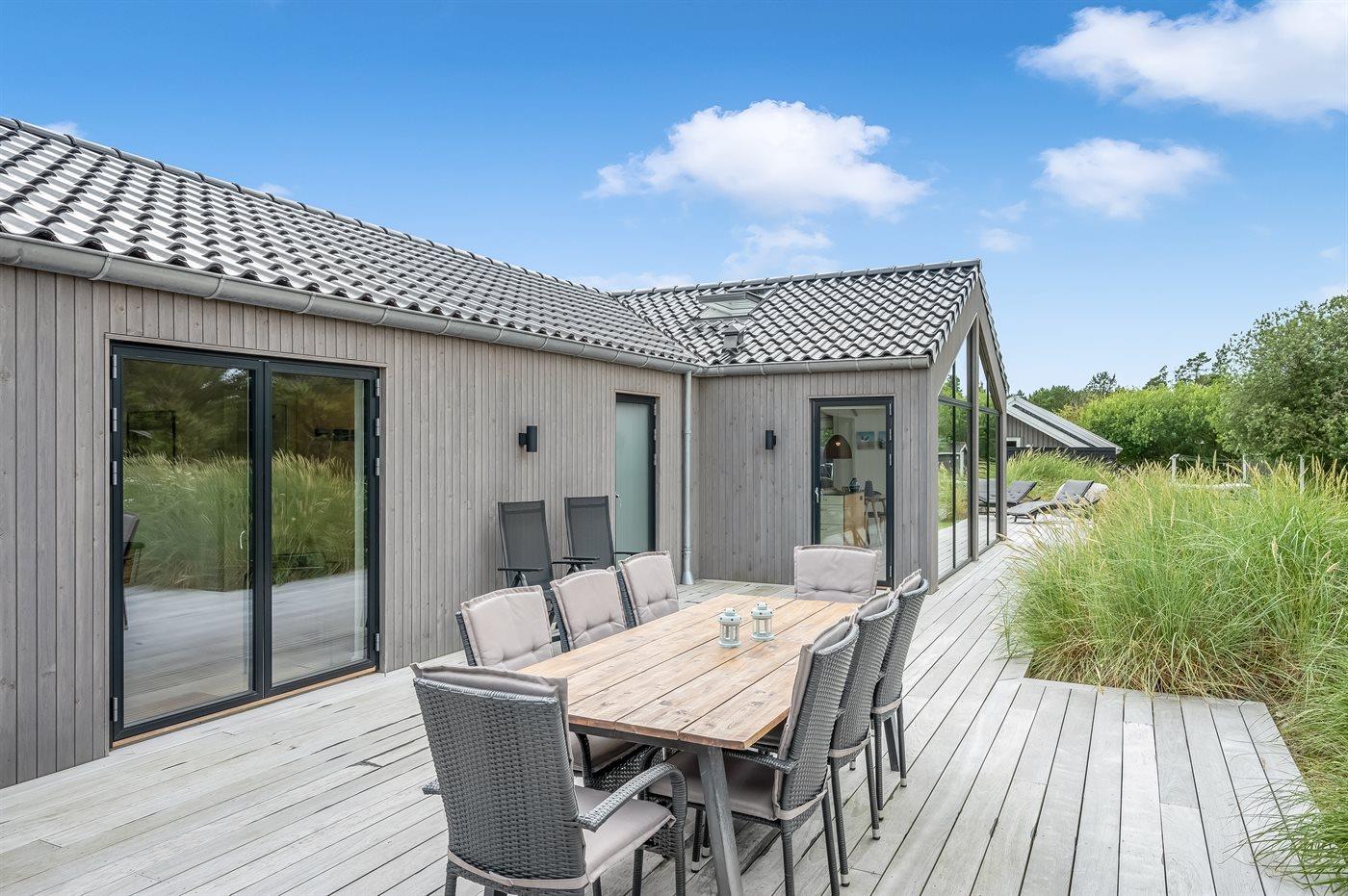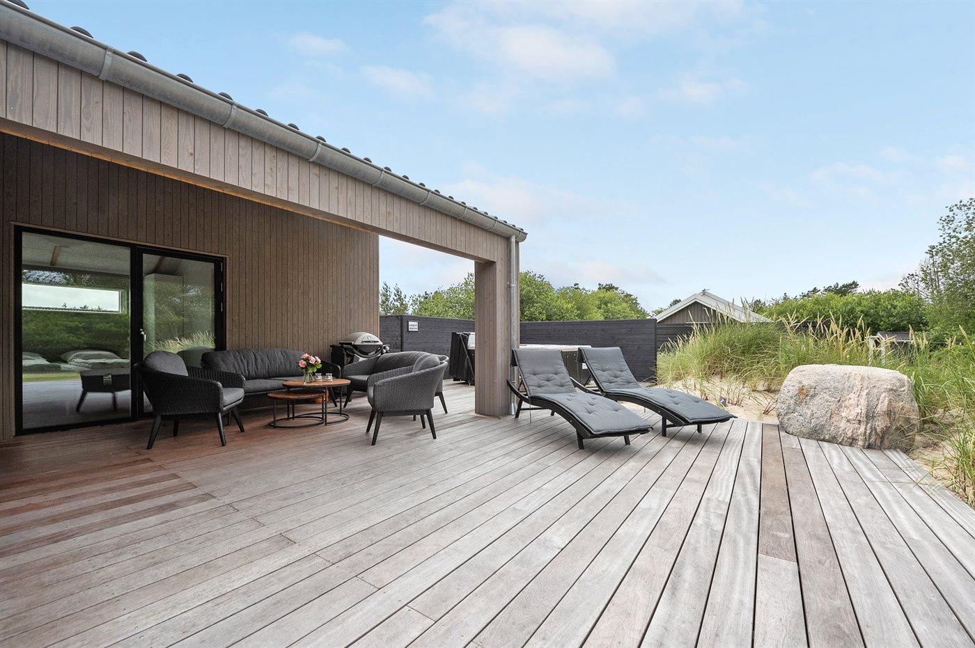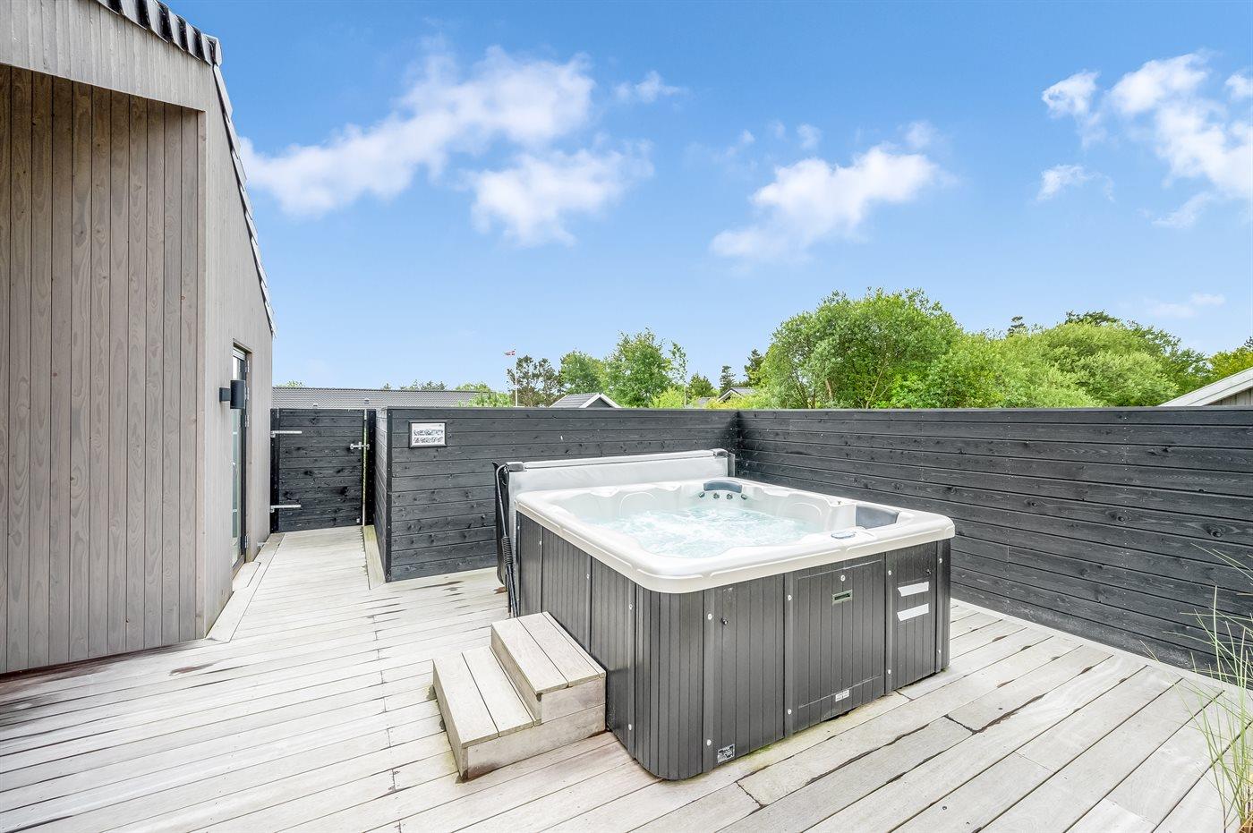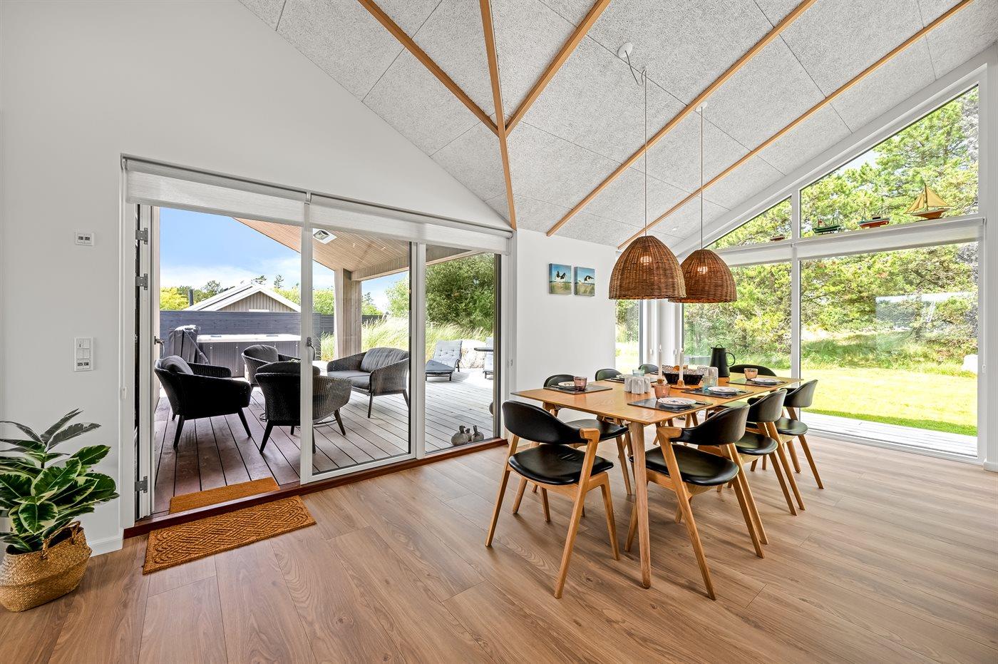 Ein besonders schönes Qualitätsferienhaus in Blåvand, das zu einem schönen, entspannten Familienurlaub einlädt. Das Naturgrundstück ist 1800 m² groß und ruhig gelegen. Das Haus weist eine besonders tolle Ausstattung auf. Wenn Sie gern Zeit im Freien verbringen, stehen Ihnen eine Außenküche mit Grill und eine Außendusche zur Verfügung. Alternativ bietet sich ein Saunagang mit Aussicht auf die umliegende Natur an. Dank des Außenlichts auf der Holzterrasse lassen sich die Tage etwas verlängern. Auf der überdachten Terrasse sorgen Infrarot-Terrassenwärmer für eine angenehme Wärme, die zum Genießen eines temperierten Glas Weins aus dem Weinkühler einlädt. Während des abendlichen Besuchs im Outdoor-Whirlpool haben Sie ganzjährig Blick auf die urige Fichte, die abends beleuchtet werden kann. Bis zum Meer sind es 1800 m. Das nächste Geschäft liegt mit 800 m Entfernung in Laufweite. Das Ferienhaus eignet sich für 8 Personen sowie 1 Kind bis zu 3 Jahren. Die Ferienunterkunft wurde 2021 erbaut und verfügt über eine Fläche von 170 m². Die Ferienunterkunft ist mit 1 energiesparenden Wärmepumpe ausgestattet. Die gesamte Ferienunterkunft verfügt über Fußbodenheizung. Die Küche ist mit einem Kühlschrank, Induktionskochfeld, Backofen, Mikrowelle, Weinkühler und Spülmaschine ausgestattet. Die Ferienunterkunft hat einen separaten Waschraum mit Waschmaschine, Trockner und Tiefkühler mit 50 l Kapazität. Zudem gibt es einen Kamin. Für die ganz Kleinen ist 1 Kinderstuhl, eine Schaukel und ein Sandkasten vorhanden. Im Aktivitätsraum können Sie Pool, Tischtennis und Shuffleboard spielen. Insgesamt gibt es 4 Schlafzimmer. Die Schlafplätze verteilen sich wie folgt: 6 Schlafplätze in Doppelbetten und 2 Schlafplätze in Einzelbetten. Zudem gibt es 1 Kinderbett. Es gibt 2 Badezimmer mit Duschnische, Fußbodenheizung, Nachtbeleuchtung und 2 Toiletten. In der Ferienunterkunft gibt es 2 Smart-TVs und 1 Bluetooth-Lautsprecher. Sie empfangen mindestens 4 dänische Sender. 1–3 schwedische Sender. 1–3 norwegische Sender. Mindestens 4 deutsche Sender. WLAN ist vorhanden. Es gibt einen Geräteraum und ein Carport mit Lademöglichkeit für E-Autos. Es gibt Parkmöglichkeiten an der Ferienunterkunft. Das Haus verfügt über eine Lüftungsanlage mit Pollenfilter. Wenn Ihnen der Sinn nach ungestörter Ruhe steht, lässt sich das WLAN im Eingangsbereich ausschalten.