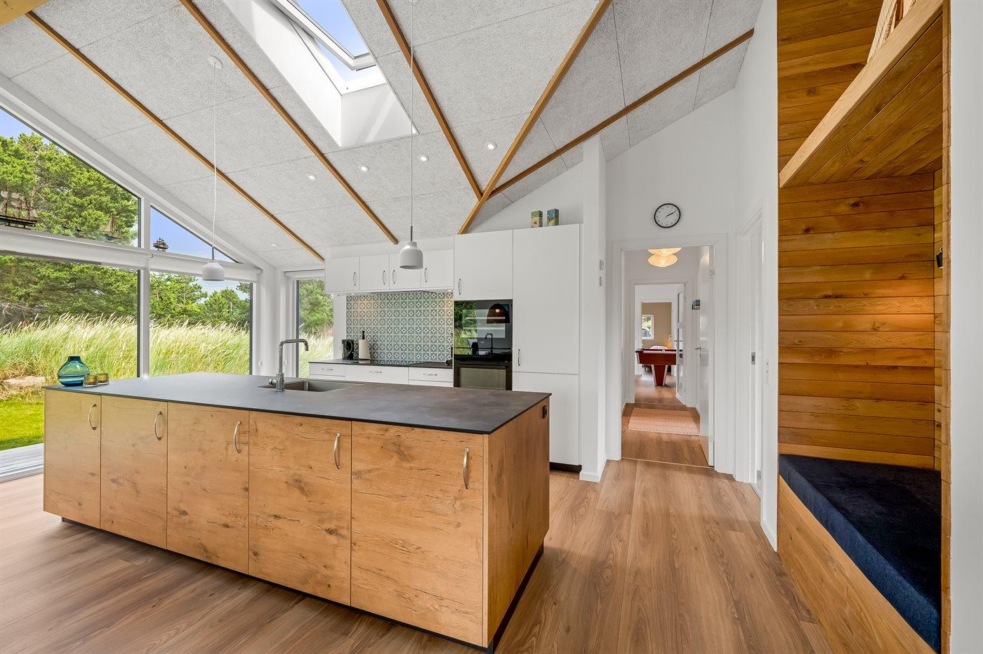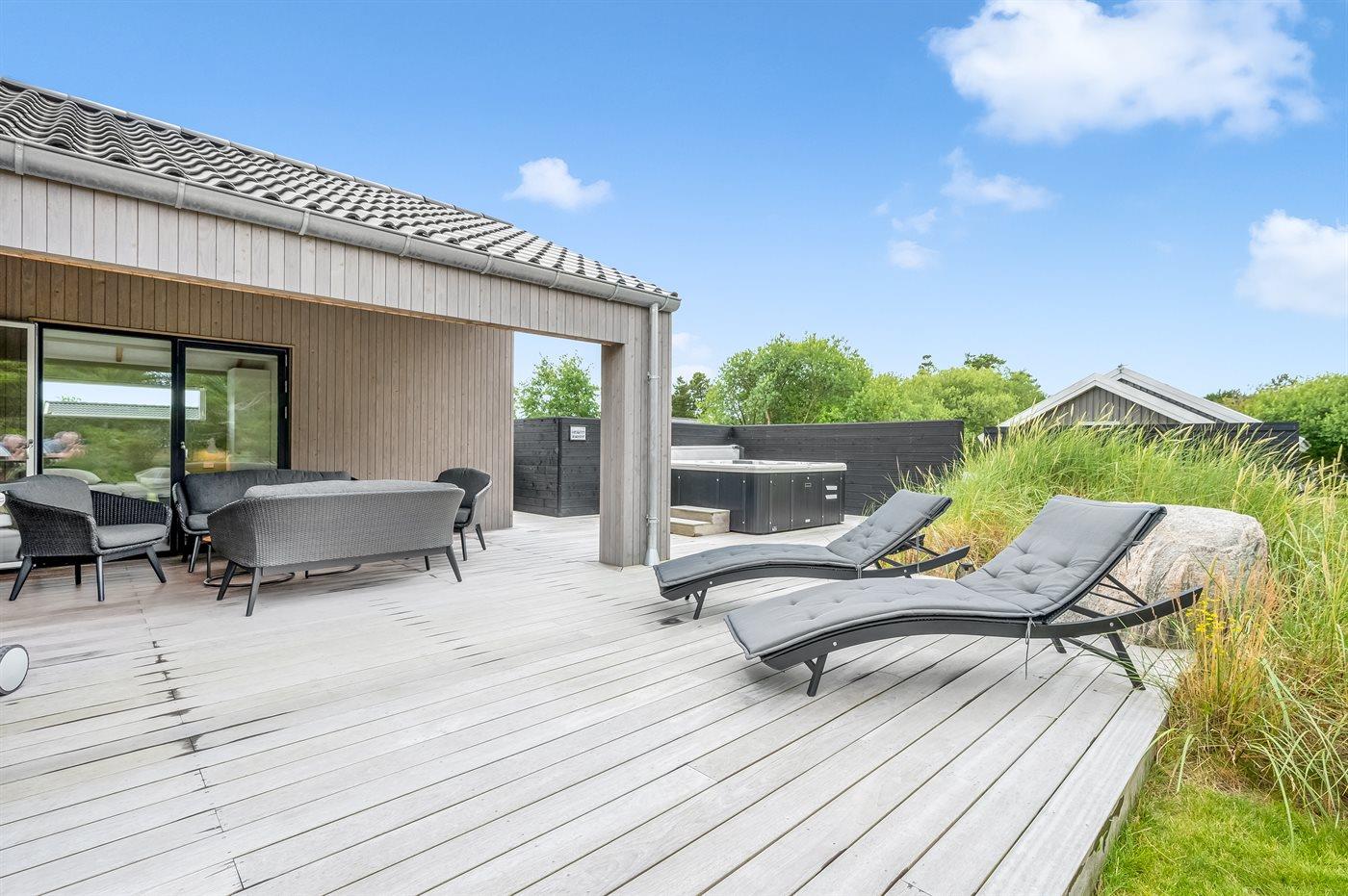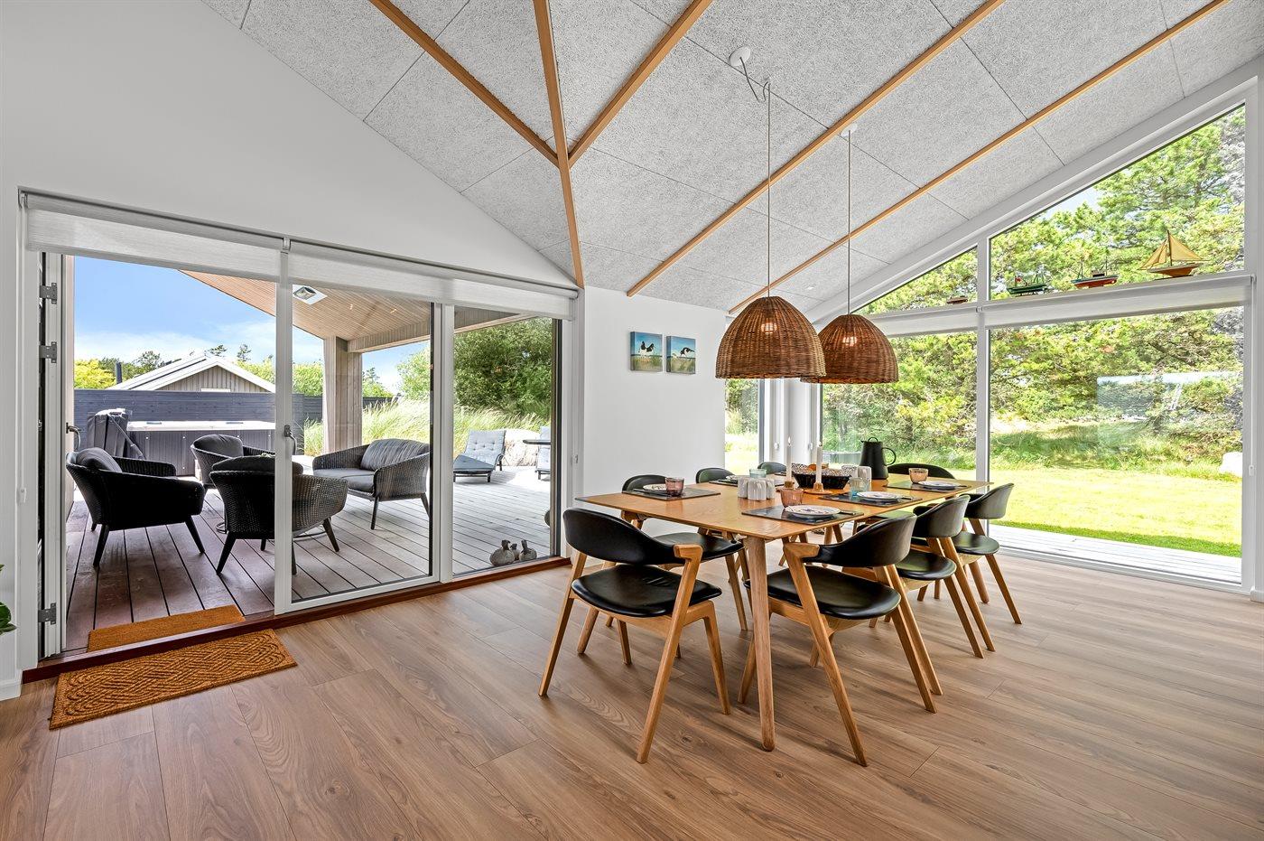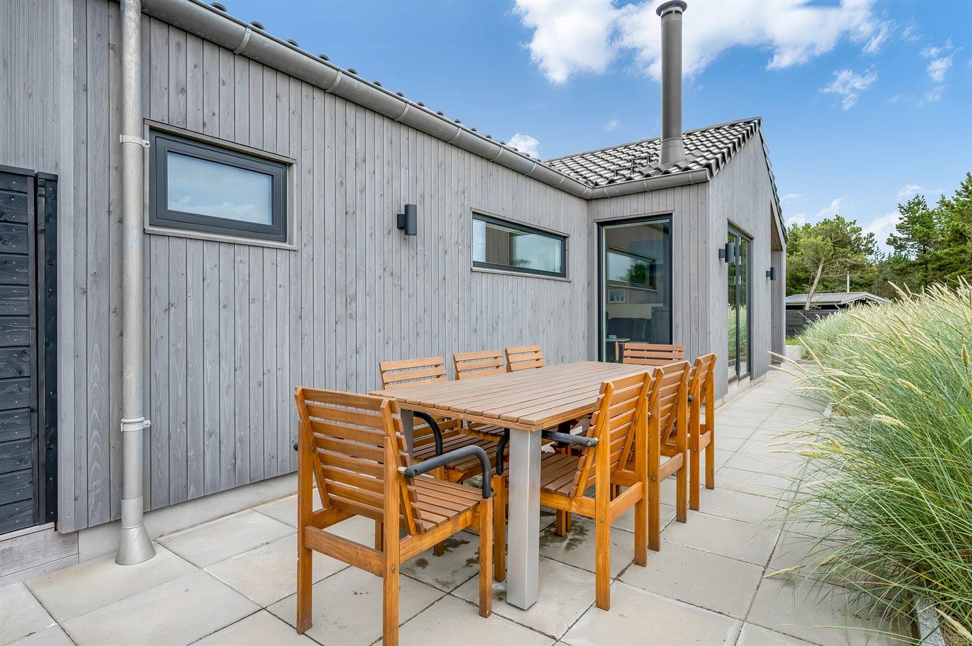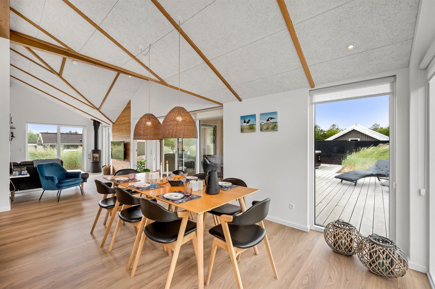 Ein besonders schönes Qualitätsferienhaus in Blåvand, das zu einem schönen, entspannten Familienurlaub einlädt. Das Naturgrundstück ist 1800 m² groß und ruhig gelegen. Das Haus weist eine besonders tolle Ausstattung auf. Wenn Sie gern Zeit im Freien verbringen, stehen Ihnen eine Außenküche mit Grill und eine Außendusche zur Verfügung. Alternativ bietet sich ein Saunagang mit Aussicht auf die umliegende Natur an. Dank des Außenlichts auf der Holzterrasse lassen sich die Tage etwas verlängern. Auf der überdachten Terrasse sorgen Infrarot-Terrassenwärmer für eine angenehme Wärme, die zum Genießen eines temperierten Glas Weins aus dem Weinkühler einlädt. Während des abendlichen Besuchs im Outdoor-Whirlpool haben Sie ganzjährig Blick auf die urige Fichte, die abends beleuchtet werden kann. Bis zum Meer sind es 1800 m. Das nächste Geschäft liegt mit 800 m Entfernung in Laufweite. Das Ferienhaus eignet sich für 8 Personen sowie 1 Kind bis zu 3 Jahren. Die Ferienunterkunft wurde 2021 erbaut und verfügt über eine Fläche von 170 m². Die Ferienunterkunft ist mit 1 energiesparenden Wärmepumpe ausgestattet. Die gesamte Ferienunterkunft verfügt über Fußbodenheizung. Die Küche ist mit einem Kühlschrank, Induktionskochfeld, Backofen, Mikrowelle, Weinkühler und Spülmaschine ausgestattet. Die Ferienunterkunft hat einen separaten Waschraum mit Waschmaschine, Trockner und Tiefkühler mit 50 l Kapazität. Zudem gibt es einen Kamin. Für die ganz Kleinen ist 1 Kinderstuhl, eine Schaukel und ein Sandkasten vorhanden. Im Aktivitätsraum können Sie Pool, Tischtennis und Shuffleboard spielen. Insgesamt gibt es 4 Schlafzimmer. Die Schlafplätze verteilen sich wie folgt: 6 Schlafplätze in Doppelbetten und 2 Schlafplätze in Einzelbetten. Zudem gibt es 1 Kinderbett. Es gibt 2 Badezimmer mit Duschnische, Fußbodenheizung, Nachtbeleuchtung und 2 Toiletten. In der Ferienunterkunft gibt es 2 Smart-TVs und 1 Bluetooth-Lautsprecher. Sie empfangen mindestens 4 dänische Sender. 1–3 schwedische Sender. 1–3 norwegische Sender. Mindestens 4 deutsche Sender. WLAN ist vorhanden. Es gibt einen Geräteraum und ein Carport mit Lademöglichkeit für E-Autos. Es gibt Parkmöglichkeiten an der Ferienunterkunft. Das Haus verfügt über eine Lüftungsanlage mit Pollenfilter. Wenn Ihnen der Sinn nach ungestörter Ruhe steht, lässt sich das WLAN im Eingangsbereich ausschalten.