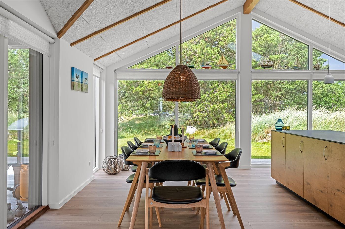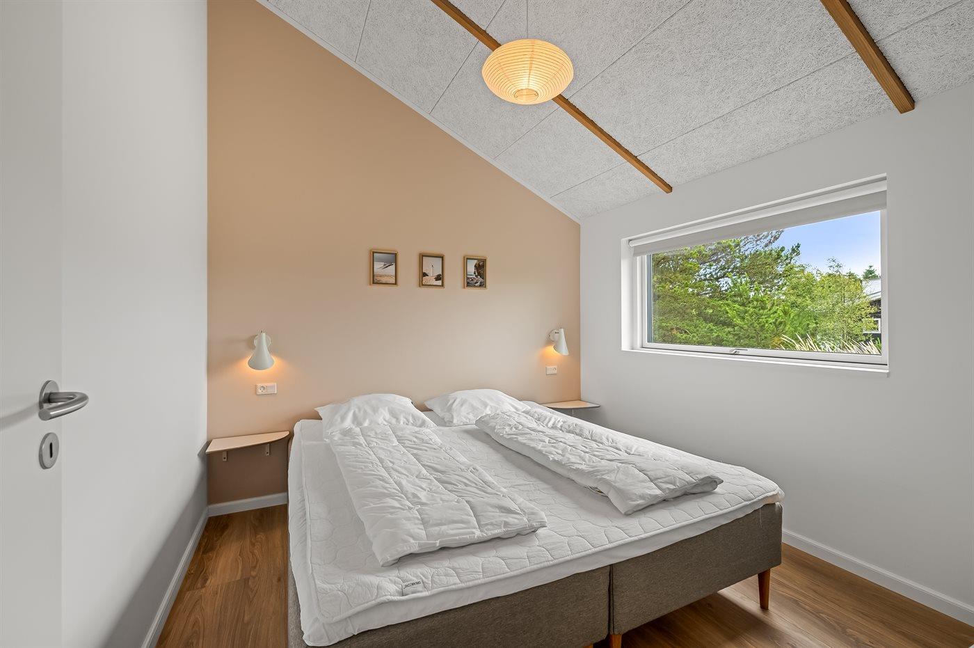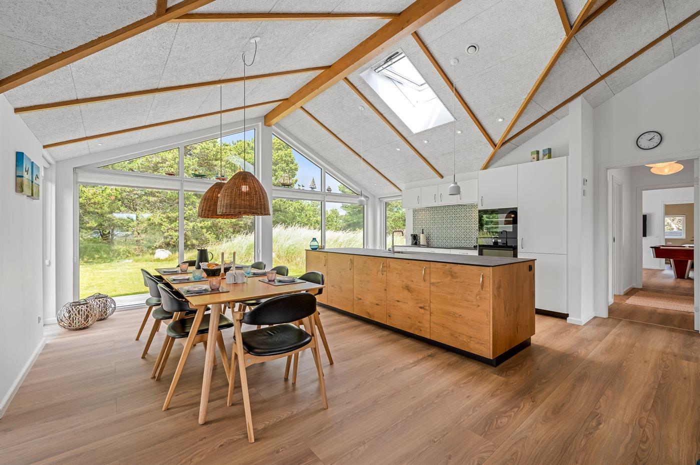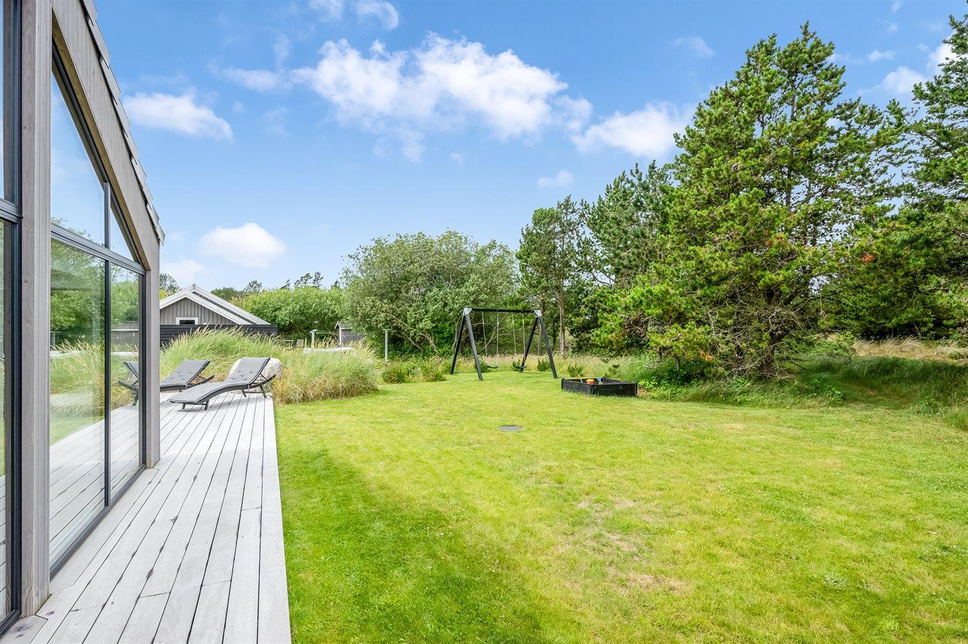 Ein besonders schönes Qualitätsferienhaus in Blåvand, das zu einem schönen, entspannten Familienurlaub einlädt. Das Naturgrundstück ist 1800 m² groß und ruhig gelegen. Das Haus weist eine besonders tolle Ausstattung auf. Wenn Sie gern Zeit im Freien verbringen, stehen Ihnen eine Außenküche mit Grill und eine Außendusche zur Verfügung. Alternativ bietet sich ein Saunagang mit Aussicht auf die umliegende Natur an. Dank des Außenlichts auf der Holzterrasse lassen sich die Tage etwas verlängern. Auf der überdachten Terrasse sorgen Infrarot-Terrassenwärmer für eine angenehme Wärme, die zum Genießen eines temperierten Glas Weins aus dem Weinkühler einlädt. Während des abendlichen Besuchs im Outdoor-Whirlpool haben Sie ganzjährig Blick auf die urige Fichte, die abends beleuchtet werden kann. Bis zum Meer sind es 1800 m. Das nächste Geschäft liegt mit 800 m Entfernung in Laufweite. Das Ferienhaus eignet sich für 8 Personen sowie 1 Kind bis zu 3 Jahren. Die Ferienunterkunft wurde 2021 erbaut und verfügt über eine Fläche von 170 m². Die Ferienunterkunft ist mit 1 energiesparenden Wärmepumpe ausgestattet. Die gesamte Ferienunterkunft verfügt über Fußbodenheizung. Die Küche ist mit einem Kühlschrank, Induktionskochfeld, Backofen, Mikrowelle, Weinkühler und Spülmaschine ausgestattet. Die Ferienunterkunft hat einen separaten Waschraum mit Waschmaschine, Trockner und Tiefkühler mit 50 l Kapazität. Zudem gibt es einen Kamin. Für die ganz Kleinen ist 1 Kinderstuhl, eine Schaukel und ein Sandkasten vorhanden. Im Aktivitätsraum können Sie Pool, Tischtennis und Shuffleboard spielen. Insgesamt gibt es 4 Schlafzimmer. Die Schlafplätze verteilen sich wie folgt: 6 Schlafplätze in Doppelbetten und 2 Schlafplätze in Einzelbetten. Zudem gibt es 1 Kinderbett. Es gibt 2 Badezimmer mit Duschnische, Fußbodenheizung, Nachtbeleuchtung und 2 Toiletten. In der Ferienunterkunft gibt es 2 Smart-TVs und 1 Bluetooth-Lautsprecher. Sie empfangen mindestens 4 dänische Sender. 1–3 schwedische Sender. 1–3 norwegische Sender. Mindestens 4 deutsche Sender. WLAN ist vorhanden. Es gibt einen Geräteraum und ein Carport mit Lademöglichkeit für E-Autos. Es gibt Parkmöglichkeiten an der Ferienunterkunft. Das Haus verfügt über eine Lüftungsanlage mit Pollenfilter. Wenn Ihnen der Sinn nach ungestörter Ruhe steht, lässt sich das WLAN im Eingangsbereich ausschalten.