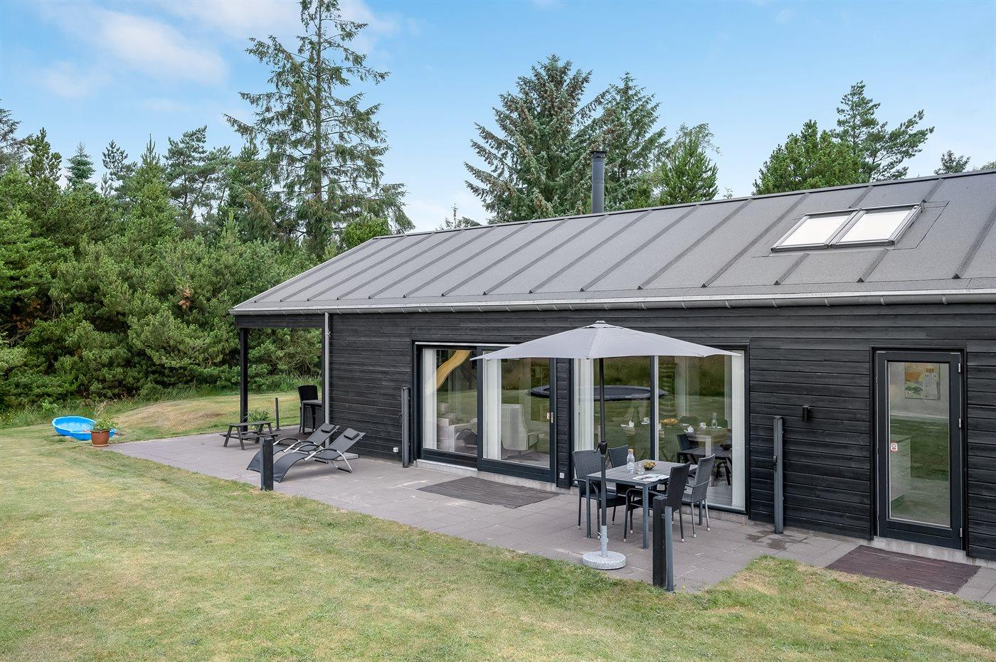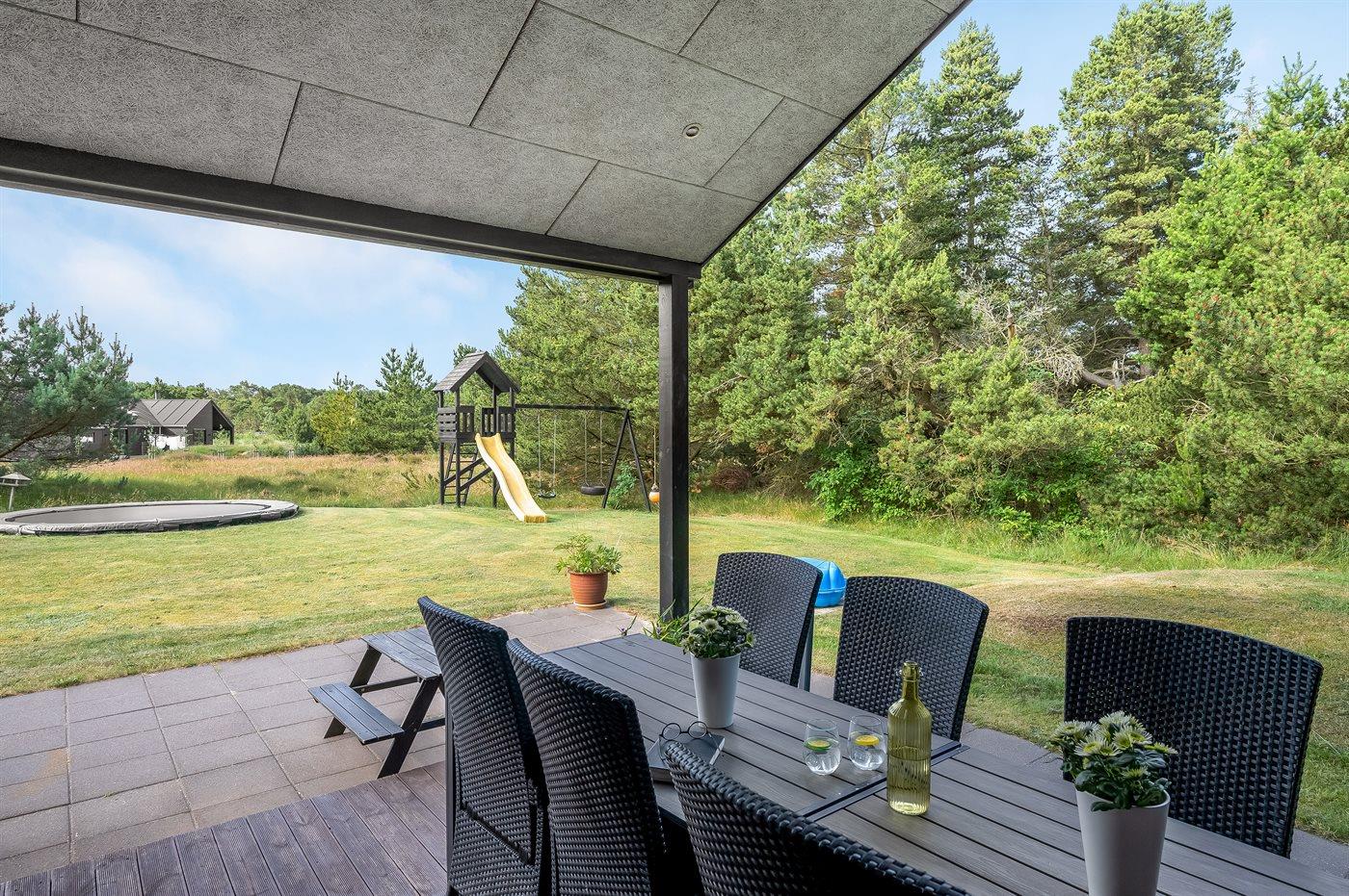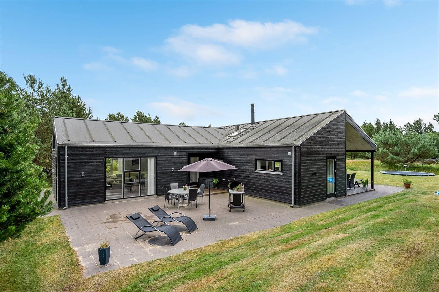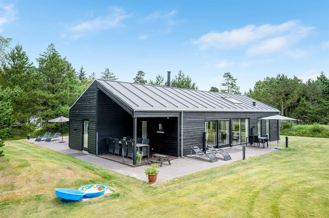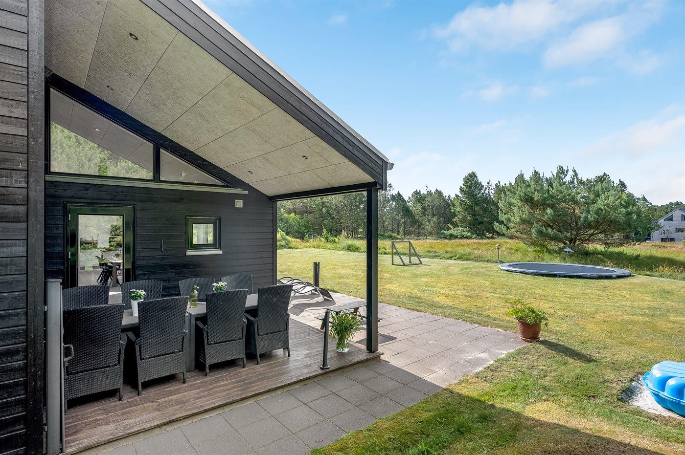 Geschmackvoll eingerichtetes Ferienhaus in modernem Design. Das Haus liegt auf einem großen Naturgrundstück in einem ruhigen und beliebten Urlaubsgebiet. Der wahrscheinlich beste Badestrand Dänemarks und das rege Geschäftsleben sind einen etwas längeren Spaziergang entfernt. Das Haus hat schöne Terrassen, von denen eine überdacht ist. Dort können Sie sich mit einem guten Buch erholen oder eine Mahlzeit im Freien genießen. An die Kinder wurde auch gedacht – auf dem Grundstück stehen gute Spielgeräte bereit. Freuen Sie sich auf einen gelungenen Urlaub in einem schönen Ferienhaus!