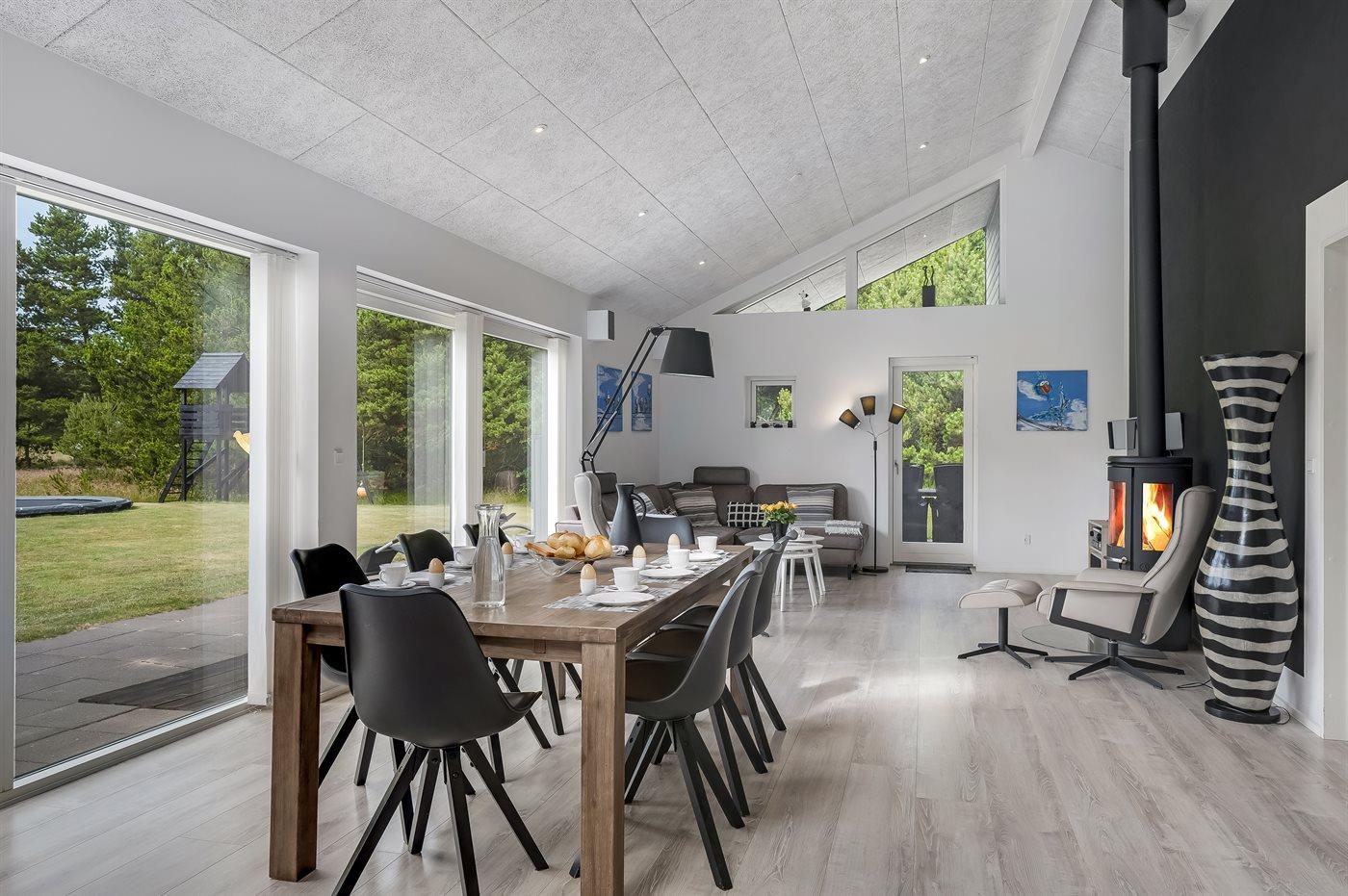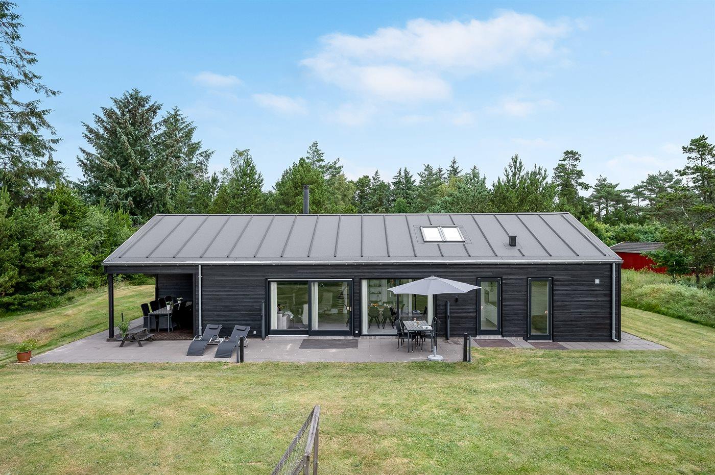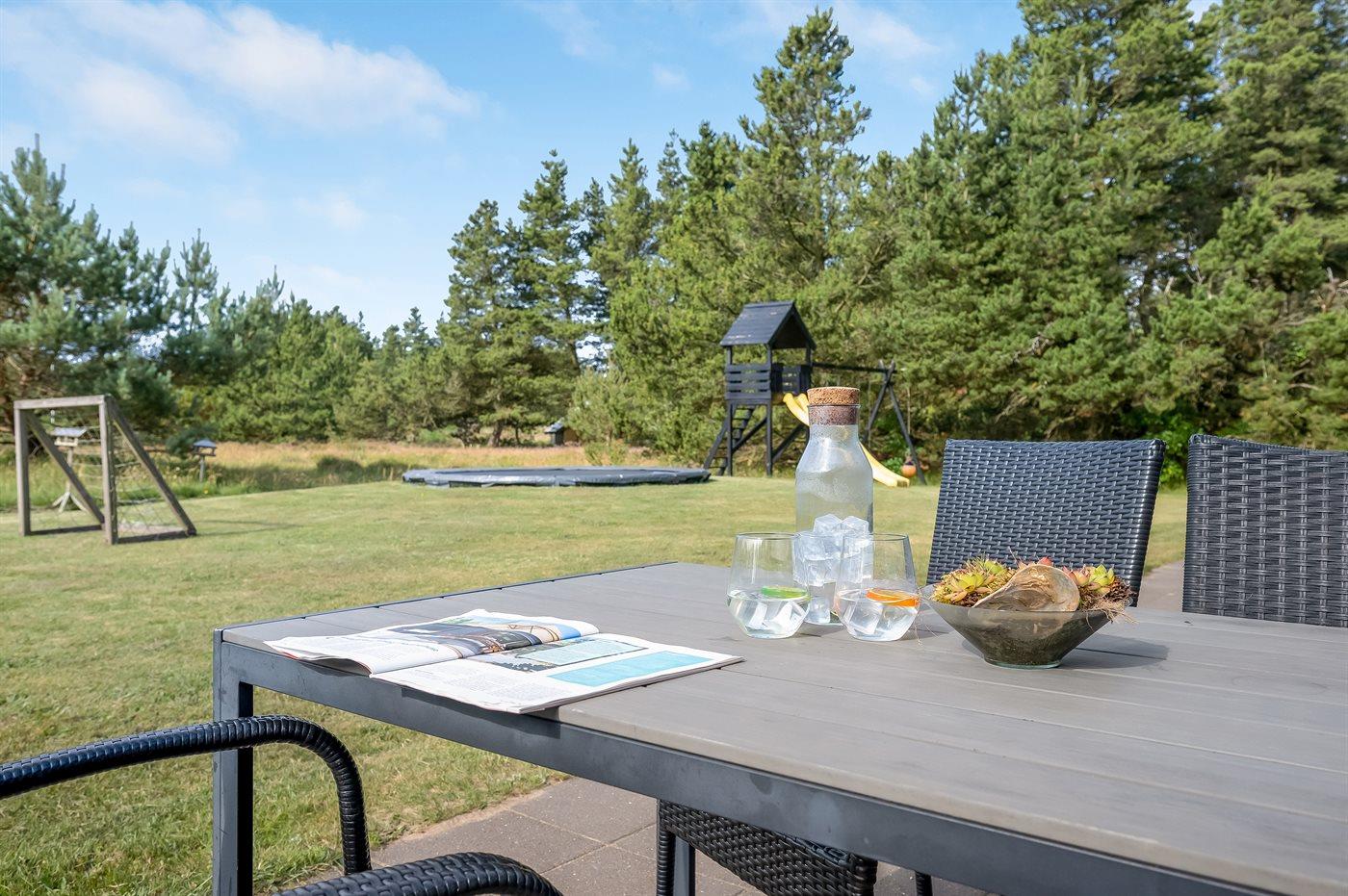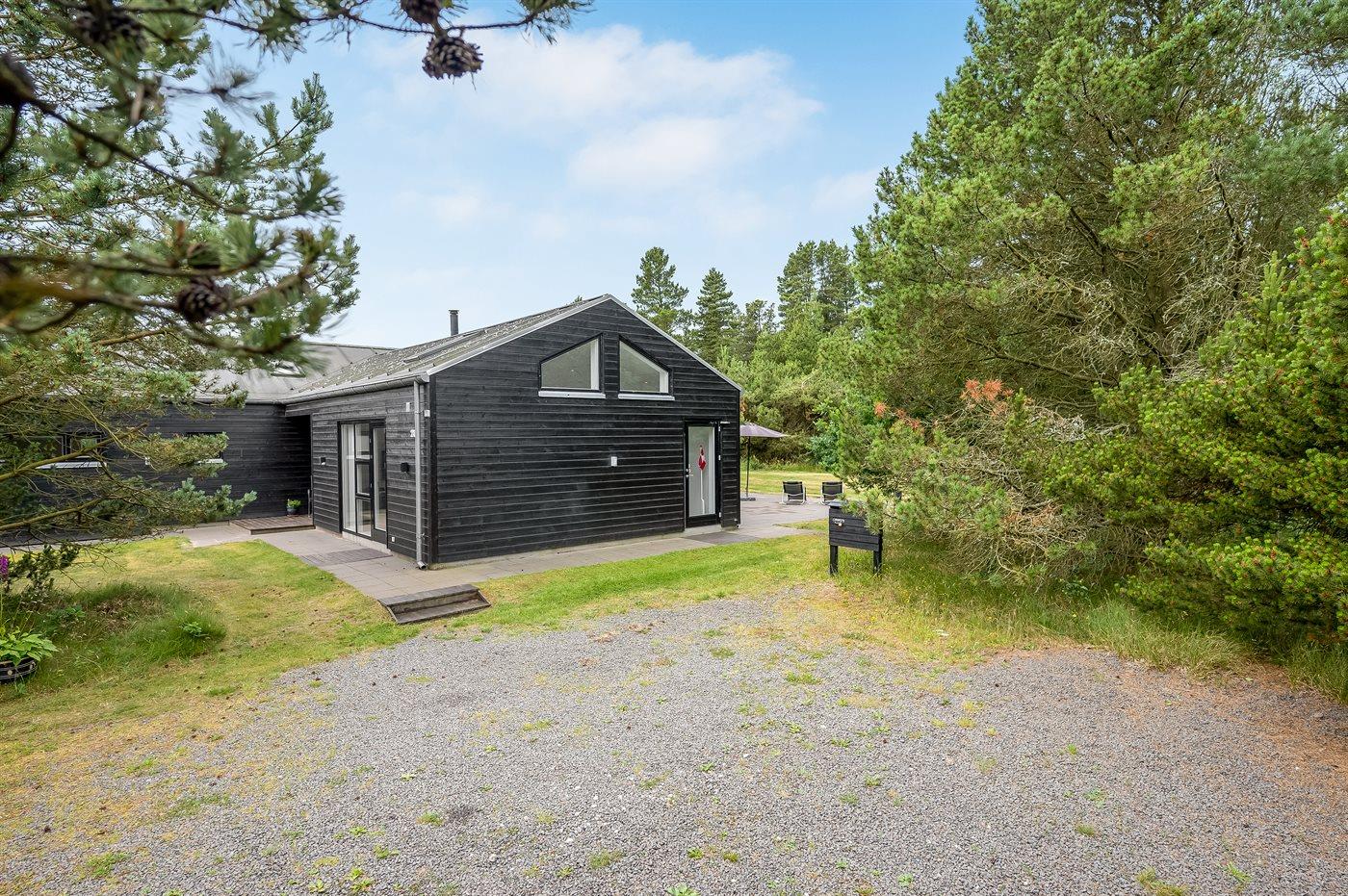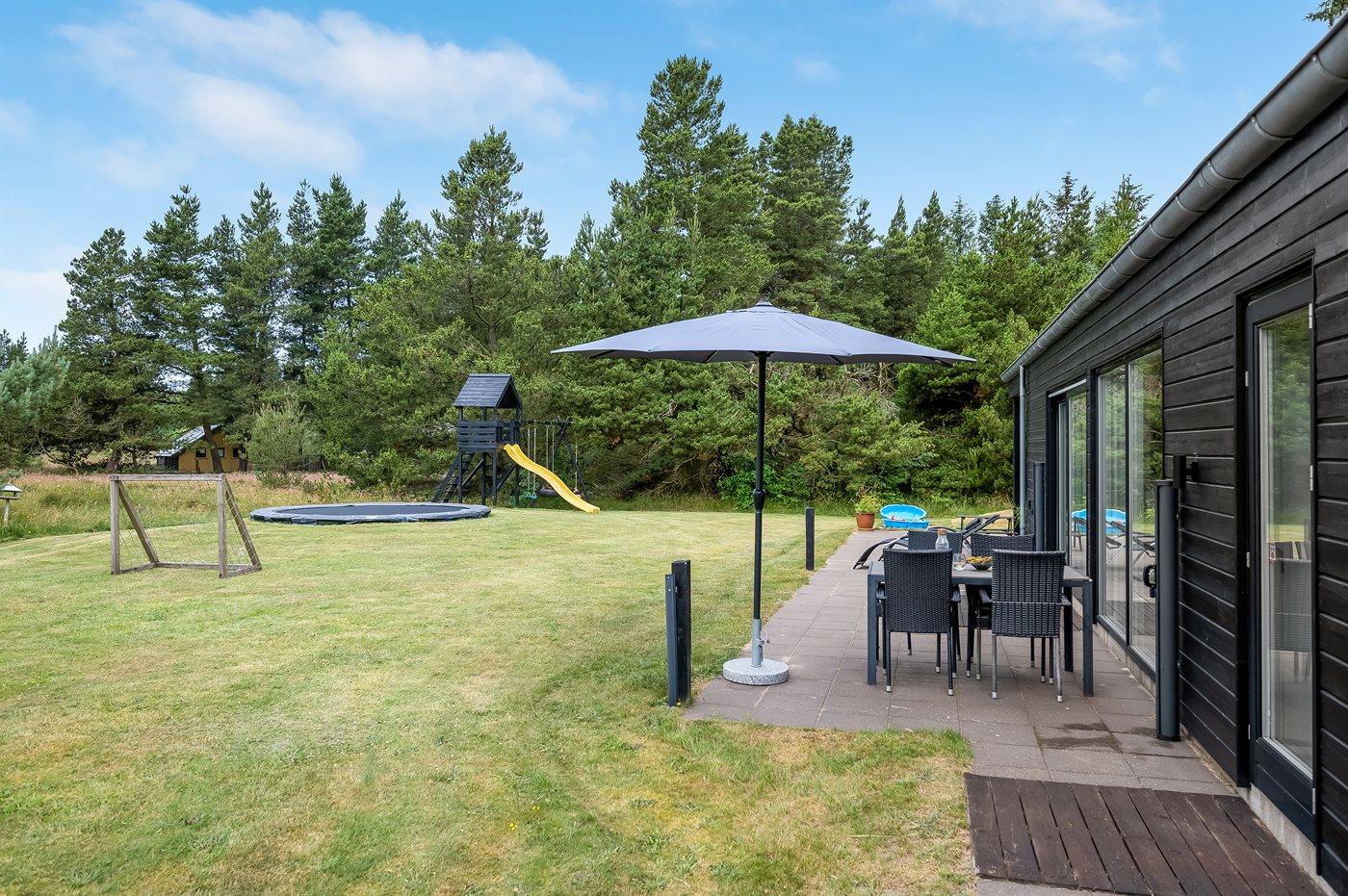 Geschmackvoll eingerichtetes Ferienhaus in modernem Design. Das Haus liegt auf einem großen Naturgrundstück in einem ruhigen und beliebten Urlaubsgebiet. Der wahrscheinlich beste Badestrand Dänemarks und das rege Geschäftsleben sind einen etwas längeren Spaziergang entfernt. Das Haus hat schöne Terrassen, von denen eine überdacht ist. Dort können Sie sich mit einem guten Buch erholen oder eine Mahlzeit im Freien genießen. An die Kinder wurde auch gedacht – auf dem Grundstück stehen gute Spielgeräte bereit. Freuen Sie sich auf einen gelungenen Urlaub in einem schönen Ferienhaus!