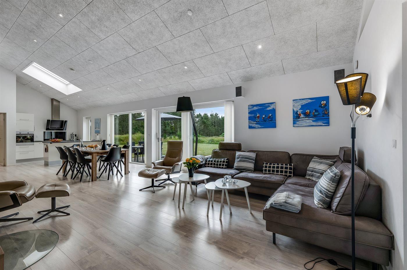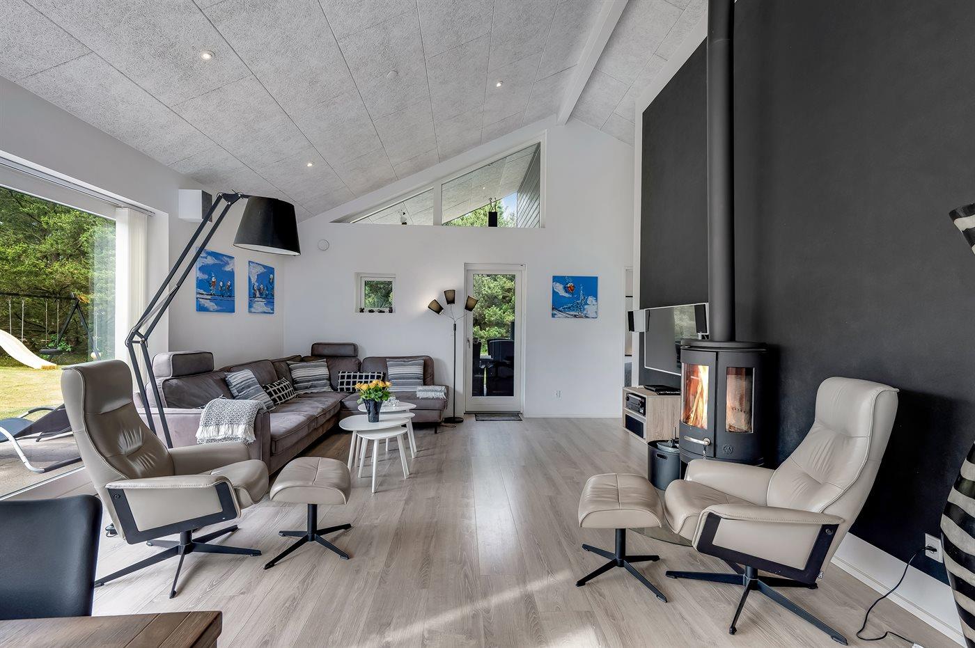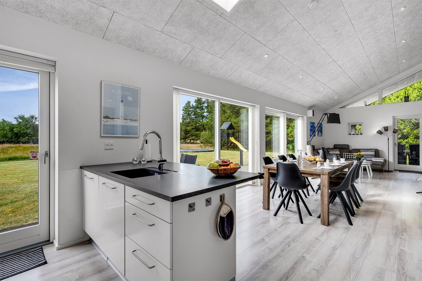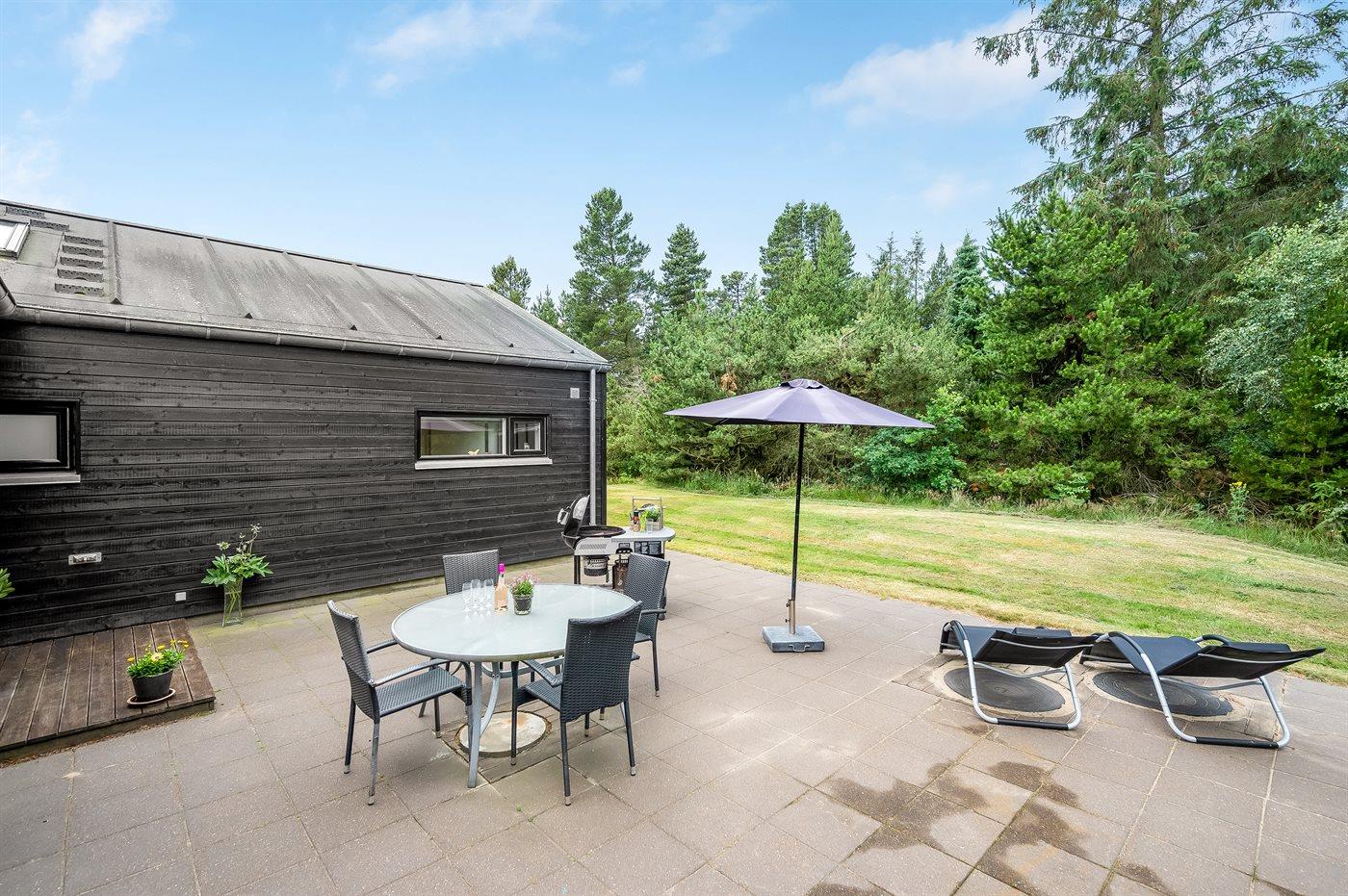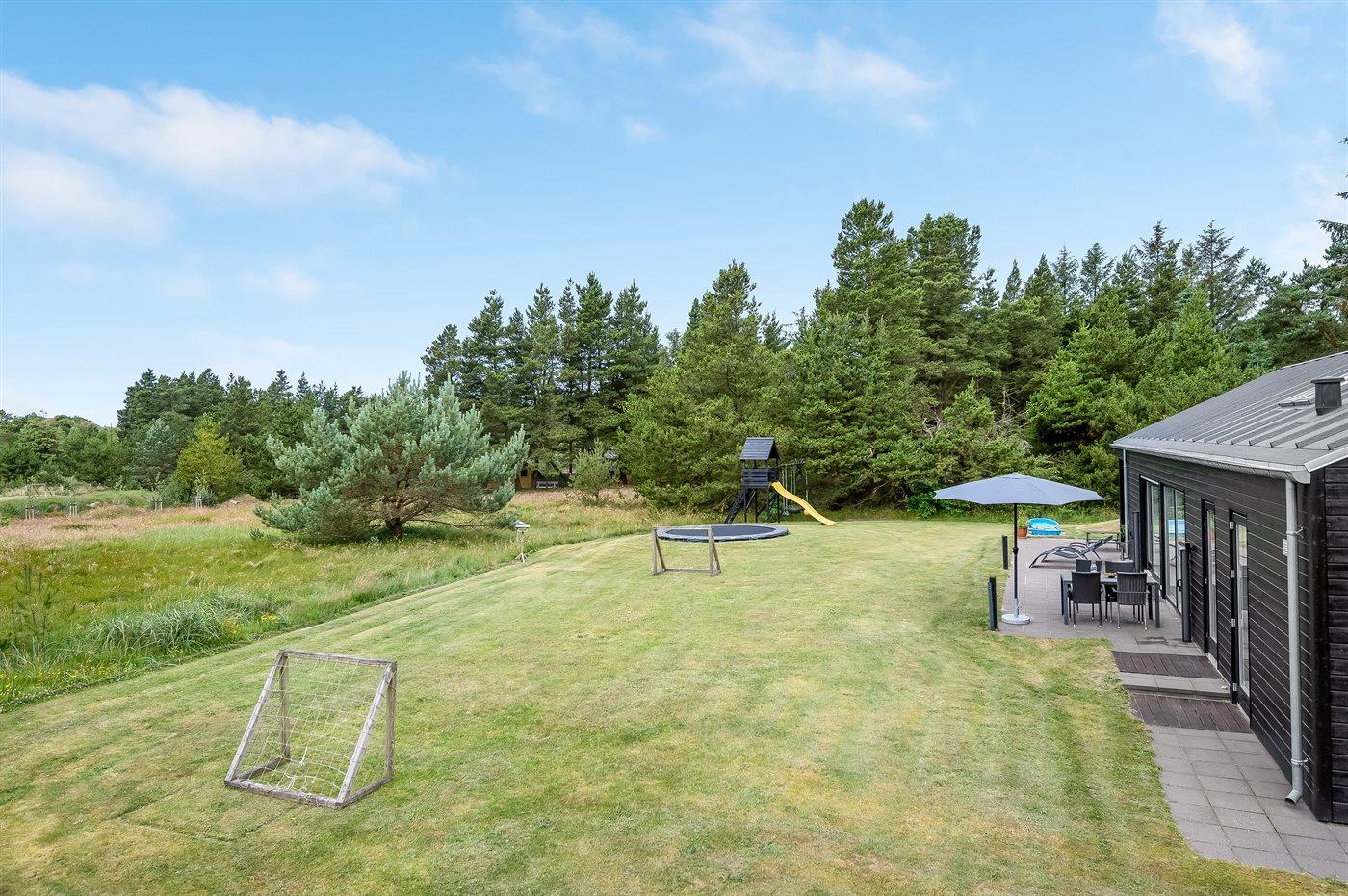 Geschmackvoll eingerichtetes Ferienhaus in modernem Design. Das Haus liegt auf einem großen Naturgrundstück in einem ruhigen und beliebten Urlaubsgebiet. Der wahrscheinlich beste Badestrand Dänemarks und das rege Geschäftsleben sind einen etwas längeren Spaziergang entfernt. Das Haus hat schöne Terrassen, von denen eine überdacht ist. Dort können Sie sich mit einem guten Buch erholen oder eine Mahlzeit im Freien genießen. An die Kinder wurde auch gedacht – auf dem Grundstück stehen gute Spielgeräte bereit. Freuen Sie sich auf einen gelungenen Urlaub in einem schönen Ferienhaus!