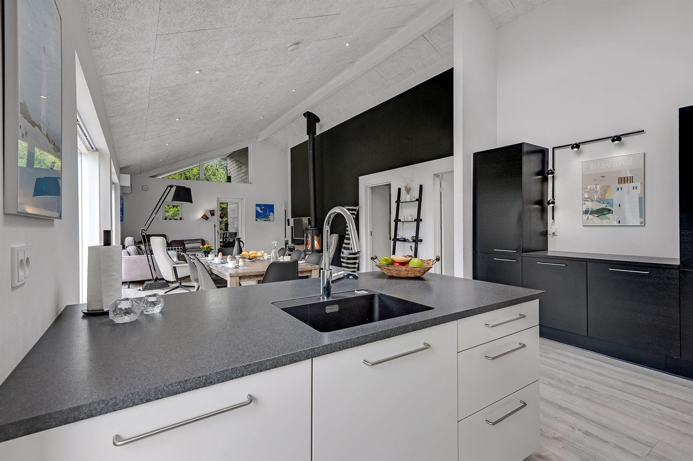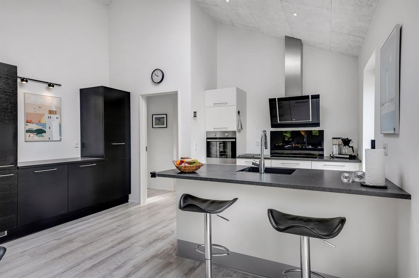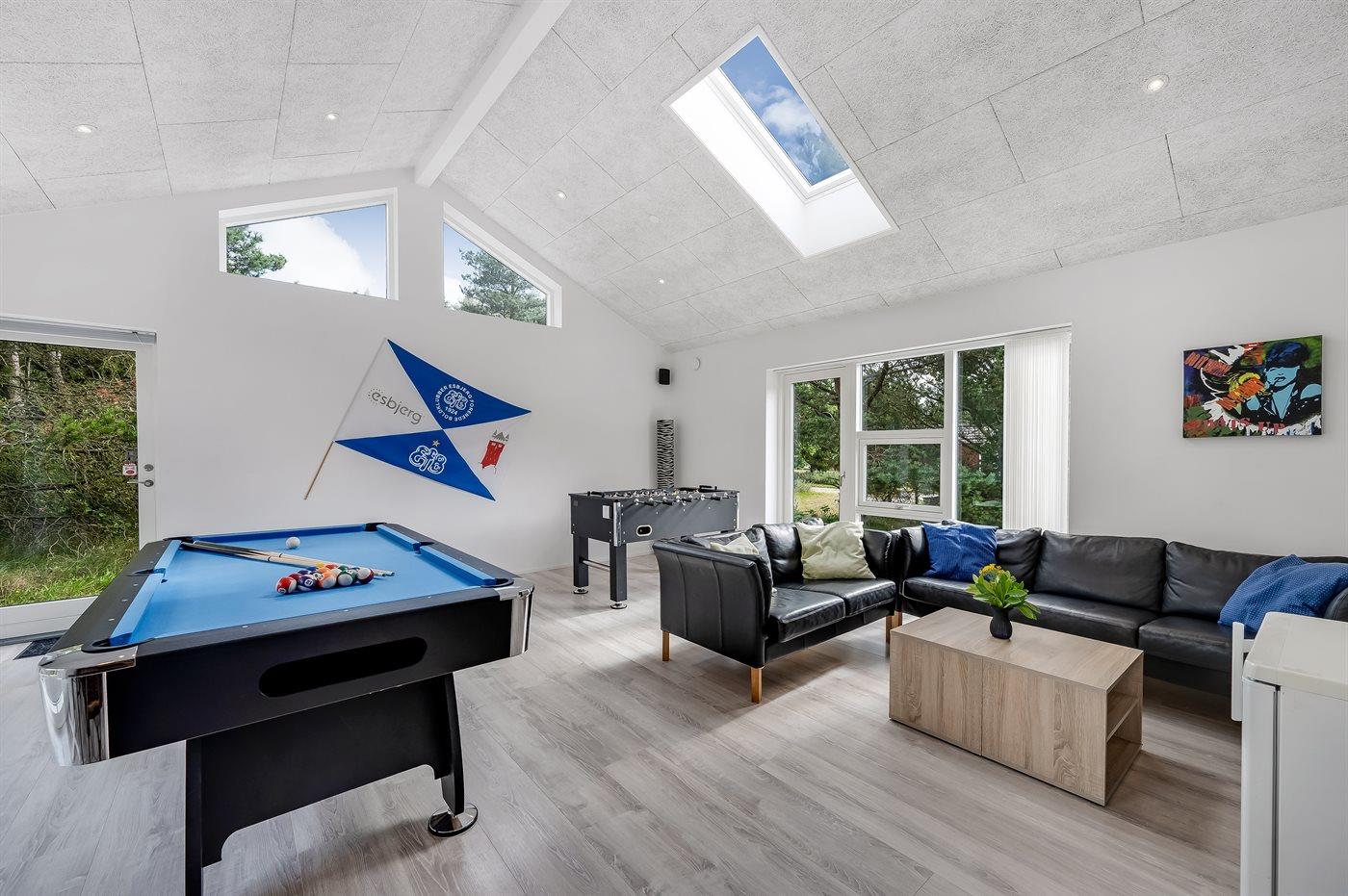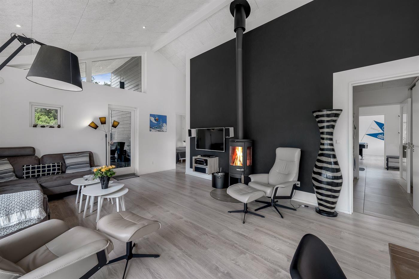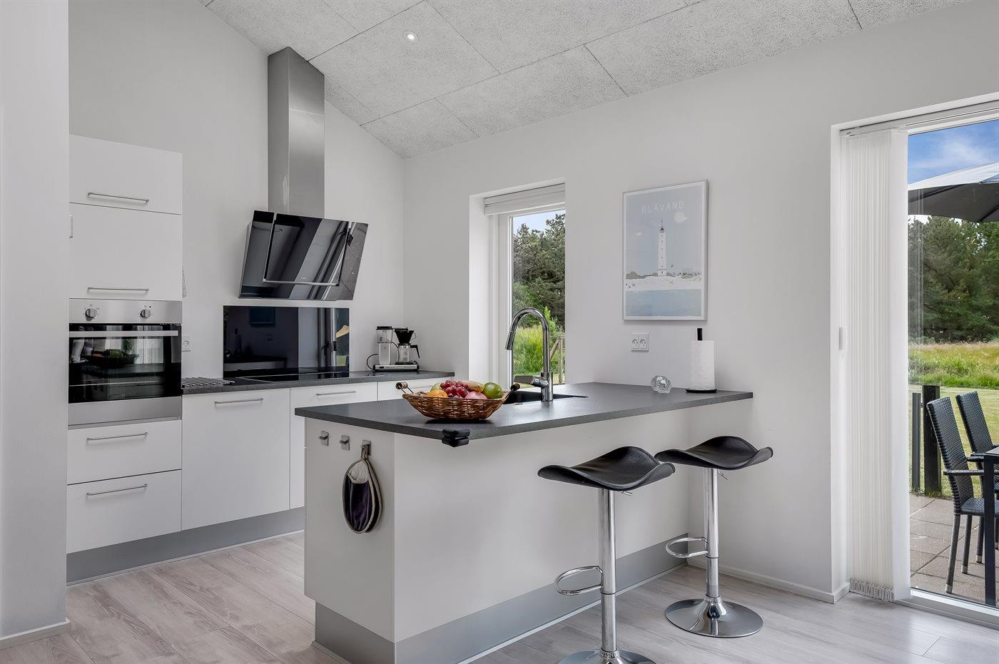 Geschmackvoll eingerichtetes Ferienhaus in modernem Design. Das Haus liegt auf einem großen Naturgrundstück in einem ruhigen und beliebten Urlaubsgebiet. Der wahrscheinlich beste Badestrand Dänemarks und das rege Geschäftsleben sind einen etwas längeren Spaziergang entfernt. Das Haus hat schöne Terrassen, von denen eine überdacht ist. Dort können Sie sich mit einem guten Buch erholen oder eine Mahlzeit im Freien genießen. An die Kinder wurde auch gedacht – auf dem Grundstück stehen gute Spielgeräte bereit. Freuen Sie sich auf einen gelungenen Urlaub in einem schönen Ferienhaus!