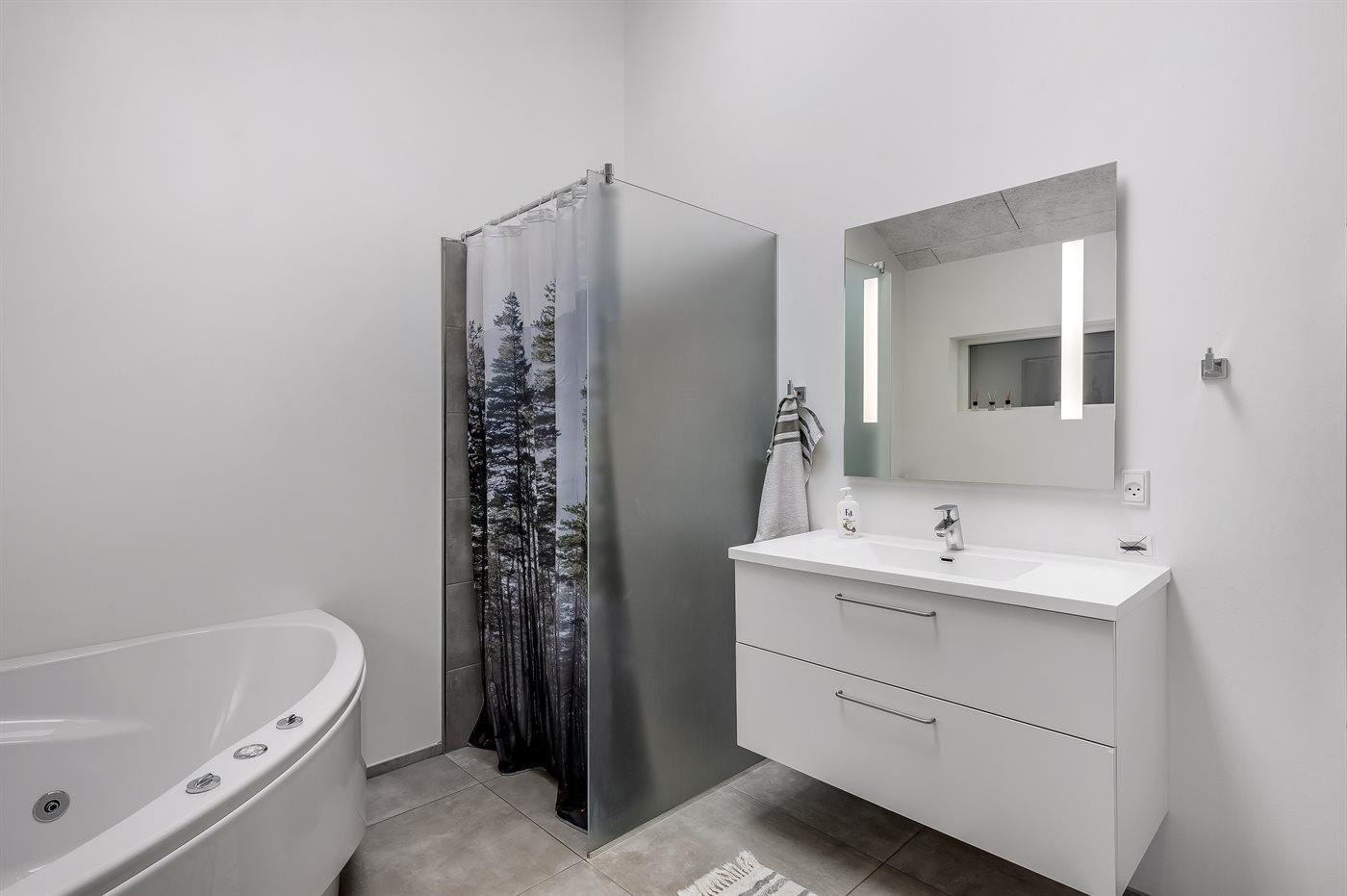 In beiden Badezimmern gibt es eine Toilette, eine Duschnische und Fußbodenheizung. Die Sauna und der Innenwhirlpool für 2 Personen laden zum Entspannen ein.