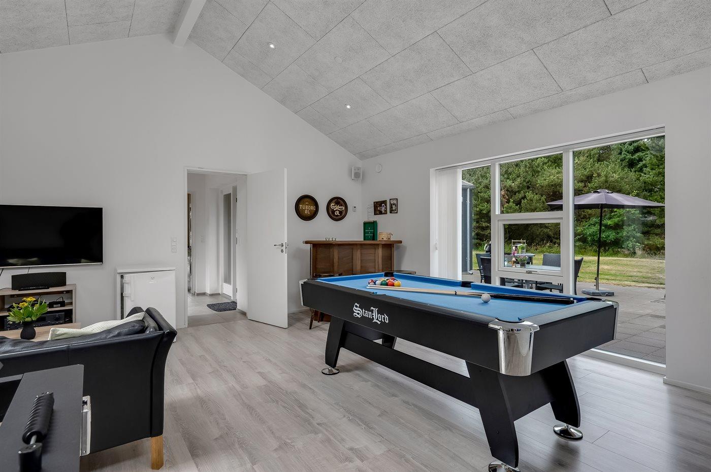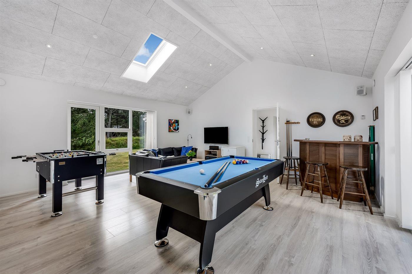 Der Aktivitätsraum enthält einen Poolbillardtisch, einen Tischfußballtisch, Shuffleboard, eine Surroundanlage und einen Kühlschrank mit Gefrierfach.