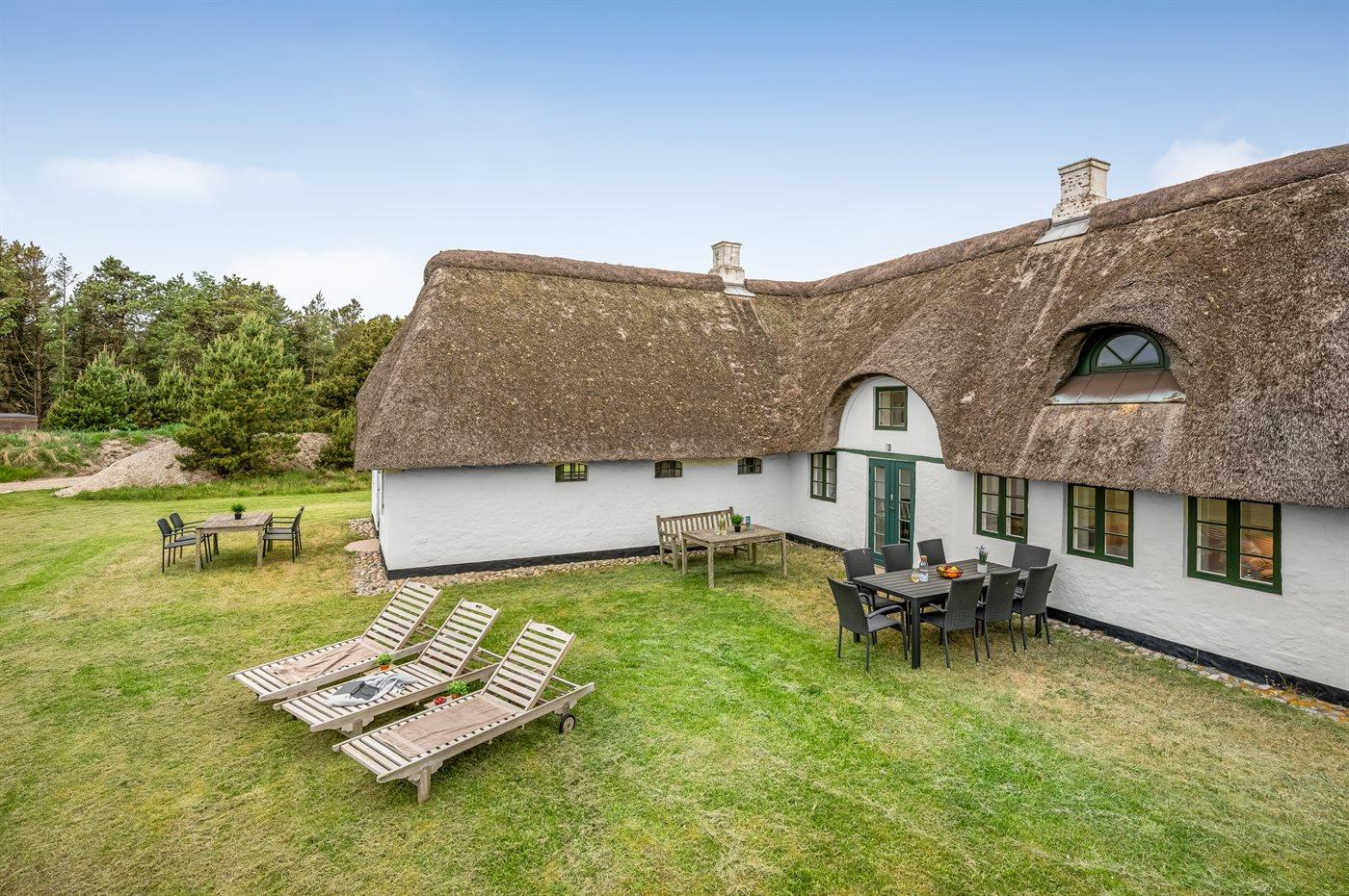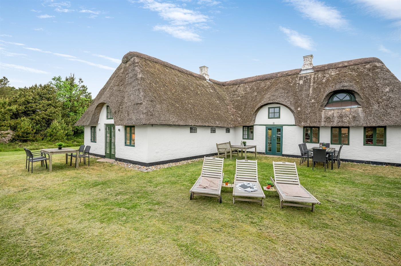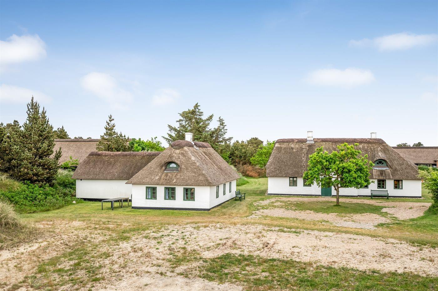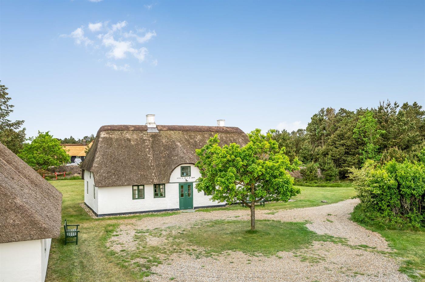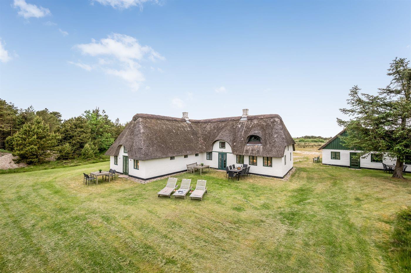 Das Hauptgebäude, das von Rasenflächen, Terrassen und windgeschützten Plätzen umgeben ist, besteht aus zwei Längen sowie einem L-förmigen Gästehaus, und die gesamte Wohnfläche beträgt etwa 300 m². Hier ist von klassischer und gemütlicher Nordsee-Atmosphäre und exquisitem ländlichen Stil die Rede. Im Laufe der Jahre 2004-2006 wurden beide Gebäude innen komplett renoviert, wobei die ursprünglichen Außenwände und Holzkonstruktionen aus Strandgut erhalten blieben. Alles innen ist zeitgemäß mit Fußbodenheizung, Ganzjahresisolierung, neuen Bädern und zwei neuen Küchen (eine im Hauptgebäude und eine im Gästehaus). Alles ist im ursprünglichen Stil gehalten, ebenso wie die Außenfassade und das Reetdach, das von der Gemeinde Varde als erhaltenswert eingestuft wurde. Von den 16 Schlafplätzen befindet sich einer in einem Alkovem und zwei befinden sich in einem Zimmer, das man erreicht indem man ein anderes Schlafzimmer durchquert.