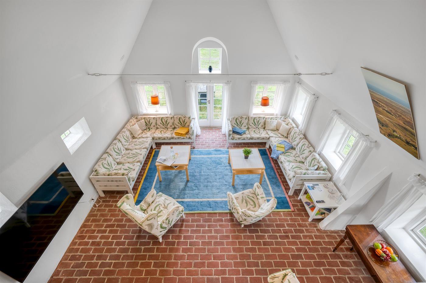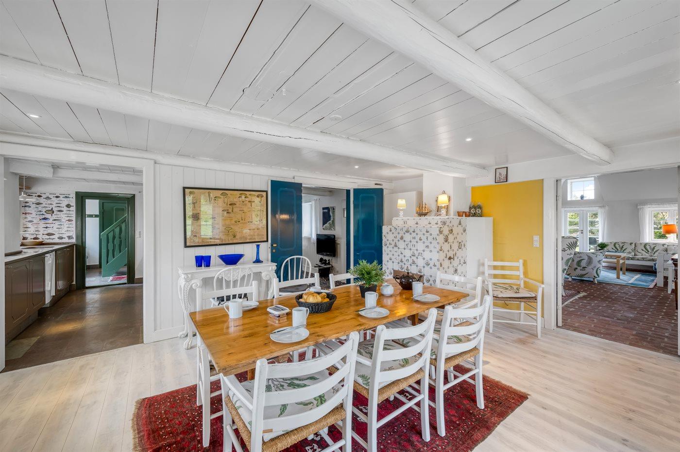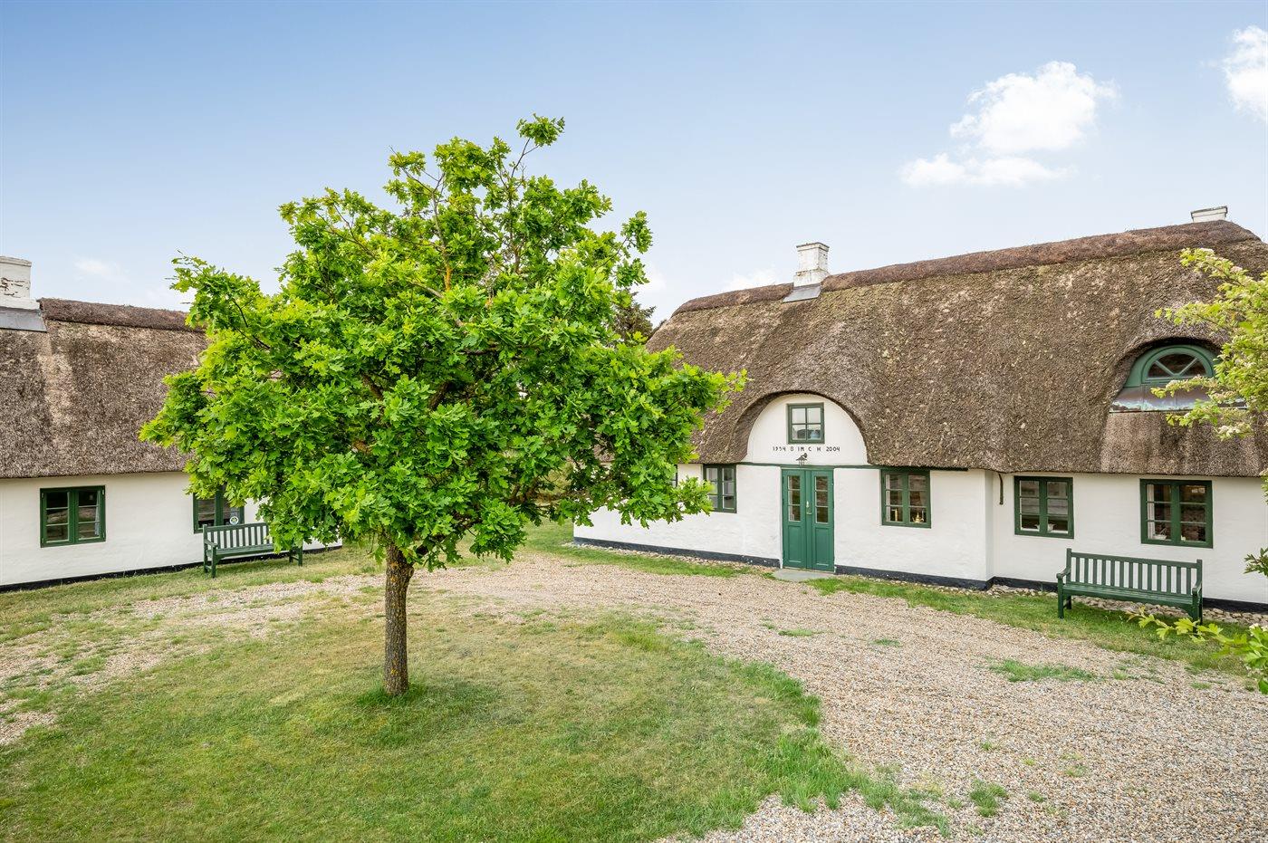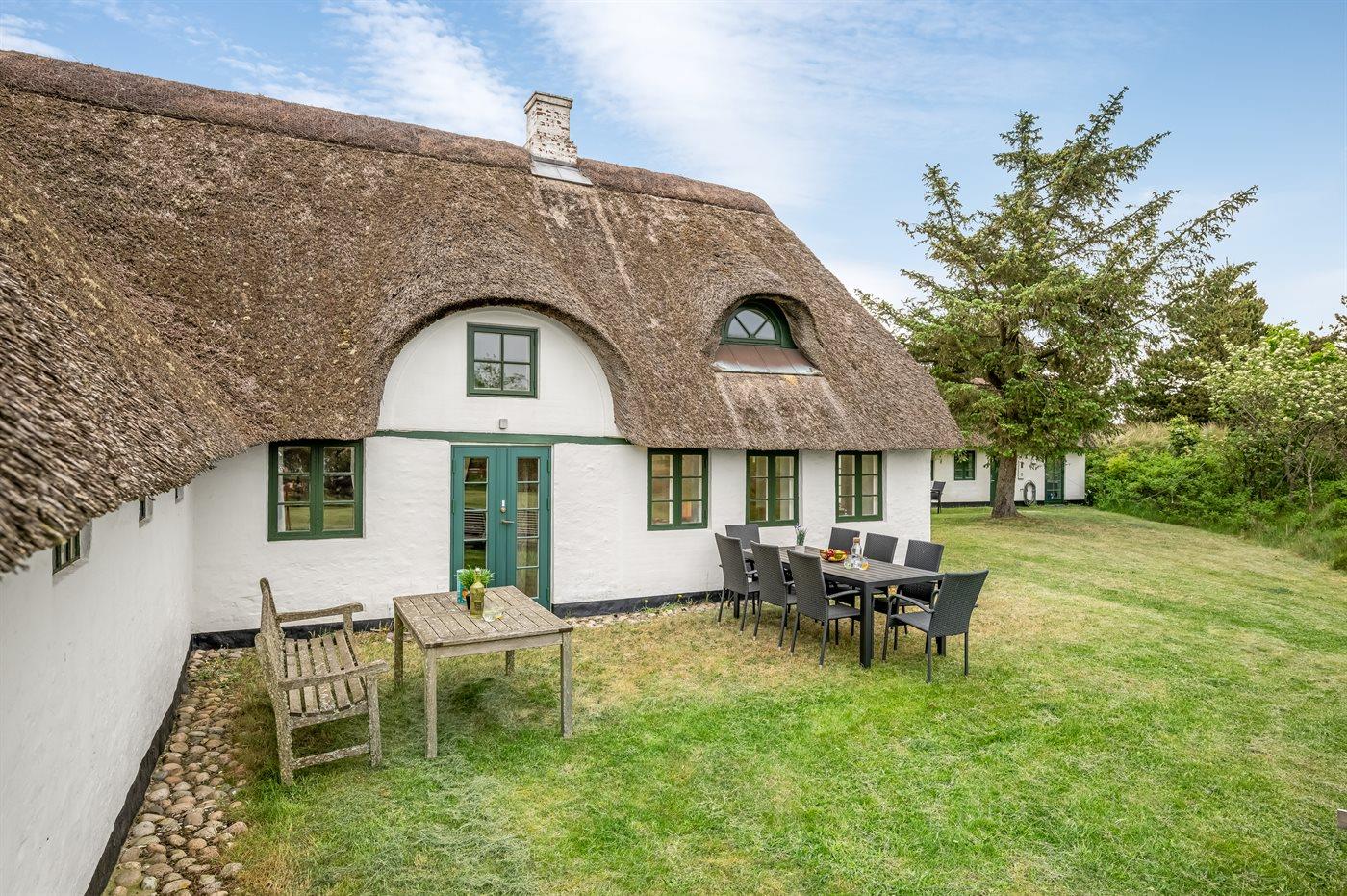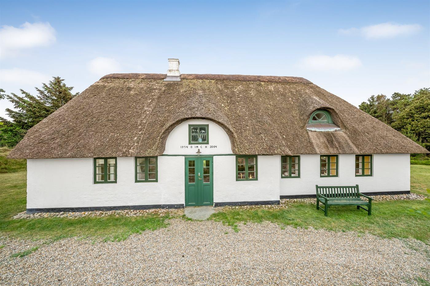 Das Hauptgebäude, das von Rasenflächen, Terrassen und windgeschützten Plätzen umgeben ist, besteht aus zwei Längen sowie einem L-förmigen Gästehaus, und die gesamte Wohnfläche beträgt etwa 300 m². Hier ist von klassischer und gemütlicher Nordsee-Atmosphäre und exquisitem ländlichen Stil die Rede. Im Laufe der Jahre 2004-2006 wurden beide Gebäude innen komplett renoviert, wobei die ursprünglichen Außenwände und Holzkonstruktionen aus Strandgut erhalten blieben. Alles innen ist zeitgemäß mit Fußbodenheizung, Ganzjahresisolierung, neuen Bädern und zwei neuen Küchen (eine im Hauptgebäude und eine im Gästehaus). Alles ist im ursprünglichen Stil gehalten, ebenso wie die Außenfassade und das Reetdach, das von der Gemeinde Varde als erhaltenswert eingestuft wurde. Von den 16 Schlafplätzen befindet sich einer in einem Alkovem und zwei befinden sich in einem Zimmer, das man erreicht indem man ein anderes Schlafzimmer durchquert.