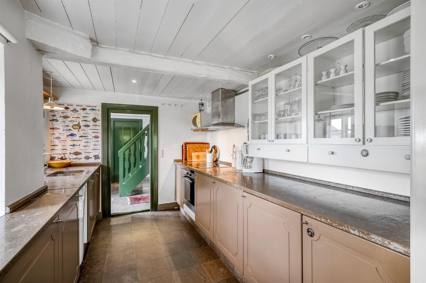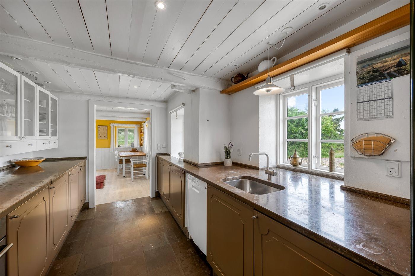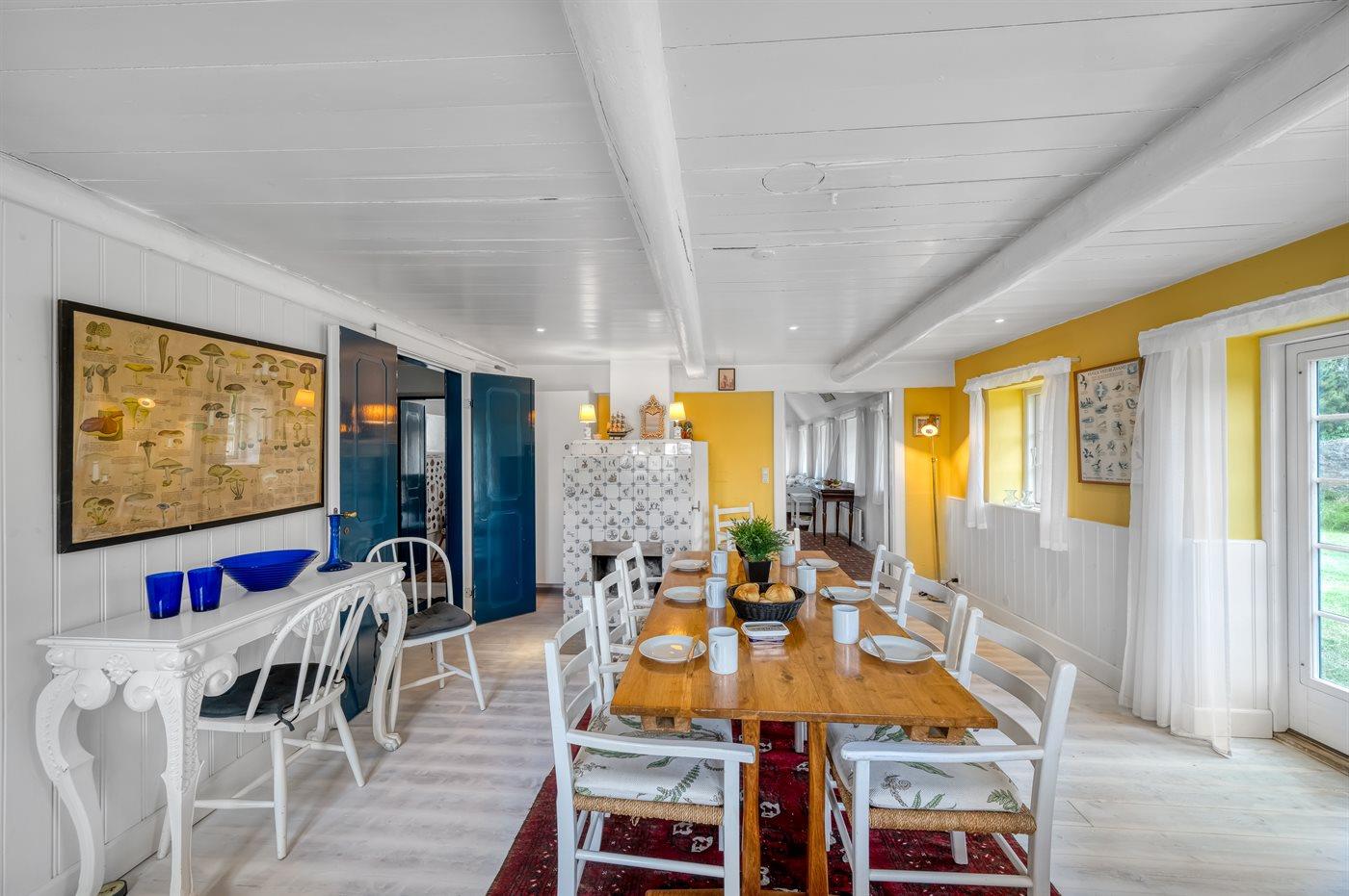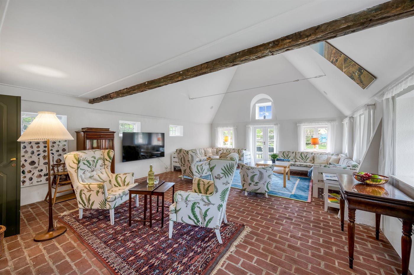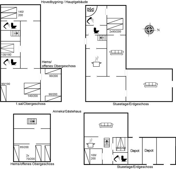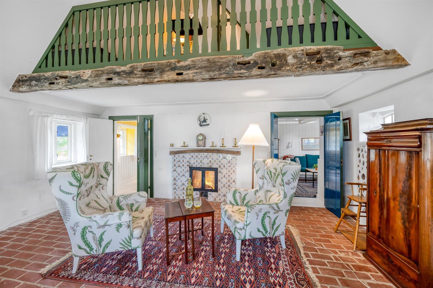 Das Hauptgebäude, das von Rasenflächen, Terrassen und windgeschützten Plätzen umgeben ist, besteht aus zwei Längen sowie einem L-förmigen Gästehaus, und die gesamte Wohnfläche beträgt etwa 300 m². Hier ist von klassischer und gemütlicher Nordsee-Atmosphäre und exquisitem ländlichen Stil die Rede. Im Laufe der Jahre 2004-2006 wurden beide Gebäude innen komplett renoviert, wobei die ursprünglichen Außenwände und Holzkonstruktionen aus Strandgut erhalten blieben. Alles innen ist zeitgemäß mit Fußbodenheizung, Ganzjahresisolierung, neuen Bädern und zwei neuen Küchen (eine im Hauptgebäude und eine im Gästehaus). Alles ist im ursprünglichen Stil gehalten, ebenso wie die Außenfassade und das Reetdach, das von der Gemeinde Varde als erhaltenswert eingestuft wurde. Von den 16 Schlafplätzen befindet sich einer in einem Alkovem und zwei befinden sich in einem Zimmer, das man erreicht indem man ein anderes Schlafzimmer durchquert.