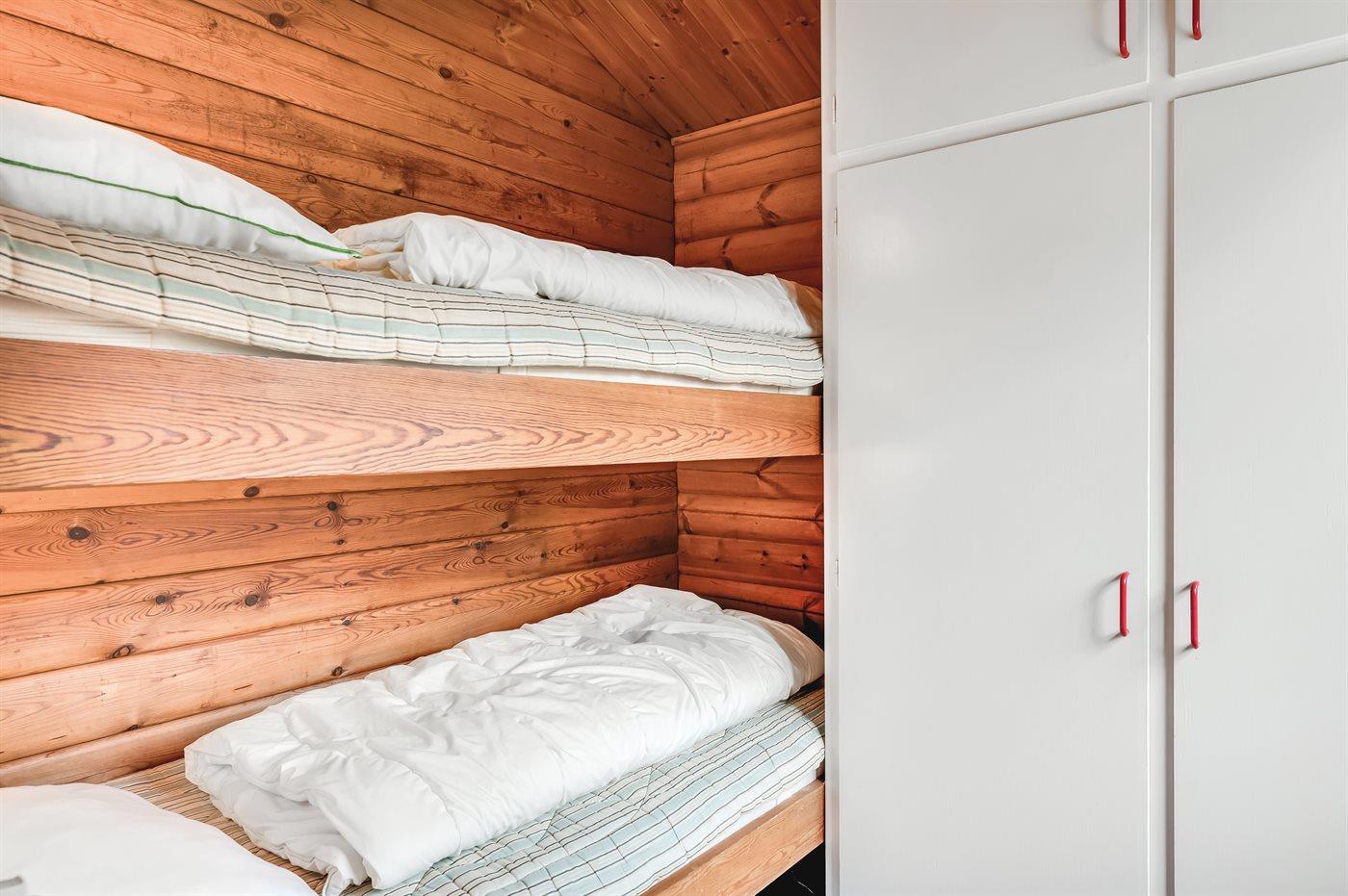 Die Schlafplätze verteilen sich auf 2 Schlafräume. 2 Schlafplätze in einem Doppelbett. 2 Schlafplätze in einem Etagenbett.